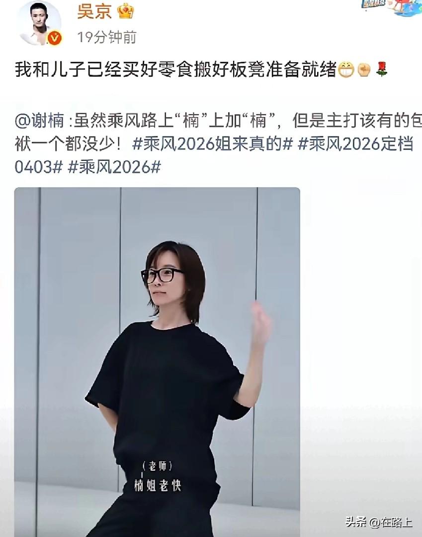 吴京谢楠突然双双发文,一个官宣上浪姐一个带娃应援,这波操作我给满分! 我刚刷到的时候还以为出啥事了,结果点开一看,好家伙,原来是谢楠官宣参加《乘风2026》了!关键是吴京的反应太逗了,直接转发说“我和儿子已经买好零食搬好板凳准备就绪”,还配了表情包,这哪是老公啊,这分明就是头号迷弟。结婚十一年了还能这么甜,真不是一般人能做到的。我看评论区都在说,吴京在外面是硬汉,回到家就是谢楠的头号粉丝,这种反差也太好嗑了吧!