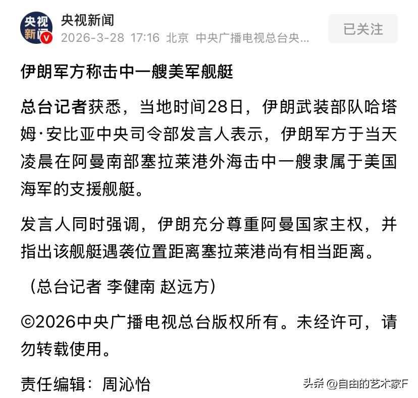 突发!波斯湾传来巨响,一艘美军支援舰被炸,特朗普高兴太早了 就在以色列军方暗自庆幸,把伊朗海军司令部一锅端的之后,3月28日,伊朗武装部队哈塔姆·安比亚中央司令部干了一件大事。 根据伊朗方面发布的通告显示,在3月28日凌晨,伊朗海军的导弹击中在阿曼南部塞拉莱港外海精的一艘美国海军支援舰艇。目前该军舰已经丧失了作战能力。 同时,伊朗人还刻意强调,他们尊重阿曼的国家主权,袭击位置远离港口,没有对港口造成危害。这样的消息瞬间引发了外界的沸腾。 值得一提的是塞拉莱港,是美军在中东的核心后勤补给枢纽,也是林肯号航母的“海上粮仓”。此前伊朗人已经用无人机和导弹瘫痪了该港口的燃料储备功能。让美国人头疼不已,现在伊朗人更是将目标锁定在港外公海的美军支援舰。 这也又一次地向外界,证明了一个问题,那就是伊朗虽然多个领导层被斩首,但是其攻击体系并未遭到破坏,而且在对美国和以色列的战术攻击也显得更加的游刃有余, 对美以的每一次打击不是盲目和没有目的性的,而是直击美军后勤薄弱环节,断了美军在中东的一线作战能力。让美军陷入有劲使不出的境地。这个消息,估计让特朗普一觉醒来又该生气了。