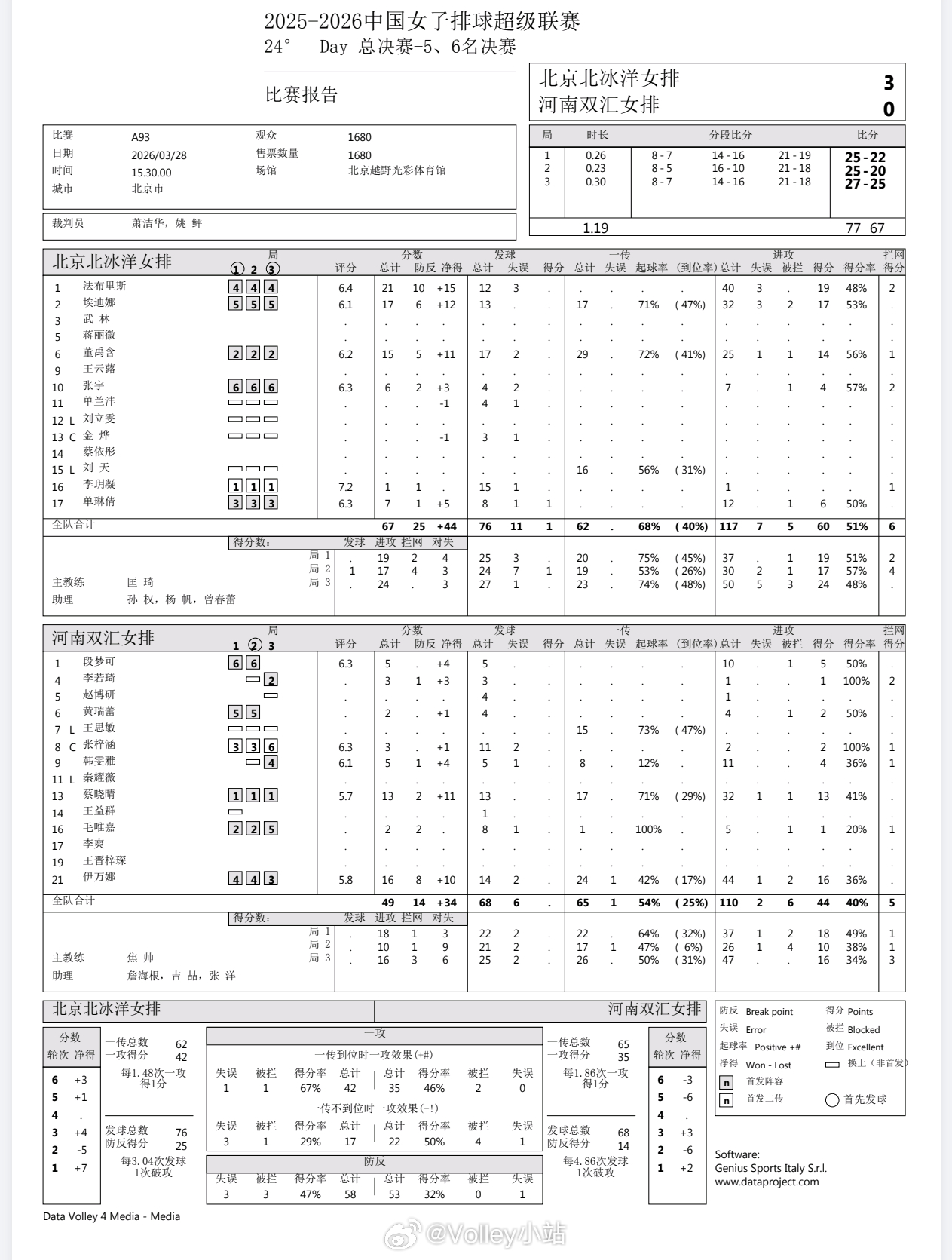 【技术统计】排超联赛5-6名决赛第二回合,北京女排3比0河南女排(25-22 25-20 27-25)