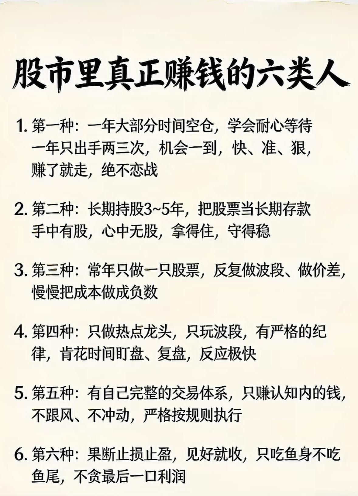 股市赢家的6种思维:你属于哪一类? 在股市的浪潮中,真正能持续盈利的人往往具备独特的投资智慧。以下六类人,用不同的策略在市场中站稳脚跟,看看你是否具备他们的特质? 1. 耐心猎手型 一年大部分时间空仓,学会耐心等待,一年只出手两三次,机会一到,快、准、狠,赚了就走,绝不恋战。 2. 长期价值型 长期持股3~5年,把股票当长期存款,手中有股,心中无股,拿得住,守得稳。 3. 专注深耕型 常年只做一只股票,反复做波段、做价差,慢慢把成本做成负数。 4. 热点敏锐型 只做热点龙头,只玩波段,有严格的纪律,肯花时间盯盘、复盘,反应极快。 5. 体系化交易型 有自己完整的交易体系,只赚认知内的钱,不跟风、不冲动,严格按规则执行。 6. 果断风控型 果断止损止盈,见好就收,只吃鱼身不吃鱼尾,不贪最后一口利润。 股市如战场,盈利的核心不在于频繁操作,而在于清晰的策略与强大的执行力。无论是耐心等待机会,还是专注深耕领域,亦或是严守交易纪律,每一种成功模式都离不开对风险的敬畏和对市场的尊重。你离“真正赚钱”还有多远?或许,从调整思维开始。 (注:股市有风险,投资需谨慎。以上内容仅为经验分享,不构成投资建议。)
