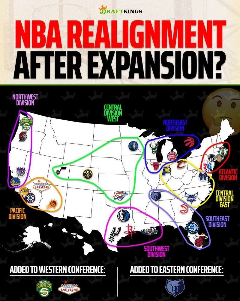 当西雅图与拉斯维加斯如愿加入NBA版图,现有的赛区该如何调整?灰熊分到东部?一个赛区变成4支球队?你心里都还有哪些不错的划分方案?NBA