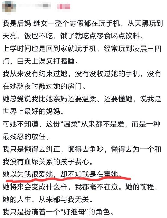 安徽一网友发文称:自己是后妈,整个寒假都在让继女玩手机,从天亮玩到天黑。而她从来没有干涉过继女,也没有收过她的手机。继女称她是最好的妈妈,比亲妈还要温柔。 一位后妈在网上发帖时坦然表示,整个寒假期间,她对继女始终采取全然不管的态度。 孩子要是想玩手机,她从来不会多问一句,任凭孩子从天刚蒙蒙亮玩到深夜时分。 就算到了凌晨两三点,孩子还对着手机屏幕刷短视频、打网络游戏,她也从来没有主动上前劝阻过,更没有一次伸手收过孩子的手机。 孩子感到饥饿时,她从不会主动提醒孩子去吃一顿像样的正餐,而是让她凭着自己的喜好去选择食物,没有丝毫干涉。 无论是各种各样的零食,还是刺激性的碳酸饮料,她都让孩子随意拿取、尽情饮用,自始至终没有给孩子立下任何约束。 可就是这样一种不管不顾、放任自流的态度,反倒让孩子对她产生了极强的依赖感,满心都是欢喜,整天形影不离地粘着她,一口一个“妈妈”,喊得格外亲昵。 孩子还发自内心地感慨,说她是全世界最好的妈妈,比自己的亲妈还要温柔、还要体贴。 每当孩子提起亲妈的时候,总是说到亲妈爱唠叨、爱念叨,不管什么事情都要管着自己,不让自己玩手机。 每天还不停地催着自己写作业,只要自己稍微偷一点懒、松一点劲,亲妈就会发脾气批评自己。 但后妈就不一样了,不管自己做什么事情,后妈都不会对自己说一句重话,更不会指责自己的不是。 而这位后妈在网络上表示,自己之所以这么做。 只是因为她觉得继女以后能拥有什么样的人生,能不能有出息、有作为,跟她没有半点关系,而她也压根不想费精力去管教这个和她没有血缘关系的孩子。 不少人看完这个分享后,都在评论区留下了自己的看法。 很多网友都觉得,后妈给了孩子无限的自由,让孩子随心所欲、无忧无虑,实则是递给孩子一把毁掉未来的“刀”,而这把刀,还是孩子心甘情愿接过来的。 孩子天生就偏爱即时性的快乐,熬夜玩手机、吃零食、逃避写作业,这些都是孩子的本能反应。 毕竟,比起枯燥乏味的学习、需要刻意坚持的规律作息,刷视频、打游戏带来的快乐,来得又快又轻松,不用付出任何努力就能获得。 而后妈顺着孩子的欲望去满足,不用每天早起催孩子起床,不用盯着孩子写作业,不用因为孩子玩手机超时而发生争执,不用费心思去给孩子建立规则、引导孩子走向正途。 但这份看似毫无伤害的纵容,背后藏着的代价,远比想象的要沉重。 一个寒假,看似只有短短一个多月的时间,却足以彻底摧毁孩子长期养成的作息规律。 原本上学时早睡早起的好习惯,经过一个寒假的放任,被彻底打破,孩子白天昏昏欲睡、起不来床,晚上却精神焕发、毫无睡意。 等到开学后,根本无法快速适应校园的作息节奏,上课的时候总是昏昏沉沉,注意力根本无法集中,听课效率大打折扣。 而且寒假也是孩子查漏补缺、巩固所学知识的黄金时期,那些平时上课没听懂、没掌握扎实的知识点,趁着寒假好好复习巩固,才能在新学期跟上老师的讲课节奏,不被其他同学落下。 可这个孩子,整个寒假里连寒假作业都没碰过一下,脑子里装的全是手机里的内容,早就把学习抛到了脑后,忘得一干二净。 等到开学后,其他同学都在稳步前进、查漏补缺,而她却要从头捡起被荒废的知识,很有可能会跟不上老师的讲课进度。 久而久之,就会慢慢失去学习的信心,对未来的学习和发展造成难以挽回的影响。 相信很多母亲都有过这样的经历:每天早上,要一遍又一遍地催孩子起床、刷牙、洗脸、吃早餐。 到了晚上,又要催孩子写作业、洗澡、睡觉;孩子玩手机超时了,要狠心没收手机,坚定地拒绝孩子的哭闹。 孩子偷懒不写作业,要严厉地批评教育,引导孩子改正错误。 孩子挑食不吃正餐,要耐心劝说,甚至偶尔会发脾气。 每一步的管教,都是在和孩子的惰性作斗争,每一次的坚持,都可能换来孩子的抵触和哭闹,孩子会脱口而出“你太凶了”“我不喜欢你”“别人的妈妈都比你好”。 可事实上,当下家长们对孩子从来都不是无端的苛责,每一份严厉的背后,都是在为孩子的未来默默铺路、悉心铺垫。 家长们严格管控孩子的作息,不是故意剥夺孩子的自由,而是发自内心担心孩子长期作息紊乱,熬坏了身体。 严格控制孩子使用手机的时长,并非是要彻底禁止孩子接触电子产品,而是担心孩子深陷手机的诱惑无法自拔,被短视频、游戏消耗掉大量时间。 最终耽误了学业进步,也阻碍了自身的全面成长。 而紧紧盯着孩子的学习,是希望孩子能在成长过程中,积累足够的知识、练就过硬的本领,这样将来步入社会,才能拥有更多自主选择的权利。 可这些深沉的爱,孩子当下根本无法理解,他们只能看到严厉和唠叨,只能感受到被约束、被管教的压力,却看不到背后的担心、焦虑和默默付出。 就像这个继女,她只感受到了后妈不干涉、不约束的温柔,却不知道,这份温柔的背后,是对她未来的不管不顾。 (信息来源:河南青年时报)