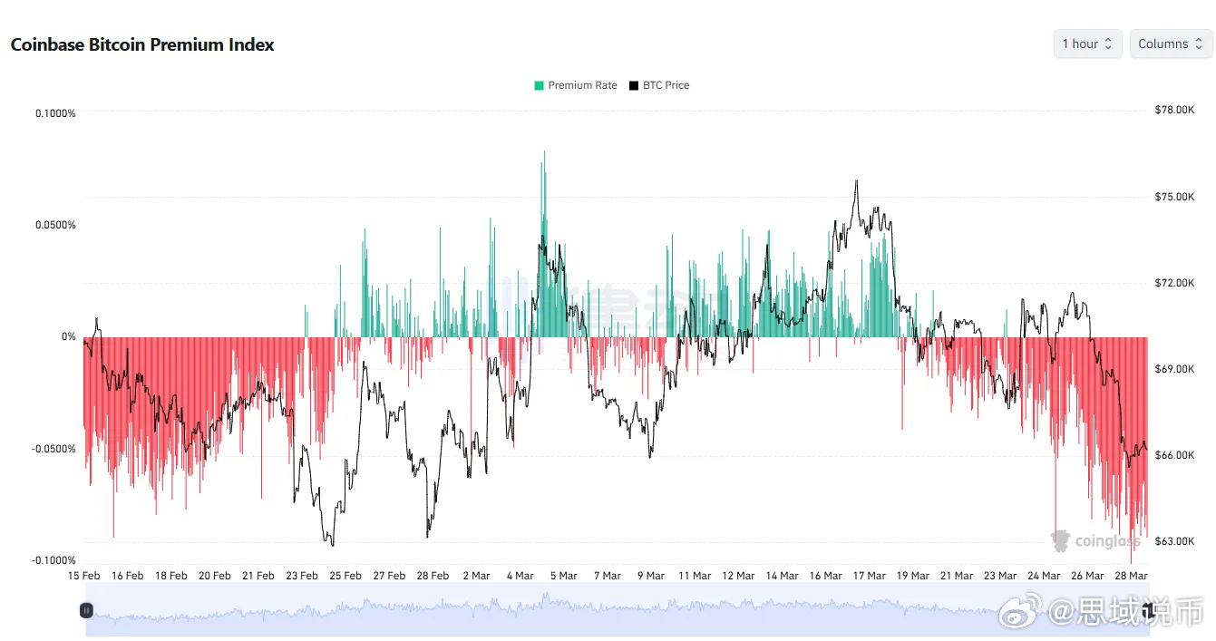 自 3 月 19 日以来,Coinbase 比特币负溢价趋势扩大。同期,比特币自 7.4 万美元回落至目前的 6.6 万美元,证明本轮回调由美国投资者主导。