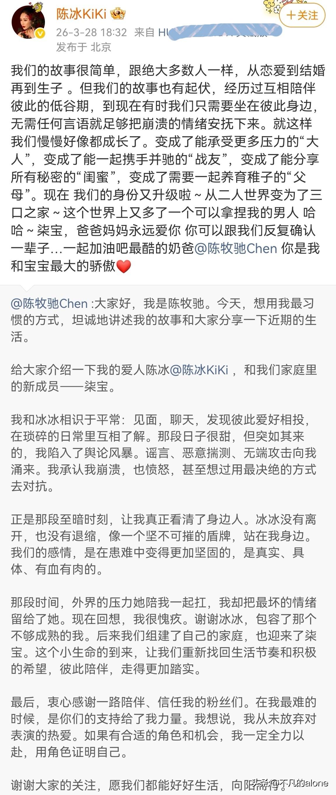 陈牧驰陈冰宣布结婚生子! 3月28日,陈牧驰发长文回顾与妻子陈冰的相识经历,也谈到了自己曾陷入舆论风波,但妻子陈冰并没有离他而去,反而选择默默地陪伴他。 陈牧驰还表示如果有好的角色和机会,他一定会全力以赴,用角色证明自己。 不管如何,还是恭喜陈牧驰和陈冰喜得贵子。 希望陈牧驰以后用作品说话,但他的胡子有点多,网友都建议他刮了,大家觉得呢?