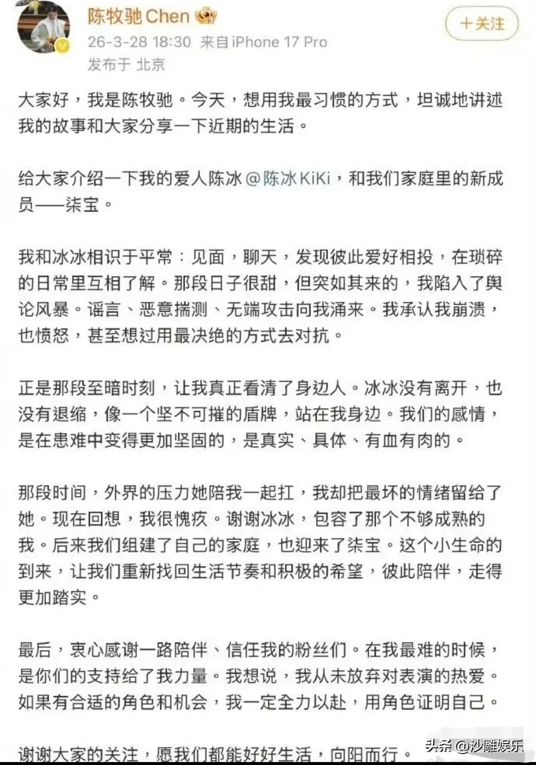 今天娱乐圈又传来一对正式官宣! 3月28日,娱乐圈一整天都安静得像暴风雨前的宁静,没想到傍晚时分,两颗“重磅炸弹”接连炸开了锅——陈牧驰和陈冰几乎同时发文,直接把结婚生子的消息甩了出来,全网瞬间沸腾! 说实话,这波官宣来得既突然又让人感慨万千。陈牧驰在长文里坦言,当初深陷舆论风暴时,是陈冰像“坚不可摧的盾牌”一样挡在他身前,陪他扛下了所有压力。他字里行间满是愧疚,说那段时间自己把最坏的情绪都留给了陈冰,如今回想起来,才明白这份陪伴有多珍贵。 而陈冰那边更是直接晒出一家三口的牵手照,官宣宝宝小名叫“柒宝”,还大方分享了孕期写真。她在长文里说,两人从恋爱到结婚生子,一起走过低谷,如今成了彼此的战友、闺蜜、父母——这关系层次也太丰富了吧! 回顾去年,陈牧驰经历的那场舆论风暴,可以说是被全网拿着放大镜审视。换作一般人,可能早就扛不住了。但陈冰不仅没退缩,反而成了他最坚实的后盾。这种“你低谷我不离不弃”的剧情,放在如今快节奏的娱乐圈,简直像一股清流。 有网友评论:“这才是真正的爱情吧,不是锦上添花,而是雪中送炭。”还有人说:“陈冰这波操作,直接封神了,娱乐圈多少对夫妻大难临头各自飞,她偏偏反着来。” 两人选择在傍晚时分同时发文,没有提前预热,没有营销号铺垫,就是简简单单的文字加照片,却把情绪拉满了。陈牧驰那句“从未放弃对表演的热爱”,更是让人看到他在经历风波后依然保有对事业的执着。 这种“家庭圆满+事业继续”的双重表态,既给了粉丝定心丸,也向外界传递了一个信号:我还在,我会继续。 当然,评论区也少不了各种“细节控”。有网友翻出去年两人被拍到的同框画面,调侃说:“当时还说只是朋友,现在直接甩出孩子,这保密工作做得比特工还到位。”也有人打趣:“别人官宣恋爱,你们官宣直接跳到三口之家,这进度条拉得太快了吧!” 说实话,陈牧驰这一路走来,从被全网群嘲到如今家庭圆满,确实让人看到了另一种可能性——在娱乐圈,不是只有流量和热搜才能定义成功。他用一段稳固的感情、一个完整的家庭,给自己画上了一个温柔的逗号。 而陈冰的选择,也让人看到了“清醒式恋爱脑”的正确打开方式:爱一个人,不是盲目冲动,而是在他最难的时候,选择成为他的光。这种双向奔赴的陪伴,远比那些轰轰烈烈却经不起风浪的感情珍贵得多。 如今,陈牧驰说未来有合适的机会一定会全力以赴,而陈冰也在长文里流露出对生活的知足和感恩。这波官宣,没有撕扯,没有狗血,只有两个成年人在风雨过后,牵着孩子的手,平静地告诉大家:我们很好。 网友的一句评论或许最能概括这一切:“原来娱乐圈也有不靠炒作、不靠营销,踏踏实实过日子的爱情。” 这大概就是3月28日傍晚,最温暖的一束光了吧。