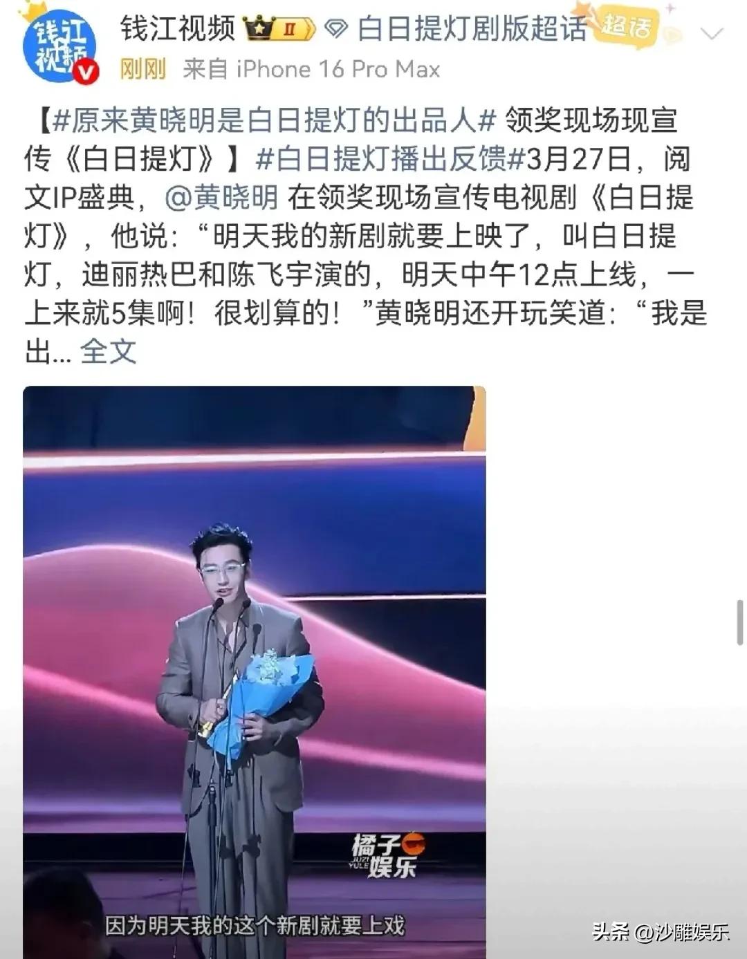 黄晓明,太有眼光了! 3月27日深夜,阅文IP盛典的领奖台上,黄晓明的一句话直接把自己送上了热搜。 当时他手握奖杯,站在聚光灯下,本可以好好享受这份荣誉。但他偏不,硬是见缝插针地给新剧打了个广告:“明天我的新剧就要上映了,叫《白日提灯》,迪丽热巴和陈飞宇演的,明天中午12点上线,一上来就5集啊!很划算的!” 台下观众刚笑出声,他紧接着又补了一刀:“我是出品人,我没演啊,不能糟蹋这戏。” 这话一出,现场直接笑翻。但笑归笑,细品一下,这哥是把“赚钱”这门生意玩明白了。 先说说这个“我没演”的梗,简直是四两拨千斤。 要知道黄晓明的演技一直是网友津津乐道的话题,演好了是“演技派”,演砸了就是“油腻霸总”。他这波自黑,直接把“我不演”和“质量好”划上了等号——潜台词就是:我亲自把关的剧,质量杠杠的,你们放心追。 这招既调侃了自己曾经的“霸总”标签,又把“出品人”的专业感立住了。讲真,现在的观众最怕什么?就怕明星挂个出品人的名头然后硬塞自己进组演戏。黄晓明这一句“我没演”,反而成了最大的卖点。 回头看黄晓明的商业版图,你会发现他不是那种“闷声发大财”的类型,而是每一步都踩在风口上。 早年靠《大汉天子》《上海滩》火遍全国,赚的是演员的辛苦钱。后来转身当老板,投资的《中国合伙人》不仅票房大卖,还拿下金鸡、金像多项大奖,赚了口碑又赚了钞票。 再后来,他成立明嘉资本,投同道大叔两年狂赚230倍收益,投坚果投影、寿全斋姜茶,个个赚得盆满钵满。最近更是和杜华联手杀入机器人租赁赛道,押注“擎天租”这个新风口。别人还在琢磨怎么接戏,他已经在布局下一个十年的财富密码了。 再说回这次的新剧《白日提灯》。 选角上,迪丽热巴+陈飞宇,流量与实力兼具的组合,瞄准的就是IP剧的大市场。开播就放5集,直接把观众的期待值拉满,这宣发思路,简直是高阶玩法。 更绝的是,他还自爆手握多个阅文IP,而且“大部分都是贼贵的那种”。这话翻译过来就是:我已经囤了一堆好货,这只是开始。 要知道,阅文IP的影视化改编权可不便宜,黄晓明这是把“囤IP”当成了地产投资——先占坑,再慢慢开发。这套路,像极了当年囤红酒囤出1500万利润的操作。 说实话,黄晓明这些年没少被网友调侃。“闹太套”“油腻”“霸总附体”,标签贴了一堆。但他愣是靠着一次次精准的商业布局,把自己从“被群嘲的演员”变成了“被佩服的老板”。 从荧幕上的“霸道总裁”,到现实里的“资本玩家”,黄晓明用行动证明了一件事:会演戏是本事,会赚钱是能力,两者结合,才能在娱乐圈和商界都玩得风生水起。