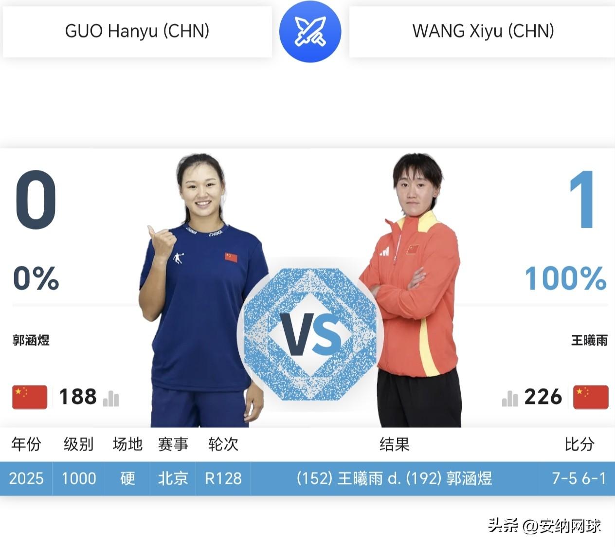 3月29日W50🇨🇳马鞍山决赛时间 ◆3号球场 14:00 决赛 女单 0:1(交手记录详见配图) 🇨🇳郭涵煜[5]188 🇨🇳王曦雨[8]226 去年中网王曦雨7:5/6:1战胜郭涵煜 看看今年再次相遇会发生什么?[点亮平安灯]