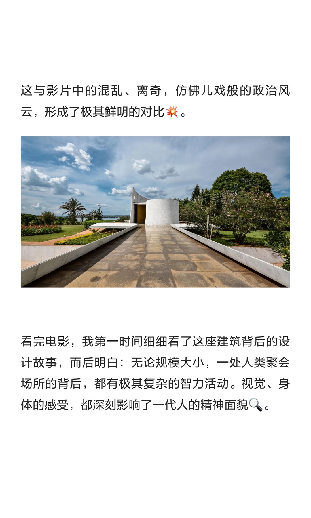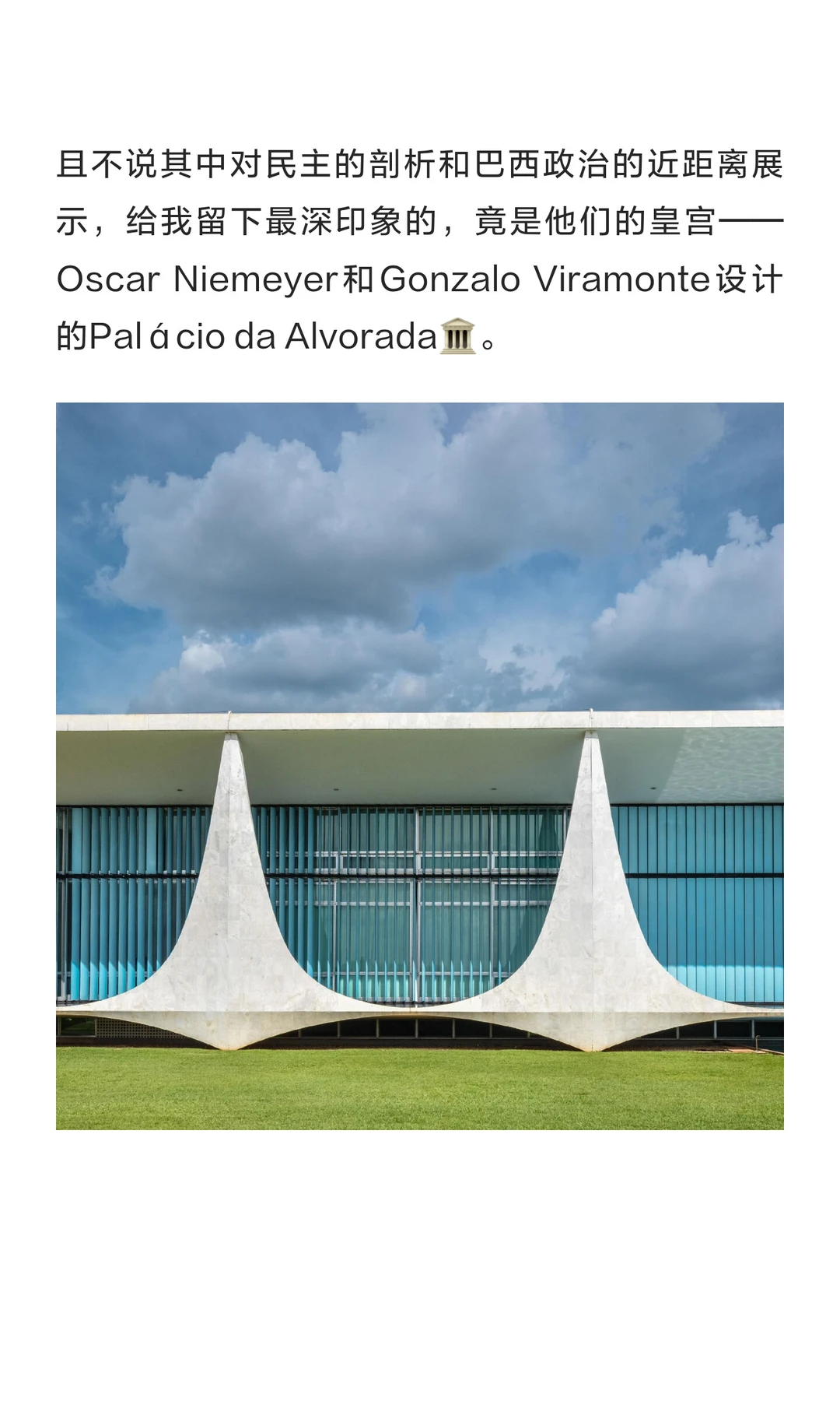 且不说其中对民主的剖析和巴西政治的近距离展示,给我留下最深印象的,竟是他们的皇宫——Oscar Niemeyer和Gonzalo Viramonte设计的Palácio da Alvorada🏛️。