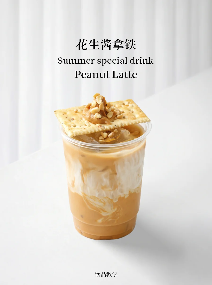 做法:饼干+花生碎装饰,花生酱+牛奶+咖啡奶+糖浆搅拌,加冰,倒入咖啡
