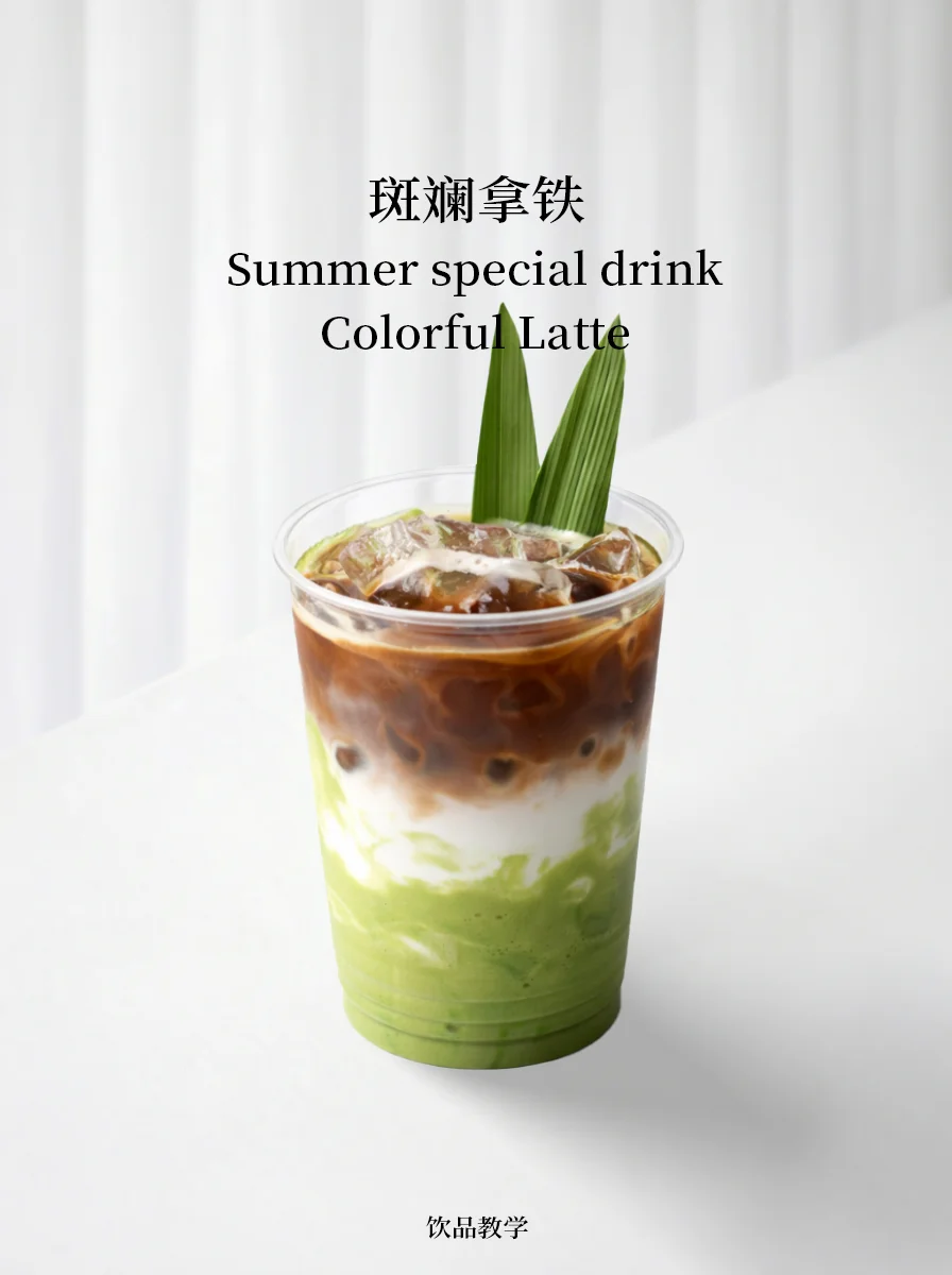 做法:斑斓糖浆+牛奶+咖啡奶+糖浆搅拌,加冰,倒入咖啡,用斑斓叶装饰