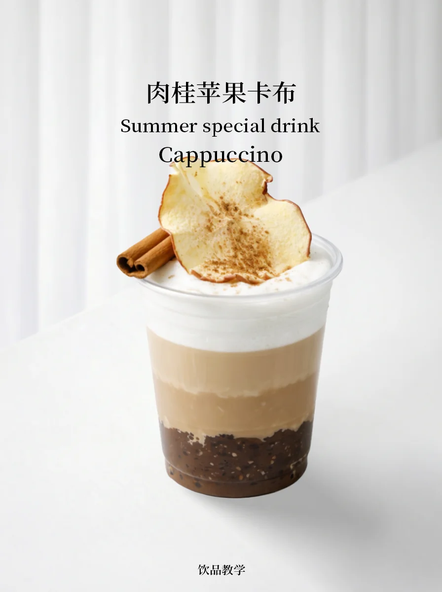 做法:肉桂苹果糖浆铺底,加冰块,牛奶+咖啡奶+糖浆搅拌倒入,加咖啡,装饰苹果干和肉桂棒