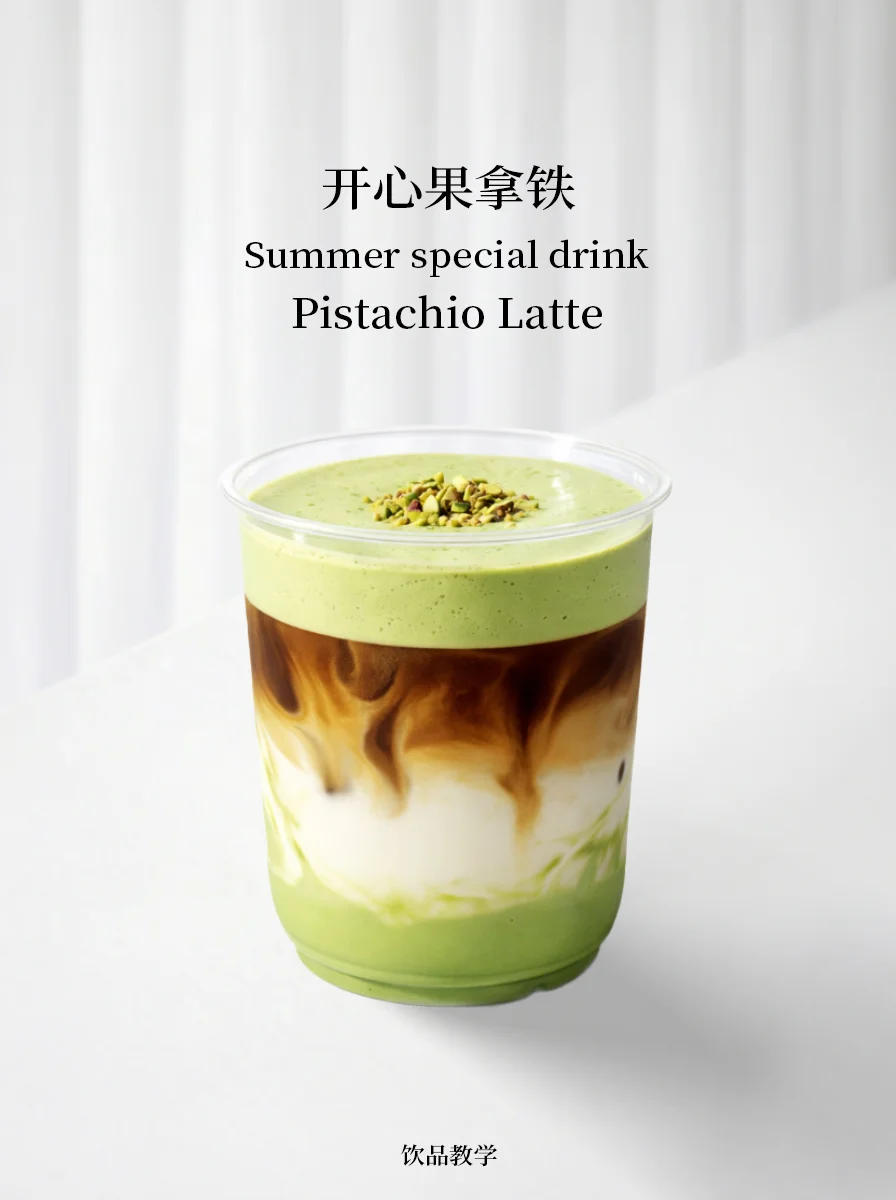 做法:开心果酱抹杯挂壁,加冰块,牛奶+咖啡奶+糖浆搅拌倒入,加浓缩咖啡