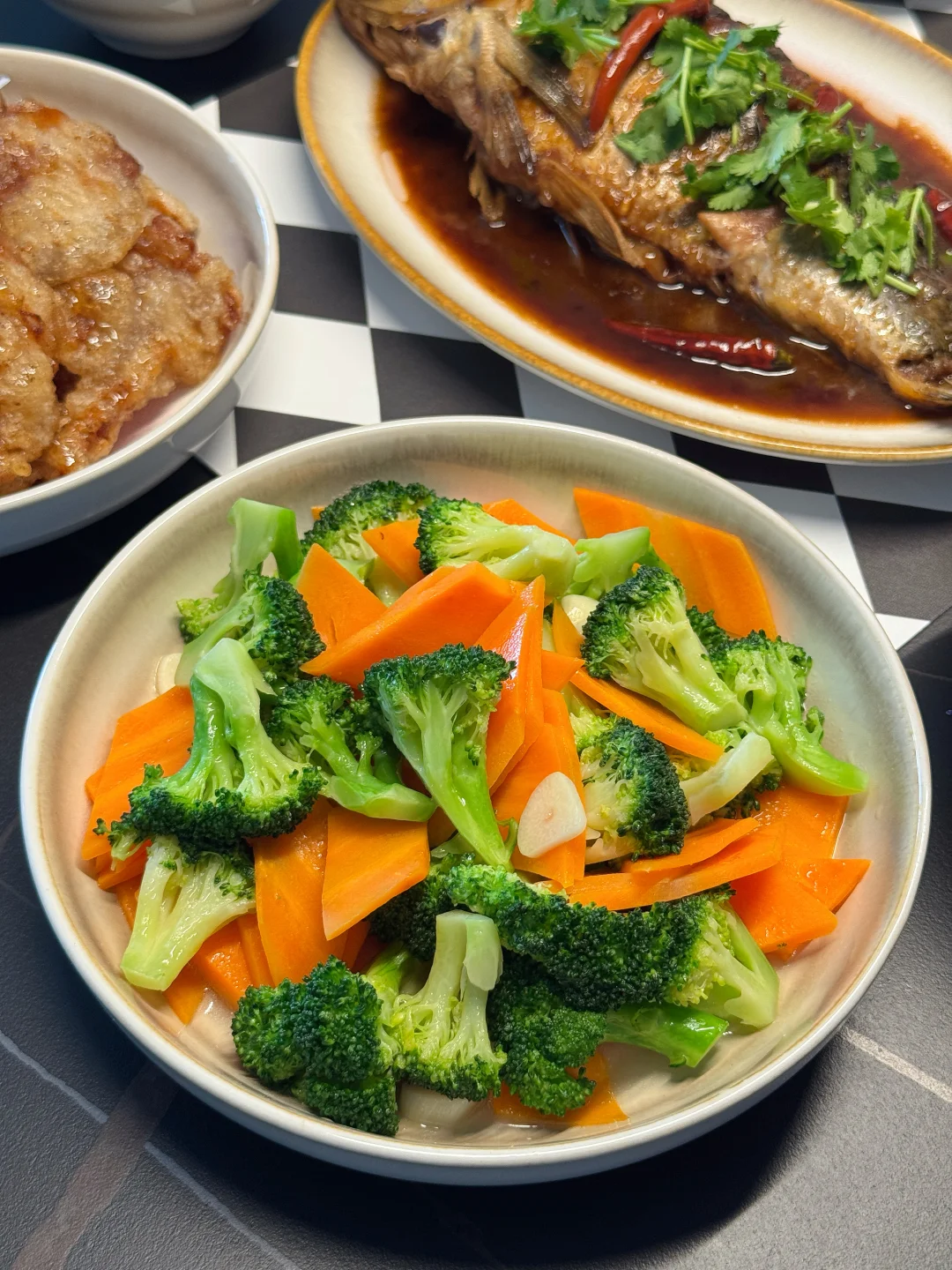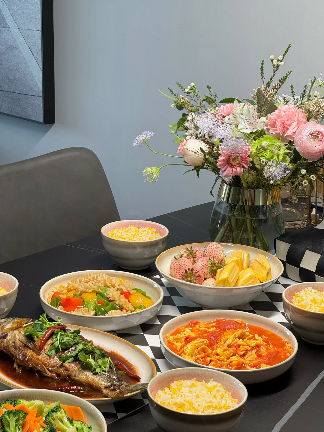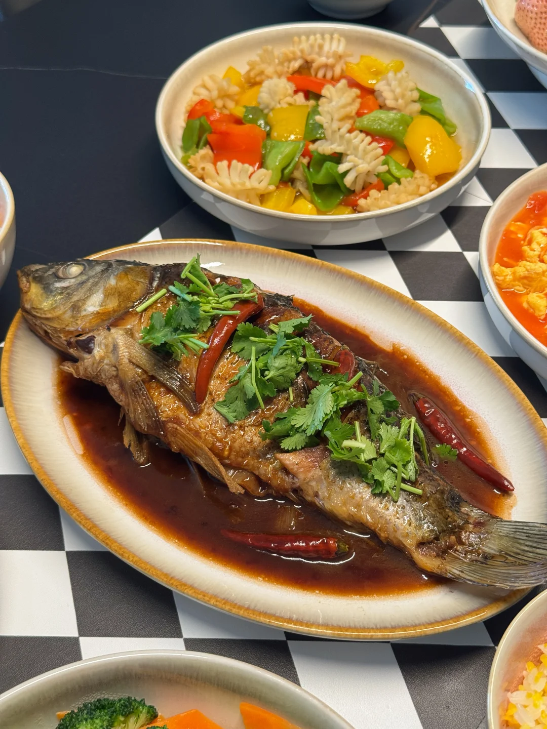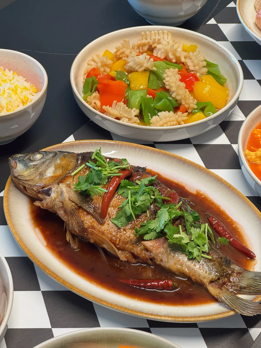春天的太阳好得不像话~ 舒服的宅家,吃一顿颜值在线的饭[樱花R] 风软软的,菜香香的, 一口春天,一口好心情。 今日菜单🥢 红烧鲤鱼 爆炒鱿鱼卷 西红柿炒鸡蛋 锅包肉 蒜蓉西蓝花