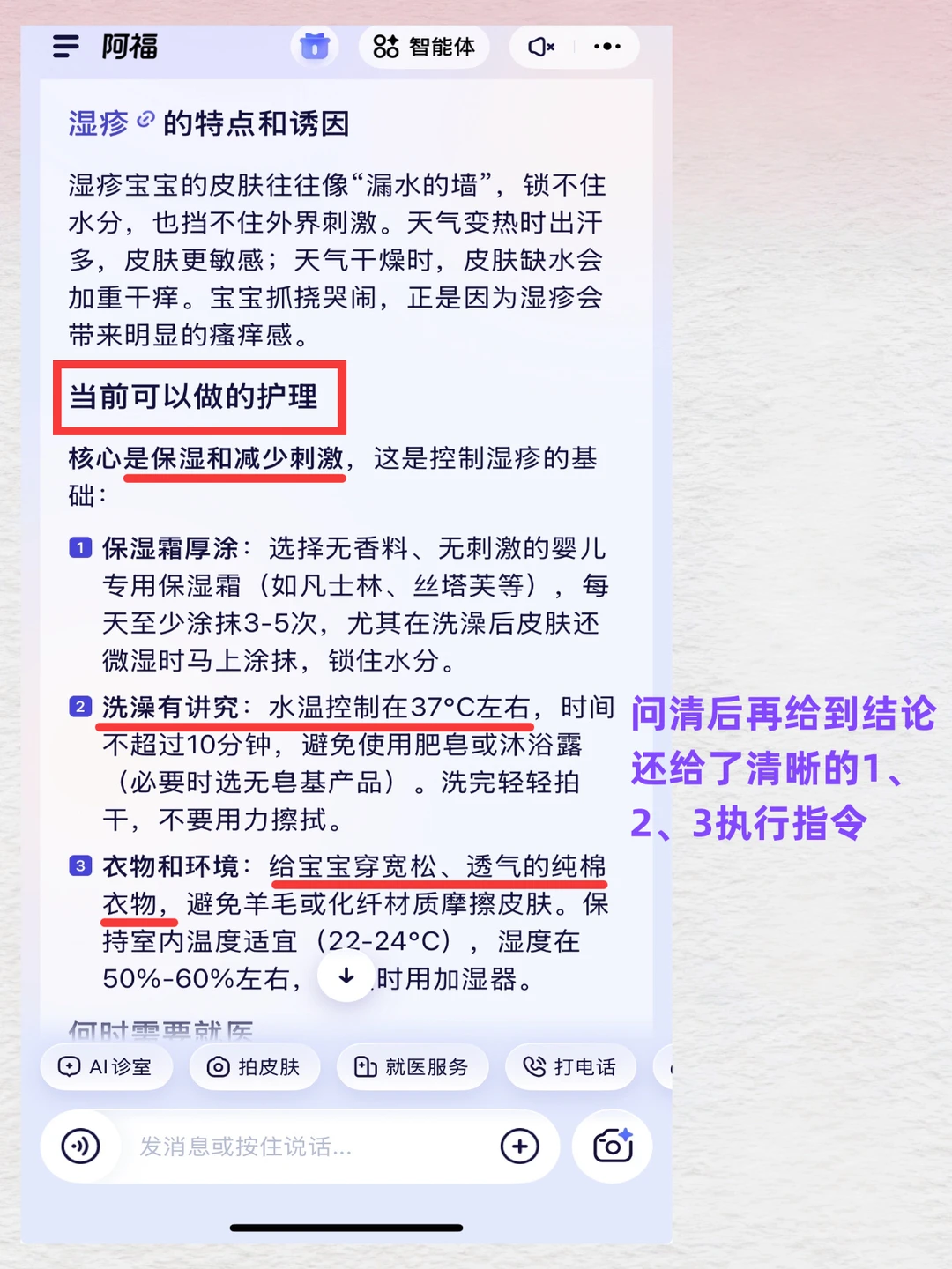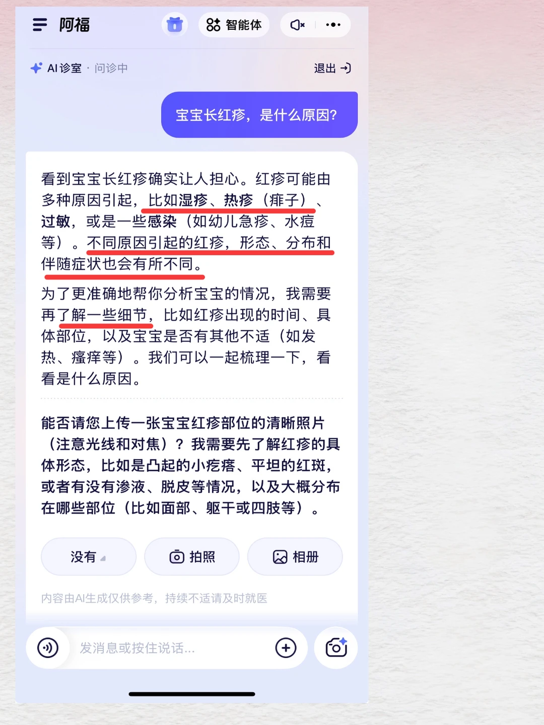 聊了五六轮之后,它才说可能是食物过敏引起的荨麻疹,让我先冰敷观察。