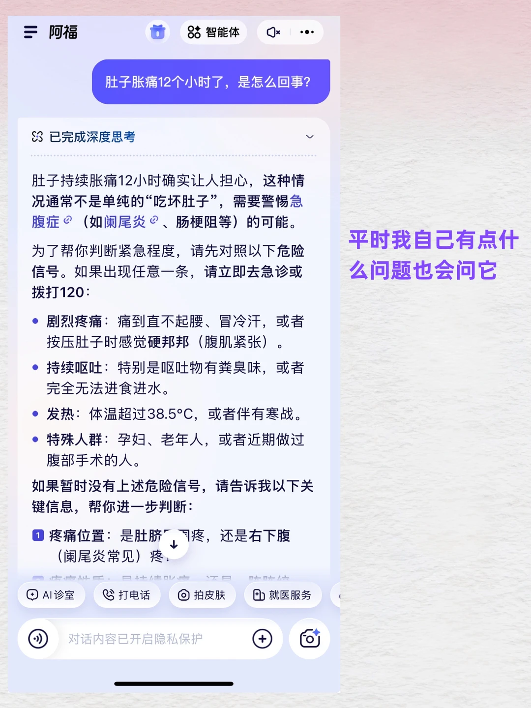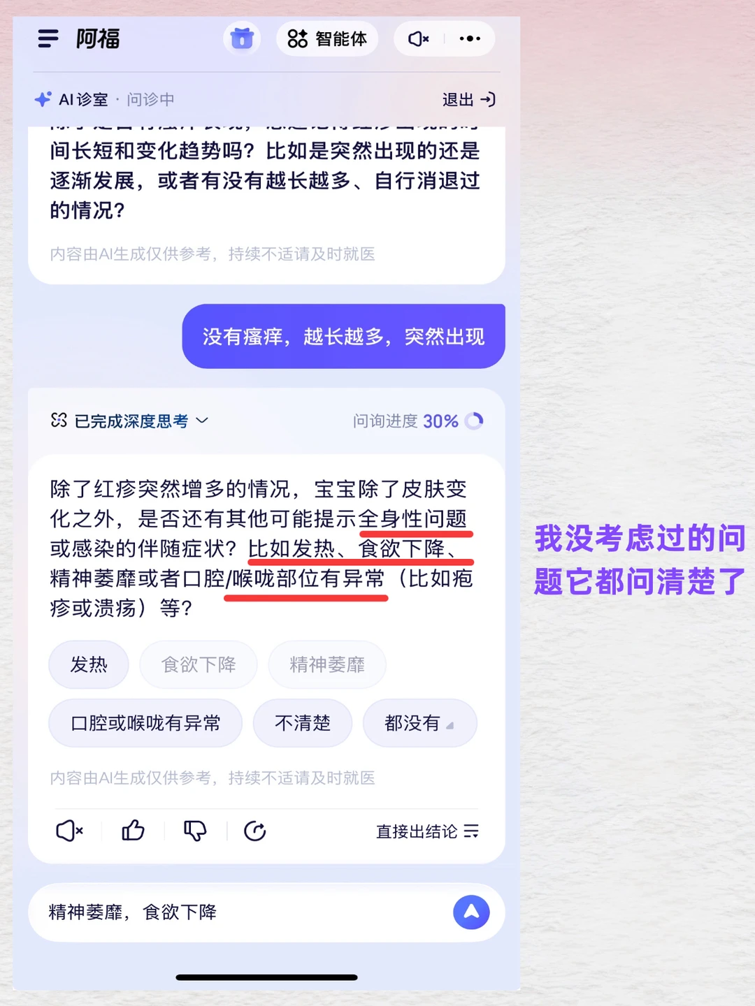 很怕半夜孩子突然起疹子,老人说不舒服,自己有点胃疼咳嗽,都在那纠结:去不去医院?大晚上的折腾一趟,又怕其实没那么严重。那会儿就觉得,咱们缺的不是医学知识,是有人能帮我把症状问清楚🤯。