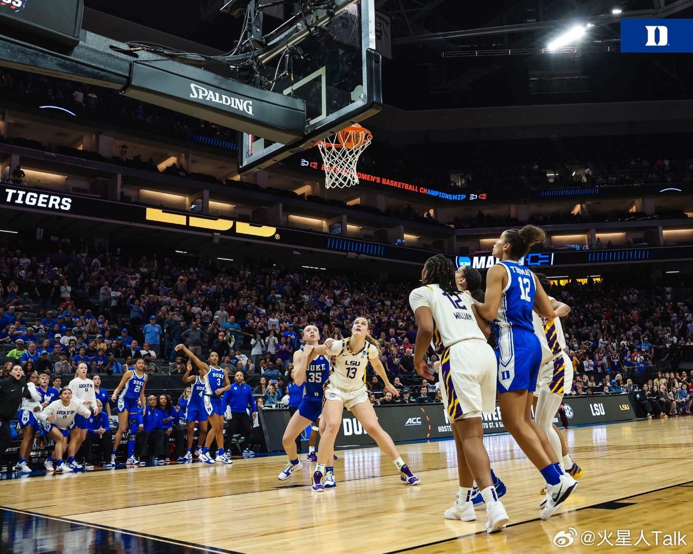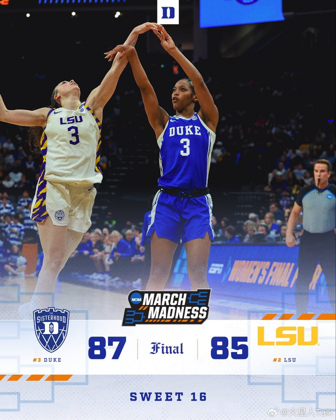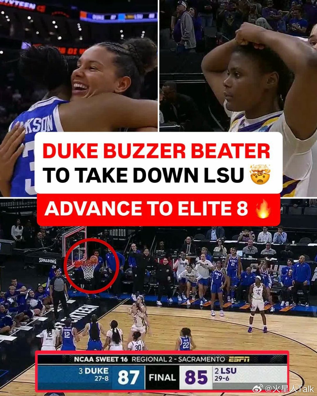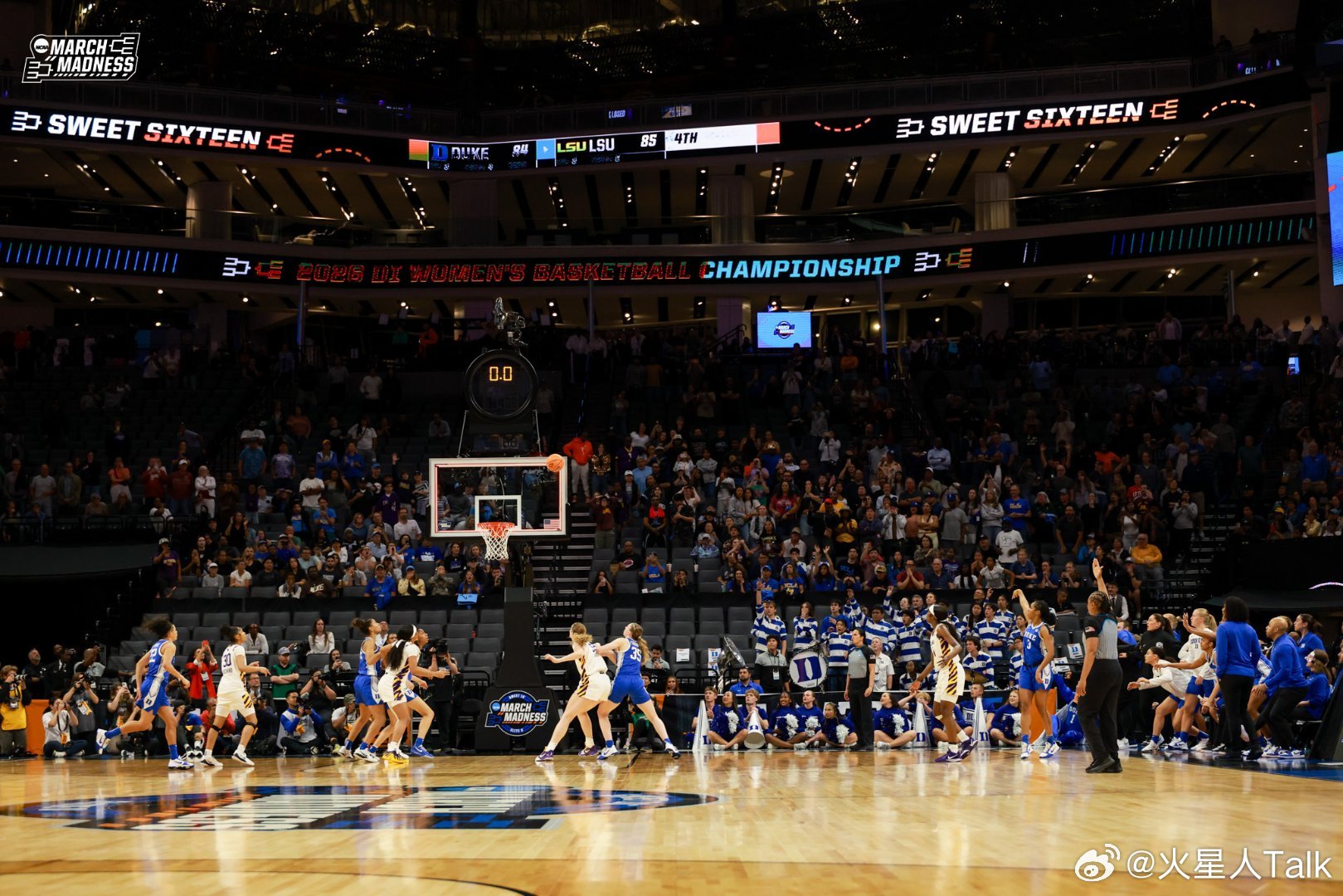 2025-2026赛季NCAA女篮疯狂三月 萨克拉门托赛区(2)半决赛杜克大学绝杀路易斯安那州立,进入精英八强。蓝魔Toby Fournier15中6,22分9篮板4失误3抢断。Taina Mair18中8,22分5篮板4助攻2抢断。Ashlon Jackson命中绝杀三分球,14中6得到19分5助攻。替补Arianna Roberson12中4,9分10篮板。紫虎本赛季进攻非常出色,得分破百的比赛有16场。Mikaylah Williams15中6,22分5篮板。Flau'jae Johnson15中6,13分5篮板。MiLaysia Fulwiley17中11得到28分4篮板4助攻。Kate Koval4封盖。