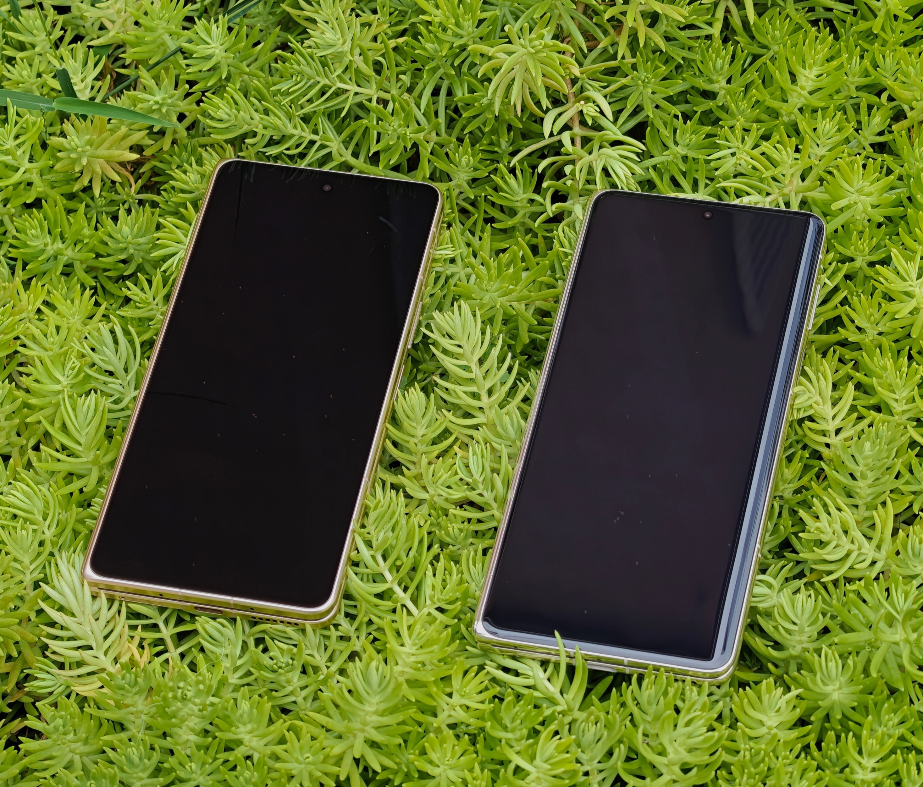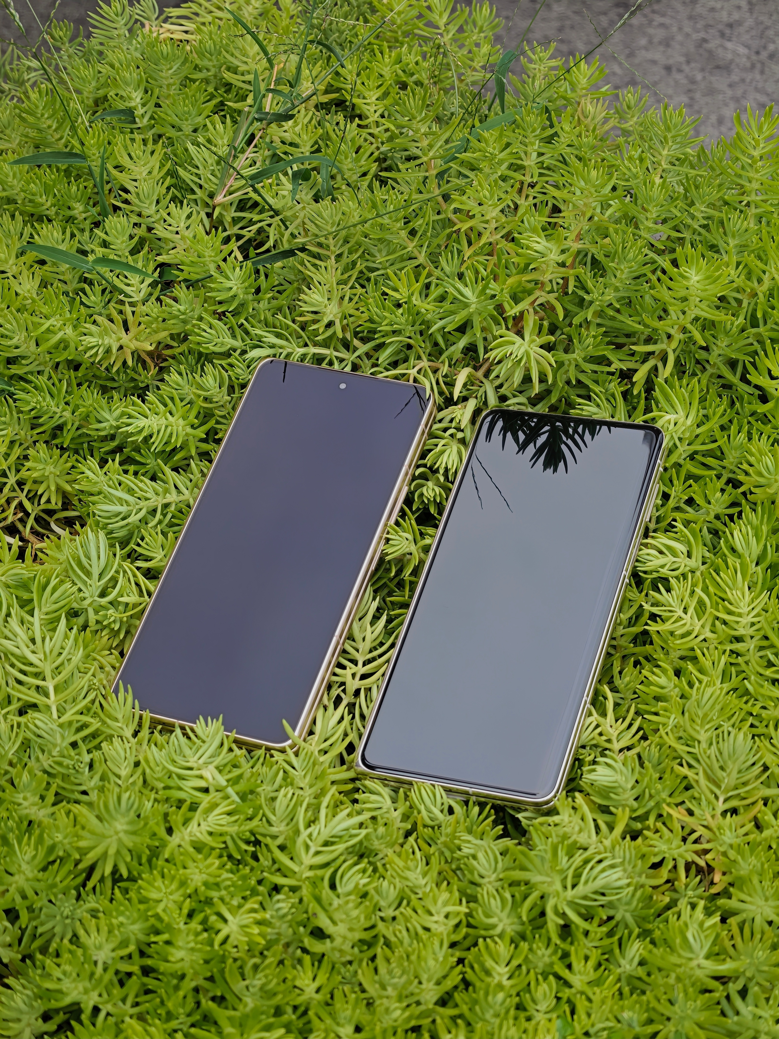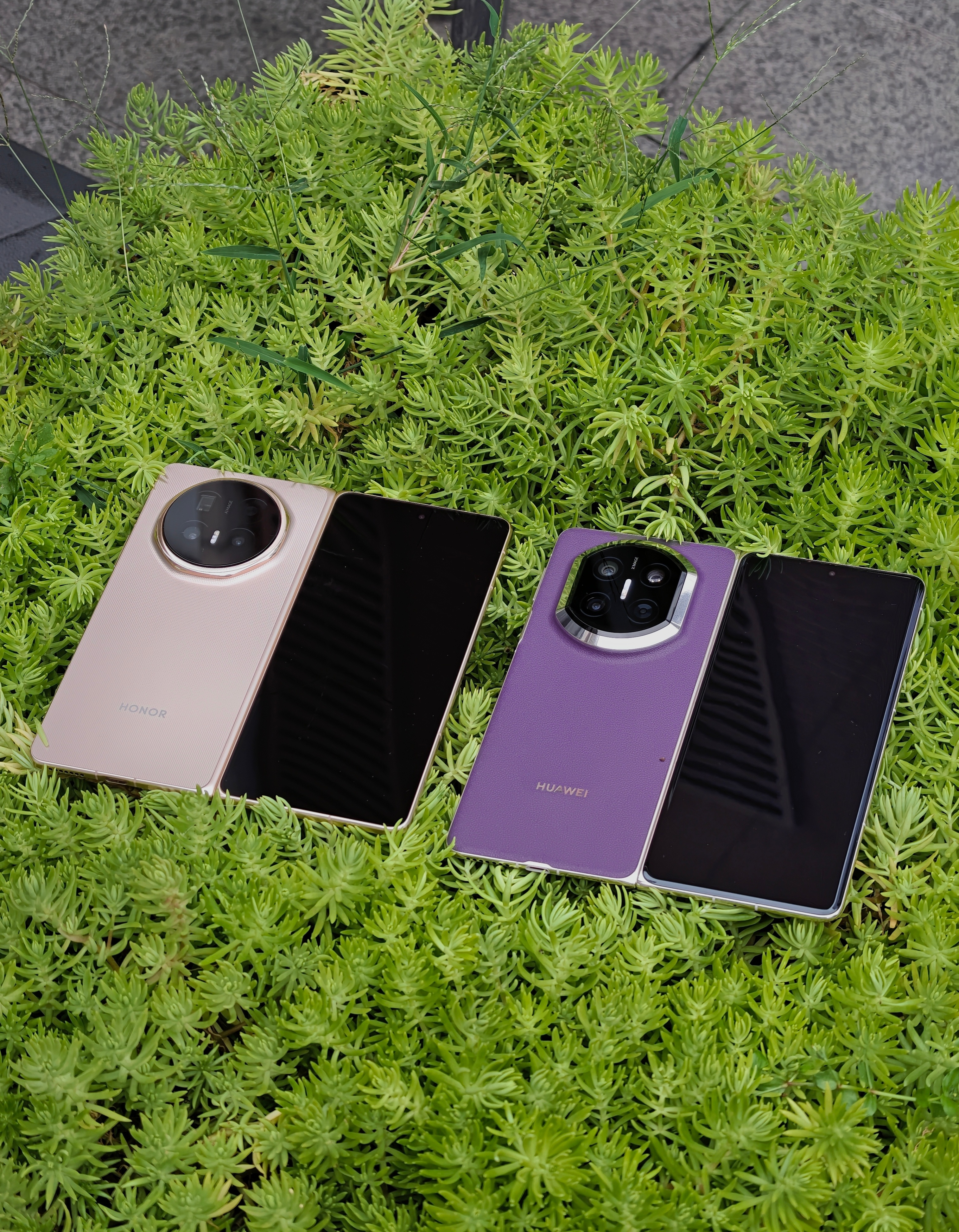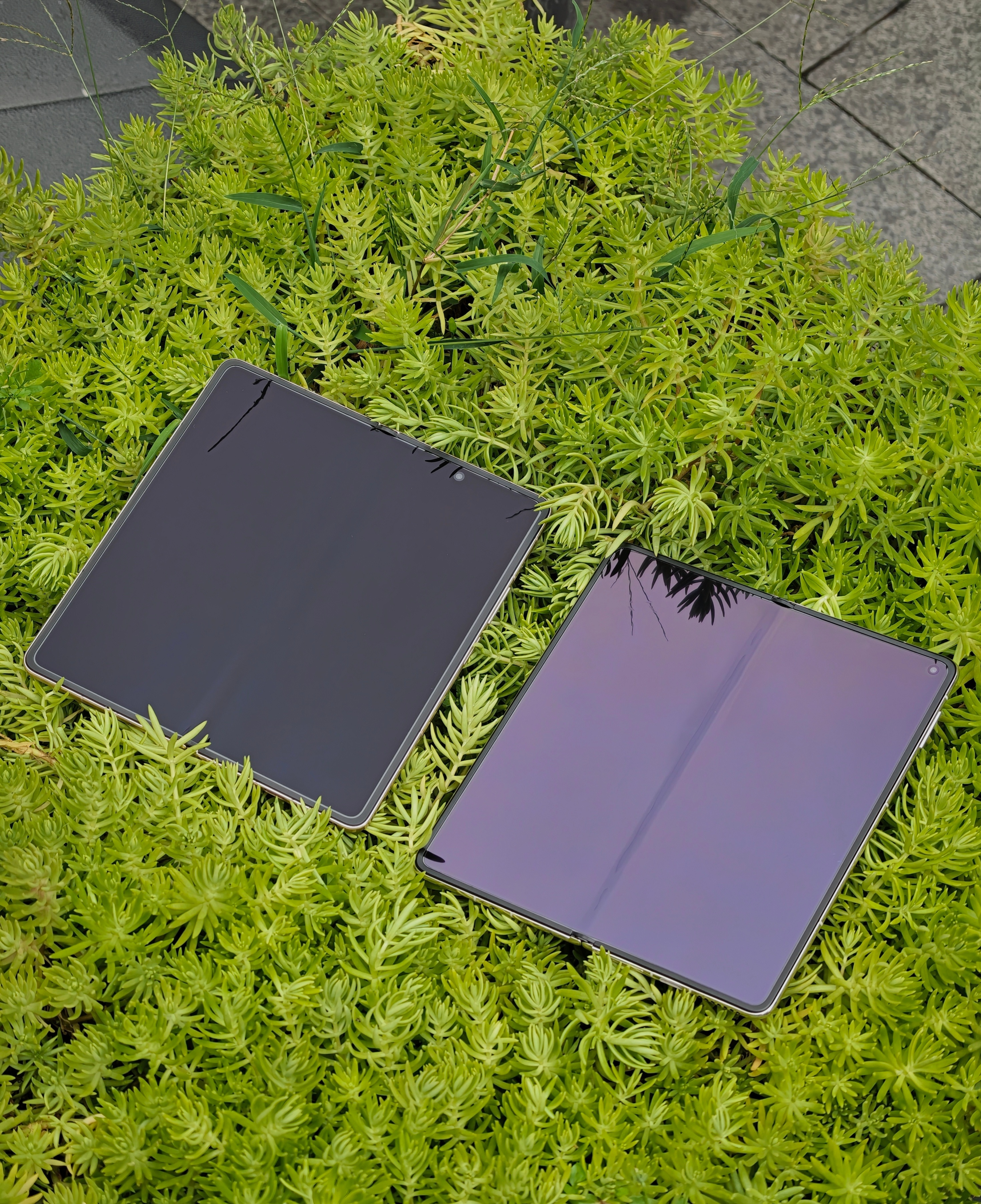 荣耀Magic V6和华为Mate X7屏幕抗放射效果对比图:左边是荣耀Magic V6,右边是华为Mate X7,图1和2是大太阳直射下的效果,图3和4是阳光稍暗一些时段下的效果。没想到吧,荣耀要比华为黑很多啊!