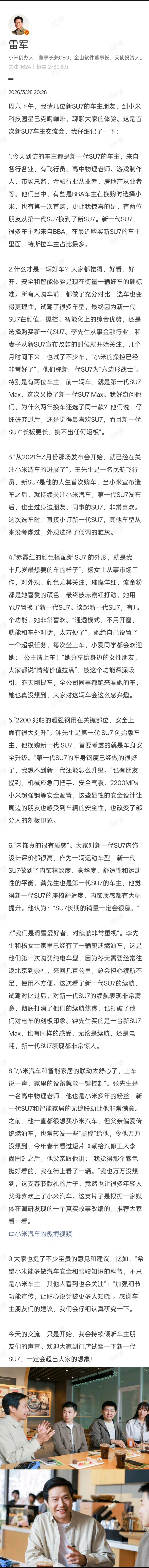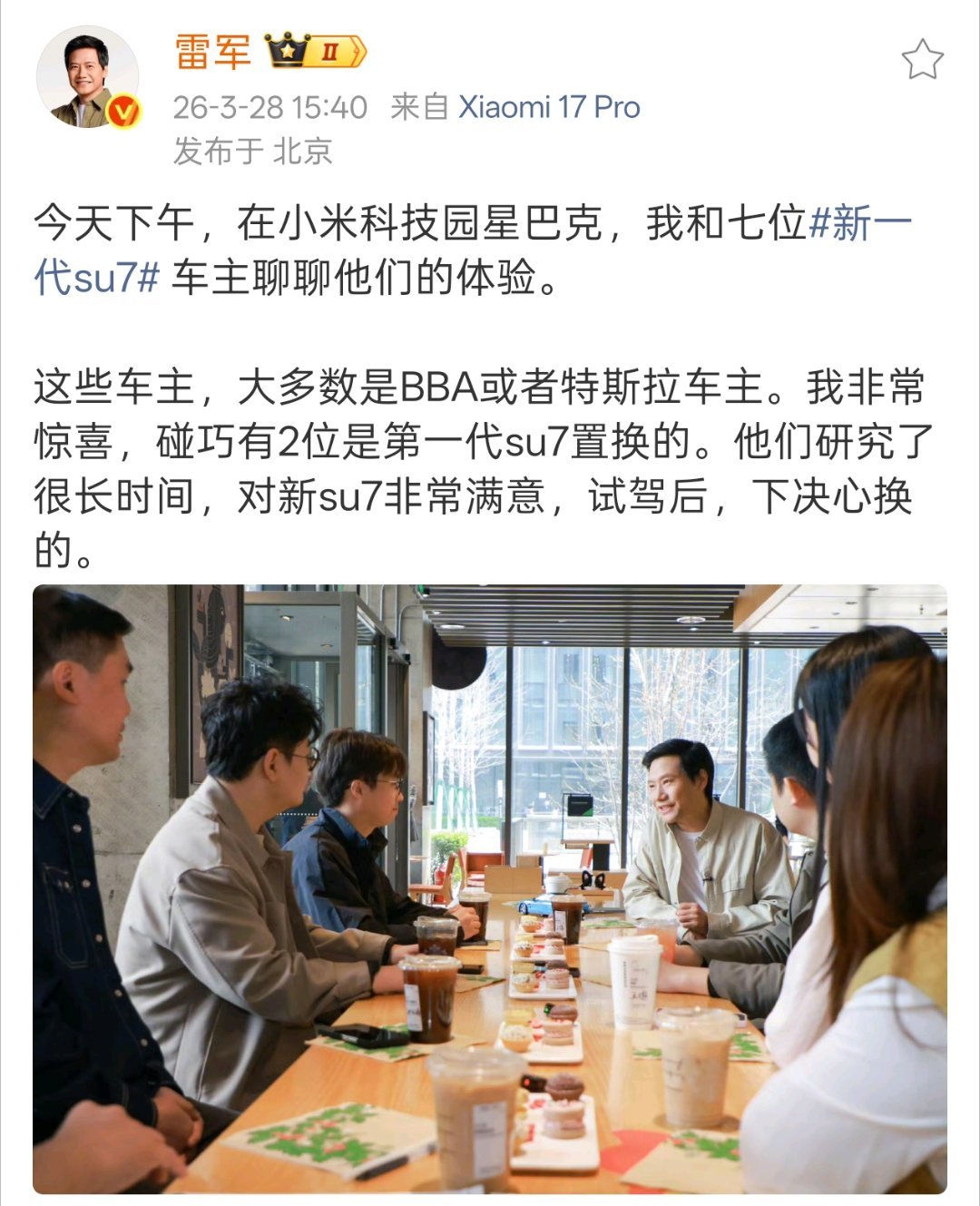 雷总今天找了车主来线下访谈,很多来喝咖啡的新 SU7 车主都是 BBA 或特斯拉换过来的,甚至还有车主购入 SU7 之后顺手拿下了小米全家桶,干净利落直接加入小米生态。