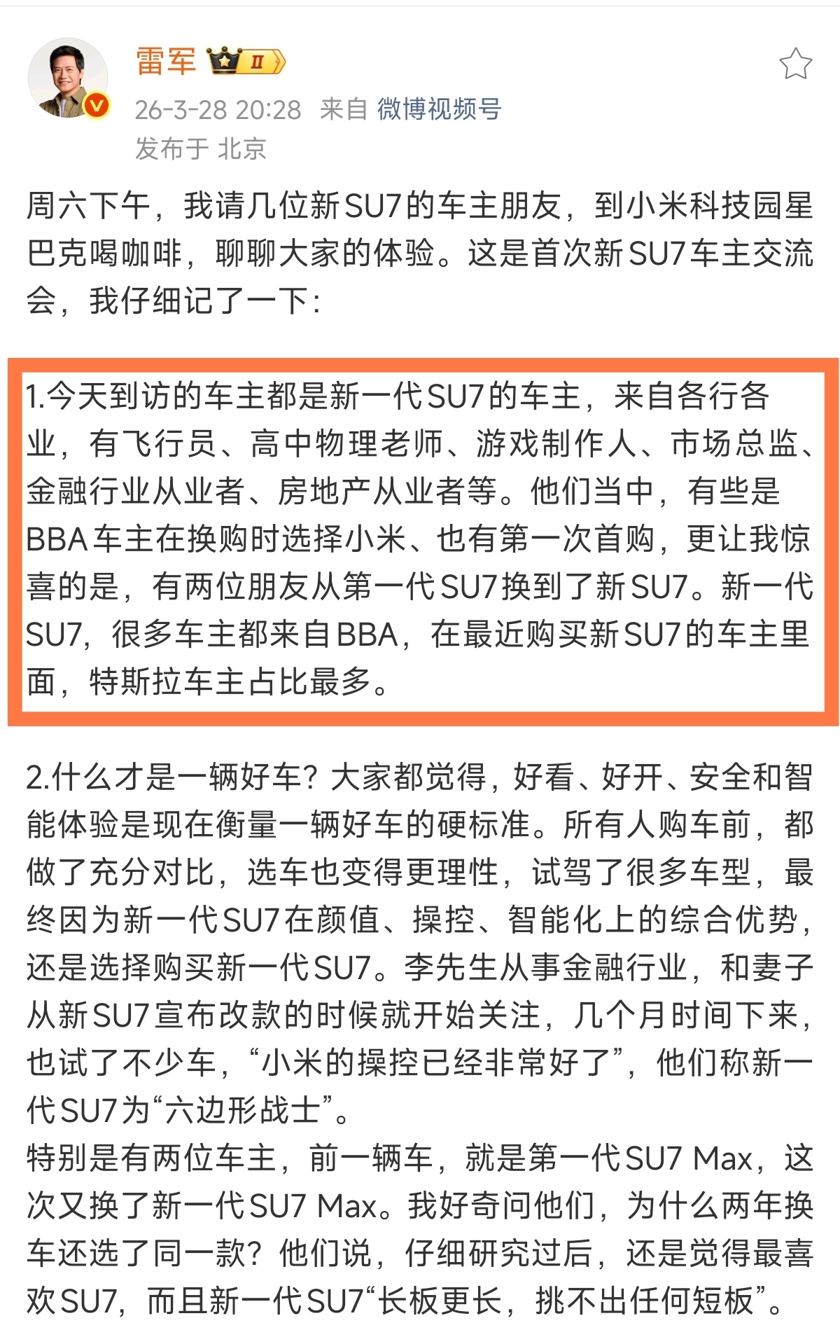 雷总:很多新一代SU7车主来自BBA。可能会有一些网友不相信,但这却是铁一般的事实,甚至还有很多特斯拉车主也选择了新小米SU7。
