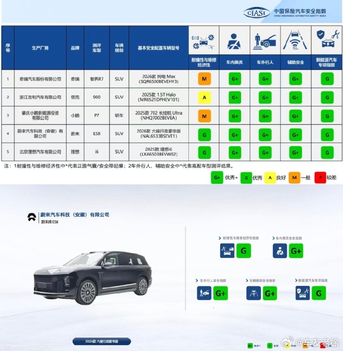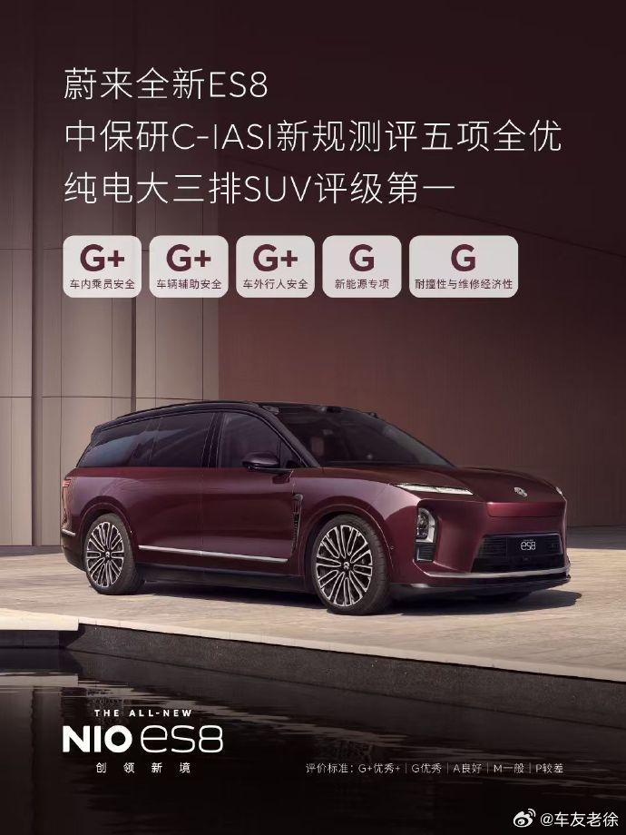 2026年3月26日,中国保险汽车安全指数在北京发布了 2026 年的最新测评结果,蔚来全新 ES8 获得了五项全优的评价。