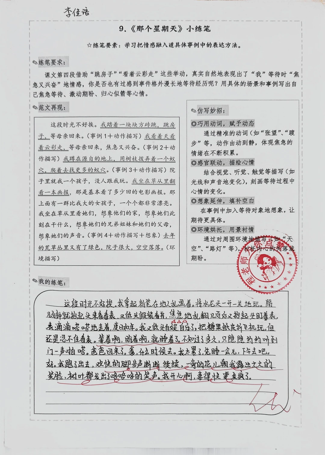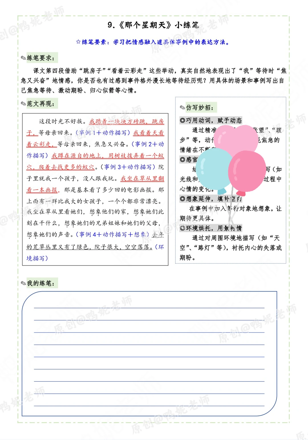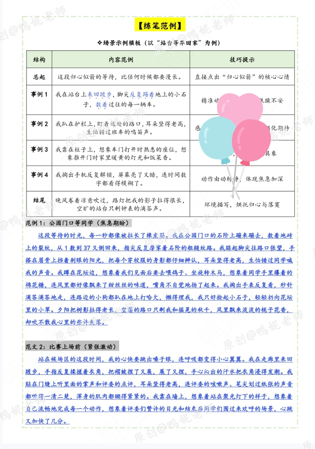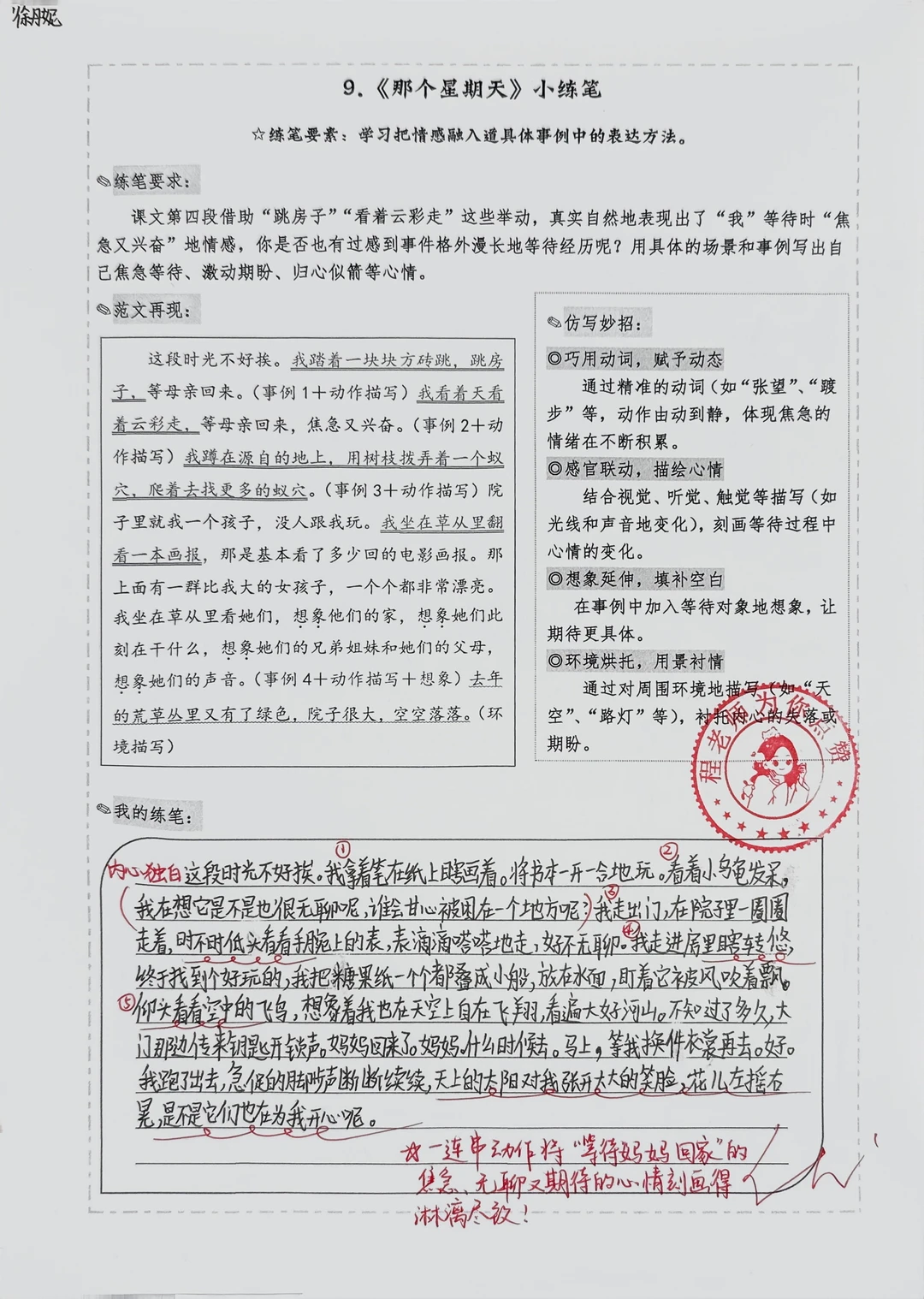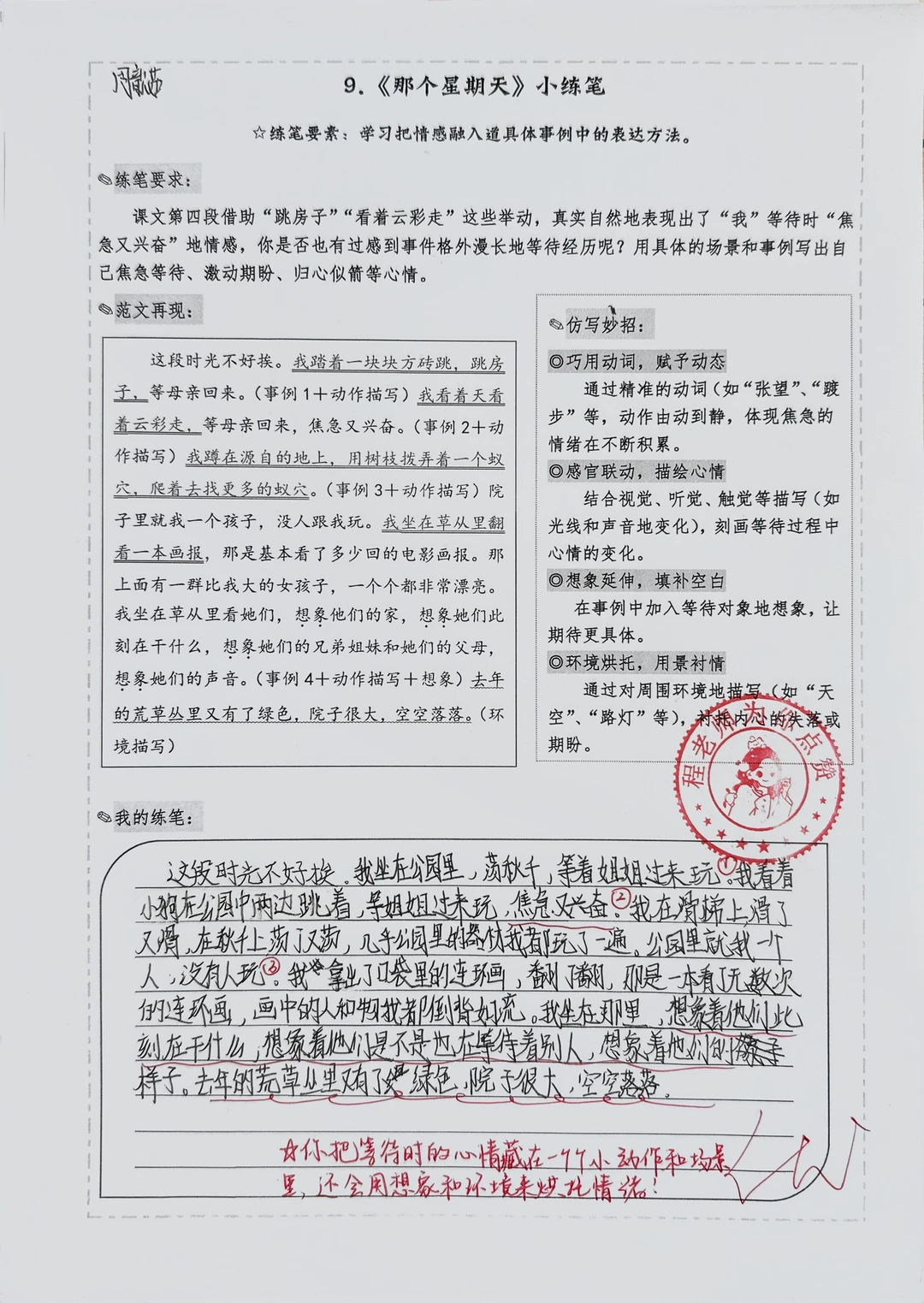 📝《那个星期天》第四段仿写片段 孩子们真的学会了把焦急等待的心情藏在具体动作和场景里,文字里满是细腻的小心思,太动人了! 👉总来说就是要梳理好三条线: 事情线➕心情线➕景物线 用景物的变化衬托出心情的变化,情随事变,景随情变。 👉再融入内心独白,渲染内心世界。 看着他们用翻连环画、想象画面、观察环境这些细节来写等待,能感受到他们对生活的敏锐感知,写作的种子正在悄悄发芽🌱