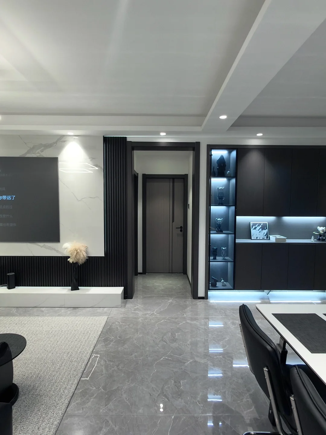 🏠户型三室两厅两卫 建筑面积128,套内115平 没有装修公司,全程自装 现代简约黑白灰的风格~ - 冷灰色1.5X 0.75的大砖通铺 墙面通刷白色乳胶漆 白色岩板餐桌搭配黑色的座椅 黑色的沙发搭配灰白色的地毯 简简单单的小家就很好~