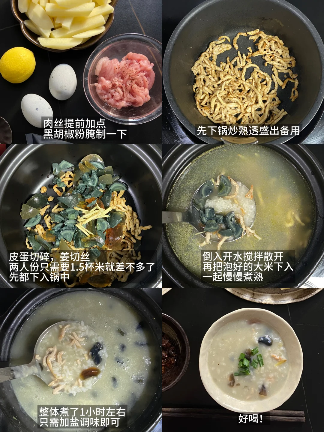 1)肉丝提前加点黑胡椒粉腌制一下,先下锅炒熟透盛出备用,皮蛋切碎,姜切丝,两人份大概1.5杯米就差不多了