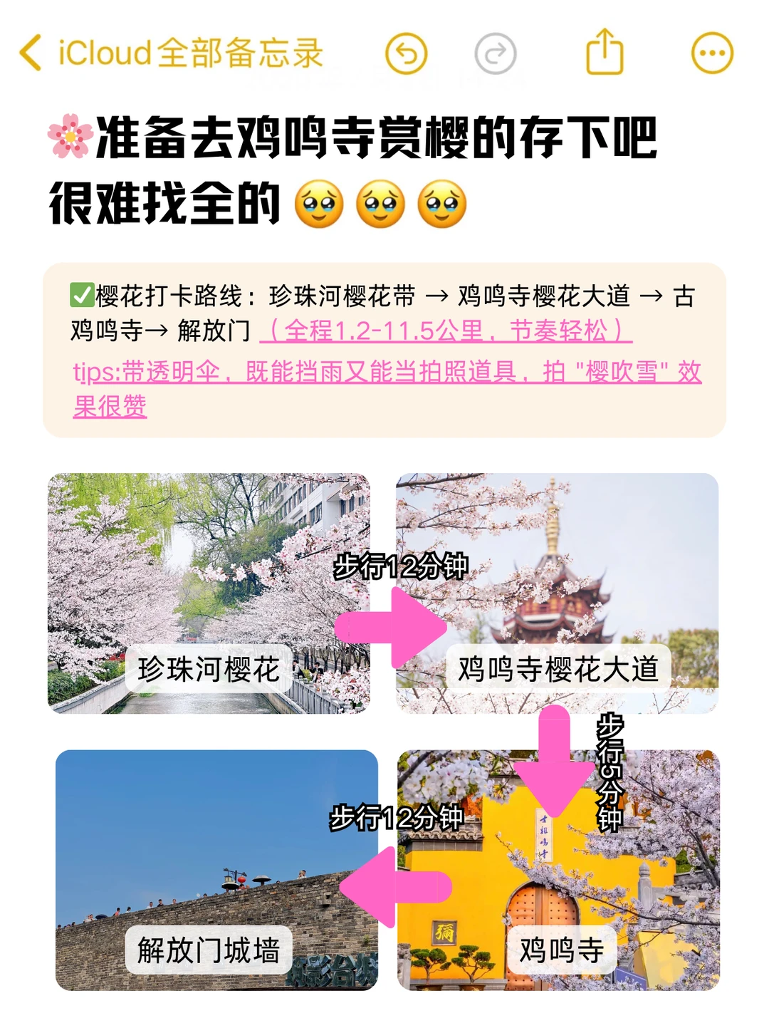 珍珠河樱花带 → 步行 12min → 鸡鸣寺樱花大道 → 步行 5min → 古鸡鸣寺 → 步行 12min → 解放门城墙