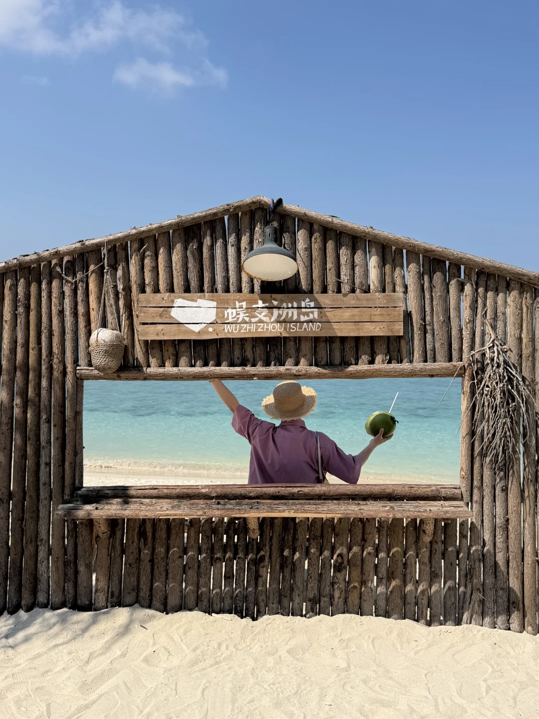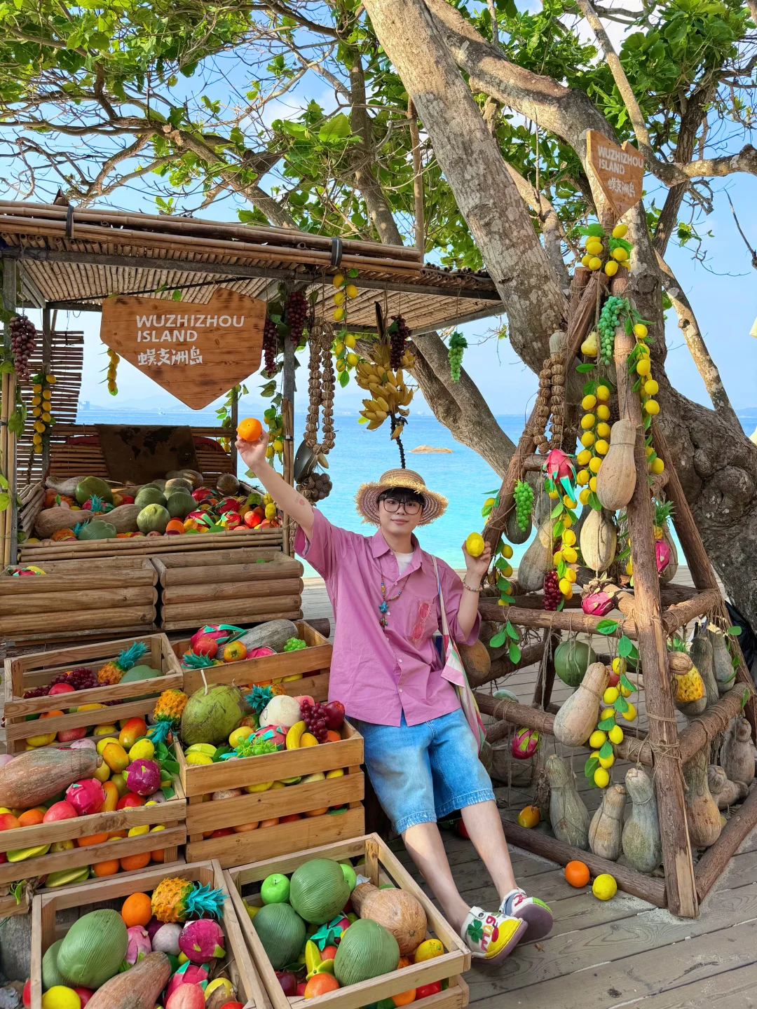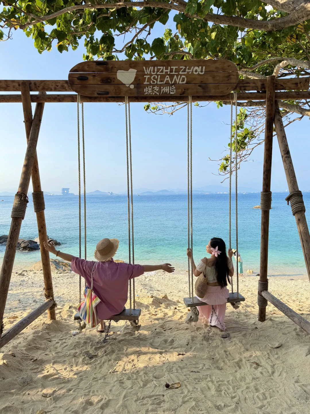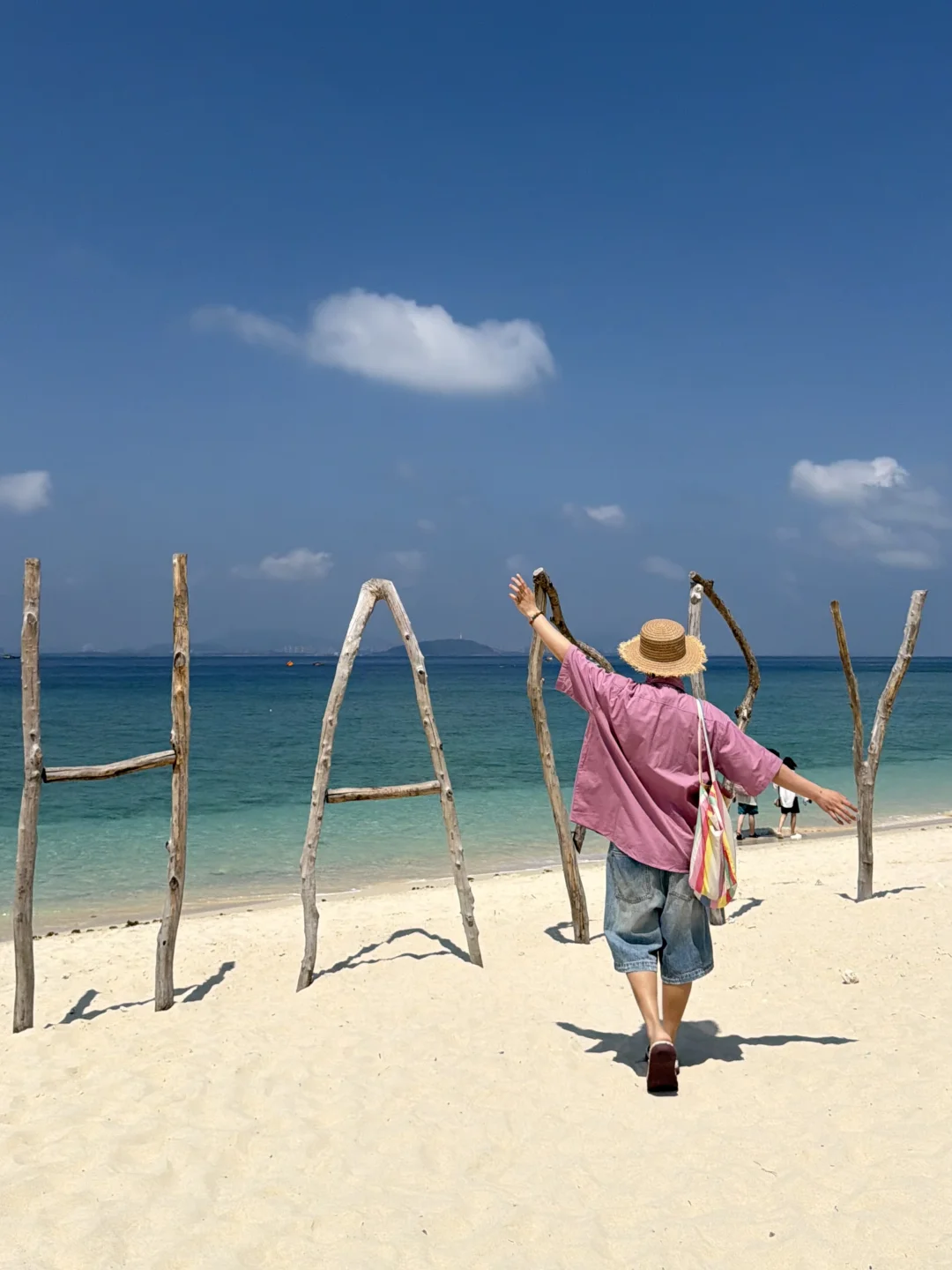 蜈支洲岛一日游打卡! 不坐接驳车路线,也很出片🌊 📍步行路线约2公里 进岛左转 看到星巴克指引直走 1️⃣happy树枝打卡拍照 2️⃣私人订制同款取景地 3️⃣情人岛(水果摊、秋千打卡) 拍完之后原路返回下岛!