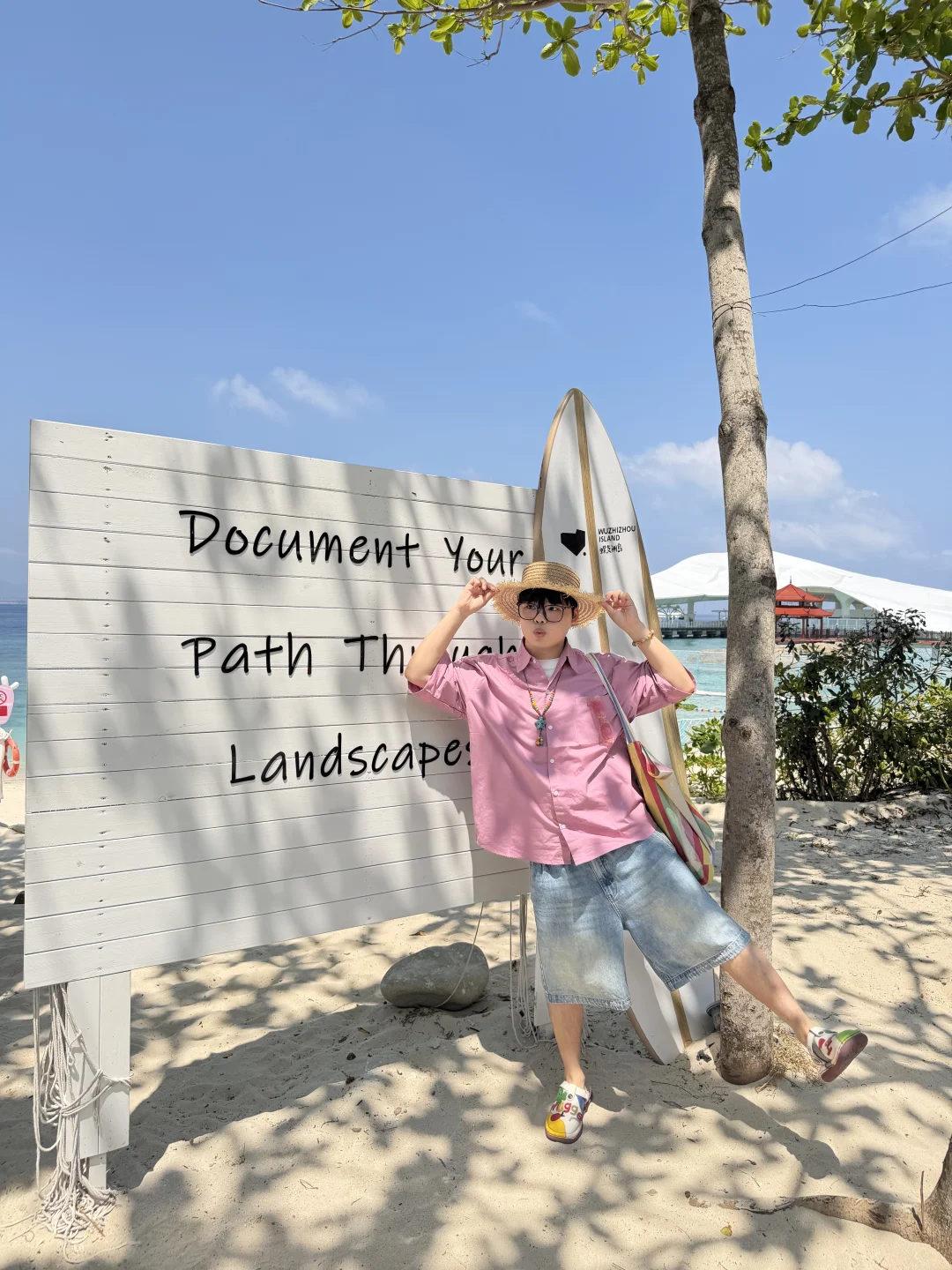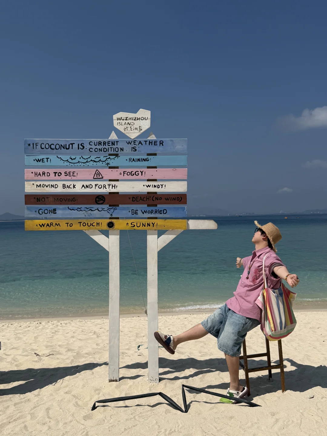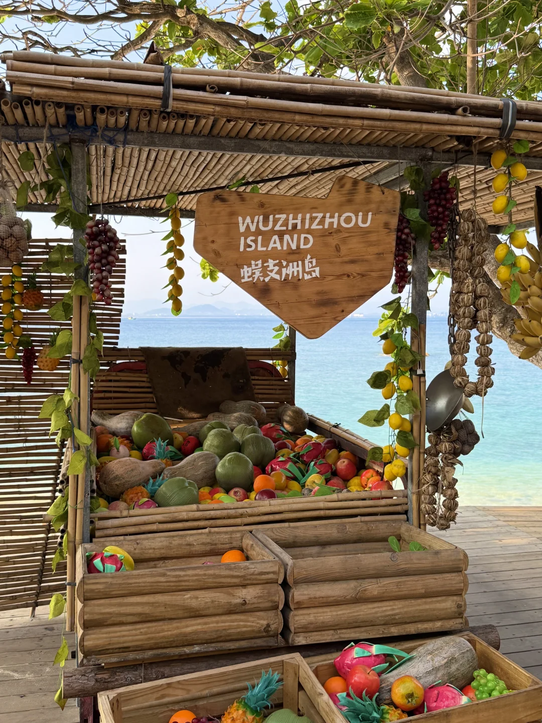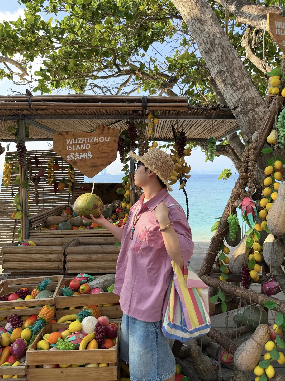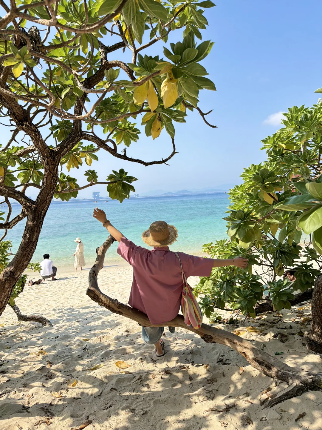 蜈支洲岛一日游打卡! 不坐接驳车路线,也很出片🌊 📍步行路线约2公里 进岛左转 看到星巴克指引直走 1️⃣happy树枝打卡拍照 2️⃣私人订制同款取景地 3️⃣情人岛(水果摊、秋千打卡) 拍完之后原路返回下岛!