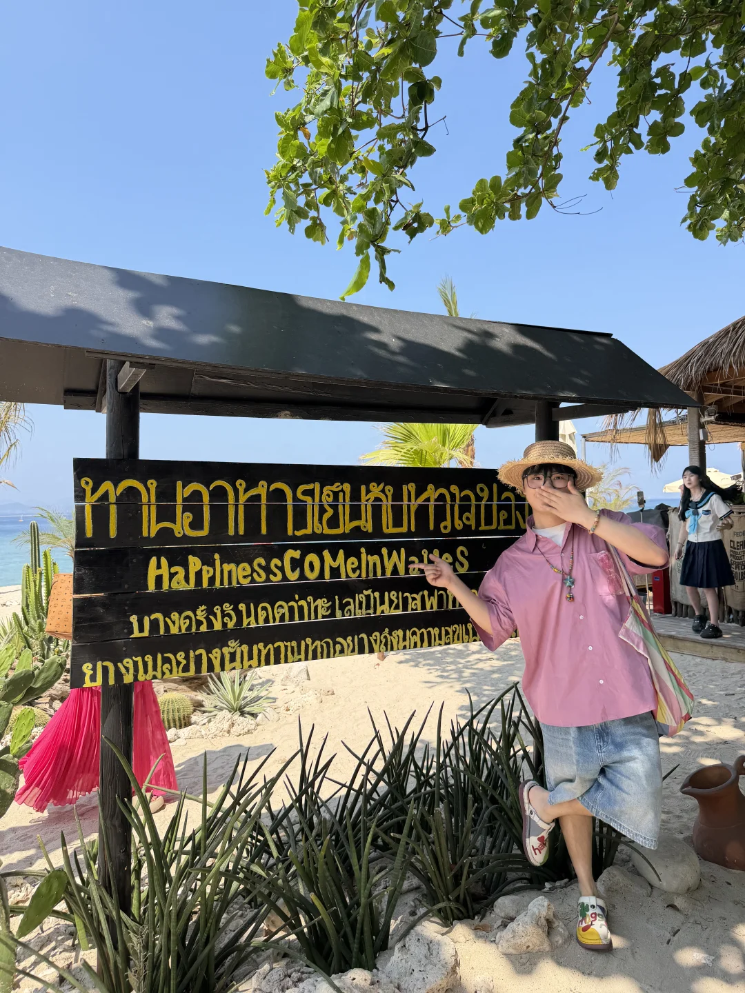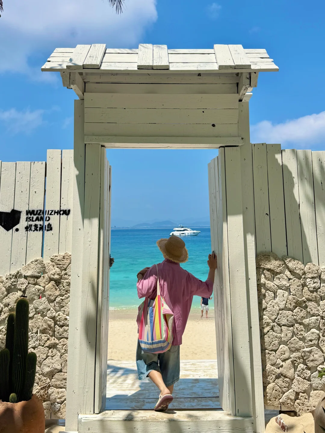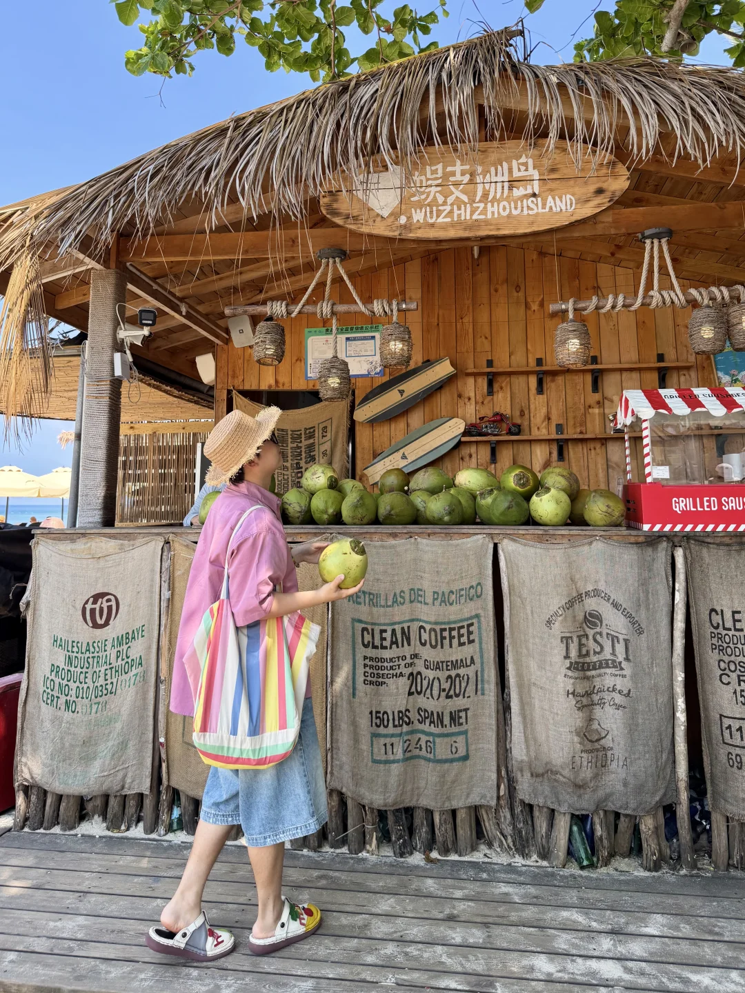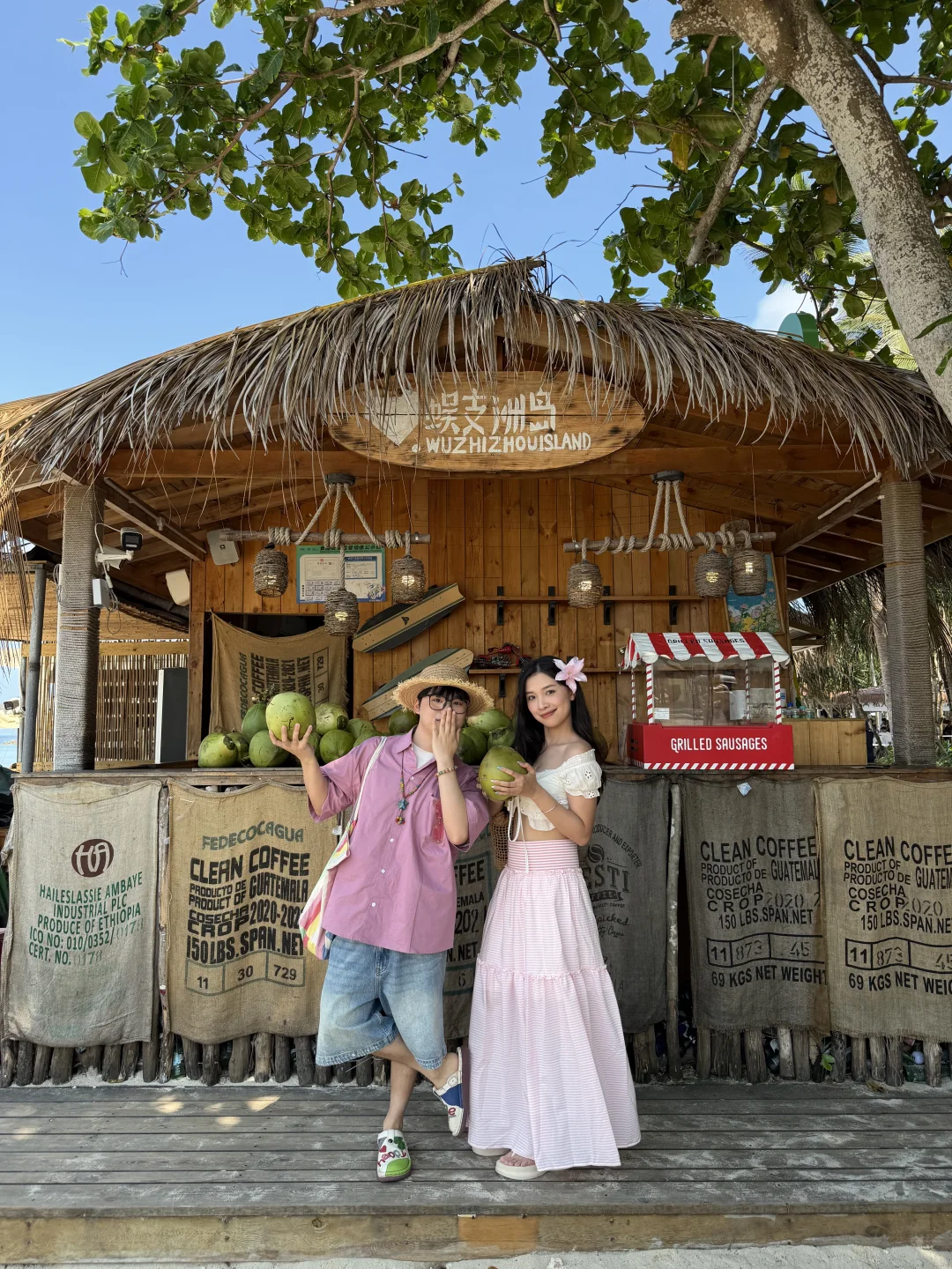 蜈支洲岛一日游打卡! 不坐接驳车路线,也很出片🌊 📍步行路线约2公里 进岛左转 看到星巴克指引直走 1️⃣happy树枝打卡拍照 2️⃣私人订制同款取景地 3️⃣情人岛(水果摊、秋千打卡) 拍完之后原路返回下岛!