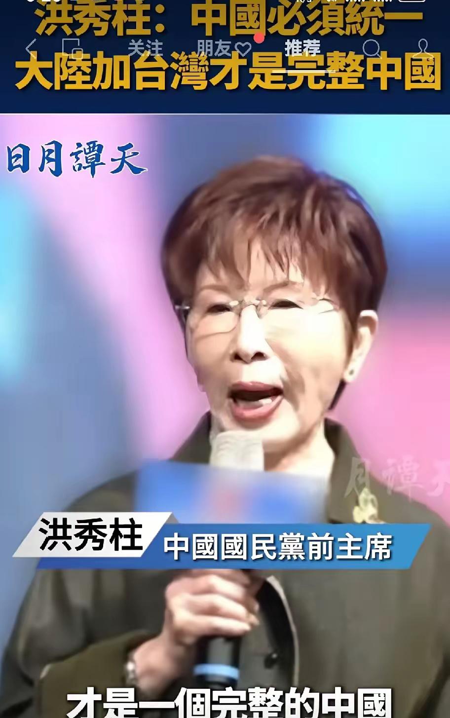 洪秀柱铿锵发声:大陆加台湾才是完整中国,中国必须统一! 洪秀柱今天这话说得太硬气了,直接把“台独”的老底给掀了。她说大陆加上台湾才是一个完整的中国,这话听着就提气,不像有些人整天遮遮掩掩,她这是把大实话说出来了。 她可不是今天才这么说,这些年她一直坚持两岸必须统一。她说“台独”就是死路一条,是拉着台湾老百姓往火坑里跳。这话一点没错,台湾要是真“独立”了,那还能有好日子过吗?肯定得打起来,到时候吃亏的还是老百姓。 洪秀柱还说了,两岸不统一,台湾就没有未来。这话说得在理,现在大陆发展这么快,台湾要是能搭上这趟车,大家的日子肯定能过得更好。要是非要跟大陆对着干,那才是真的傻。 有网友说,她这次发声,也是给那些还在犹豫的人提个醒:中国必须统一,这是谁也改变不了的大势。 那些想分裂国家的人,最后肯定没有好下场。 笔者认为,咱们就等着看吧,早晚有一天,两岸会真正走到一起。 对此,你怎么看呢?
