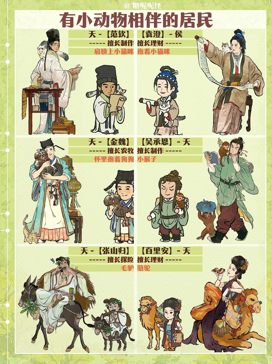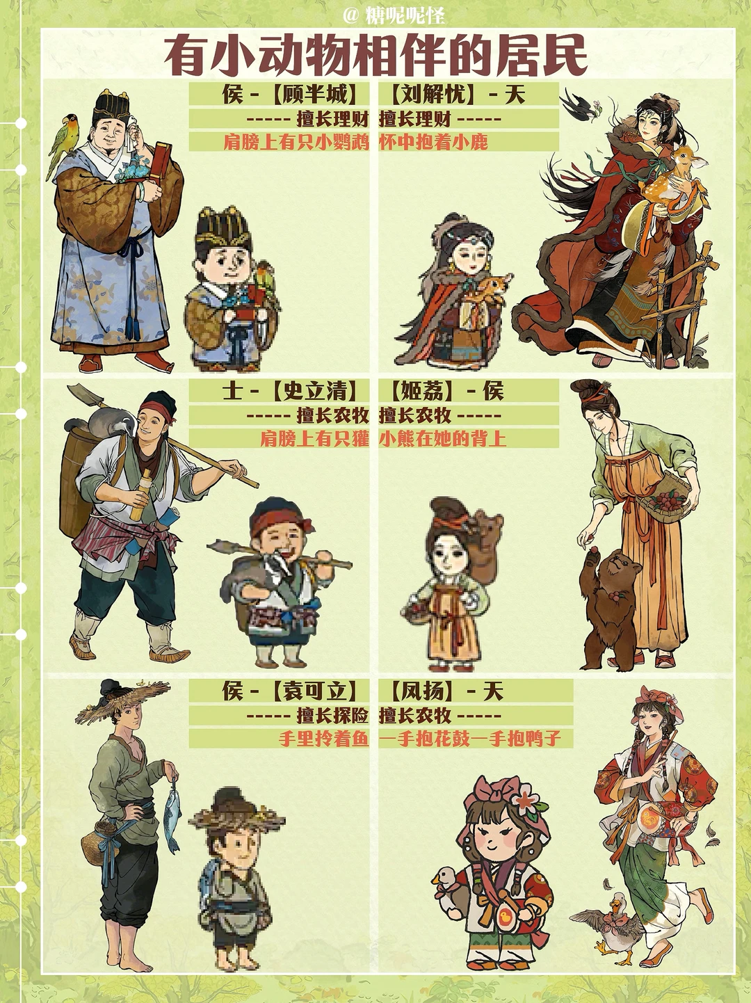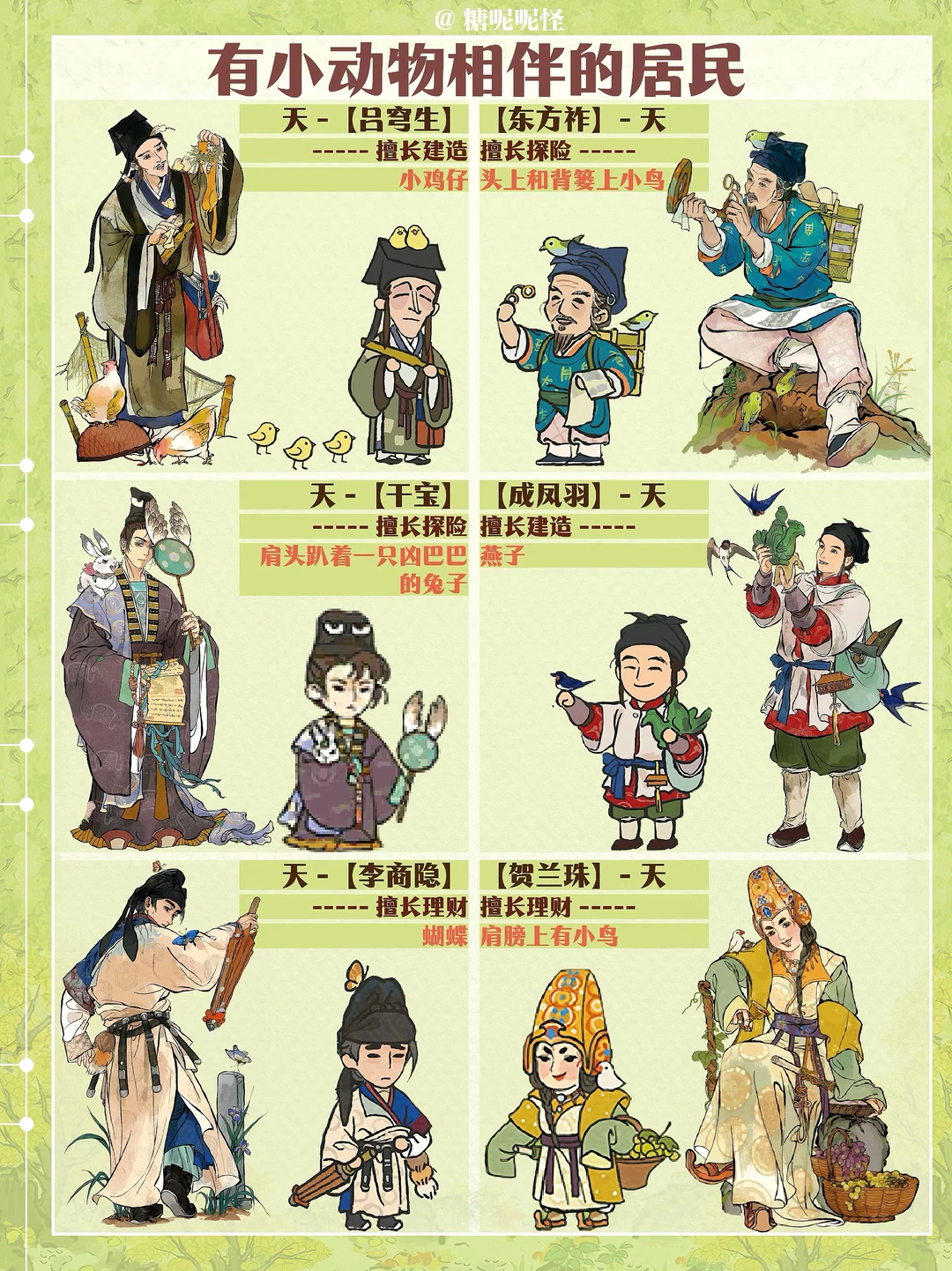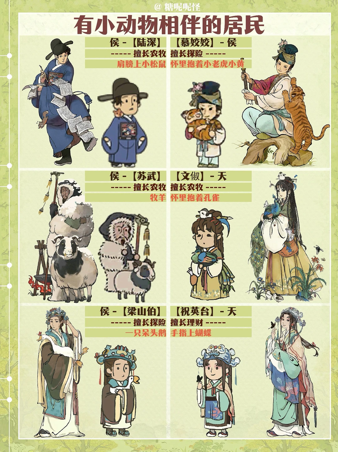 很喜欢有小动物相伴的居民……闲人也是(闲人下次出) 吕穹生的小鸡仔|东方祚的小绿鸟|干宝的小兔|成凤羽的燕子|李商隐的蝴蝶|贺兰珠的小白鸟|范钦和袁澄的小猫咪|金魏的狗狗|张山归的毛驴|百里安的骆驼|顾半城的小鹦鹉|刘解忧的小鹿|史立清的獾|姬荔的小熊|凤扬的小鸭子|陆深的小松鼠……