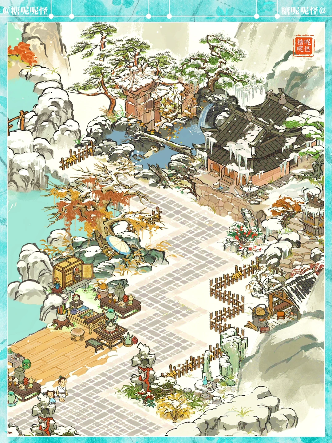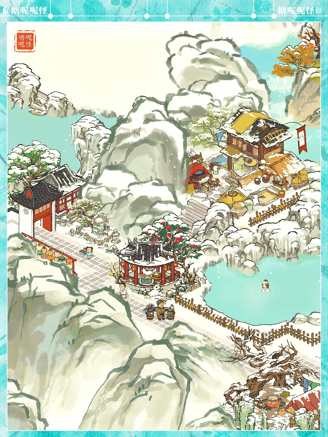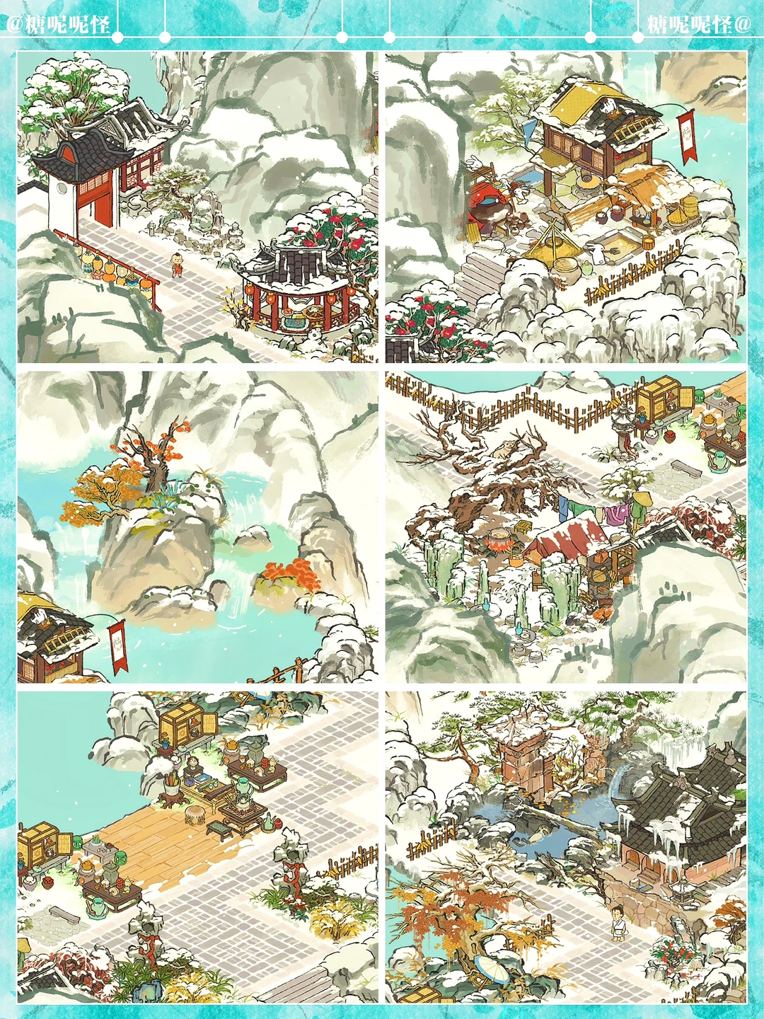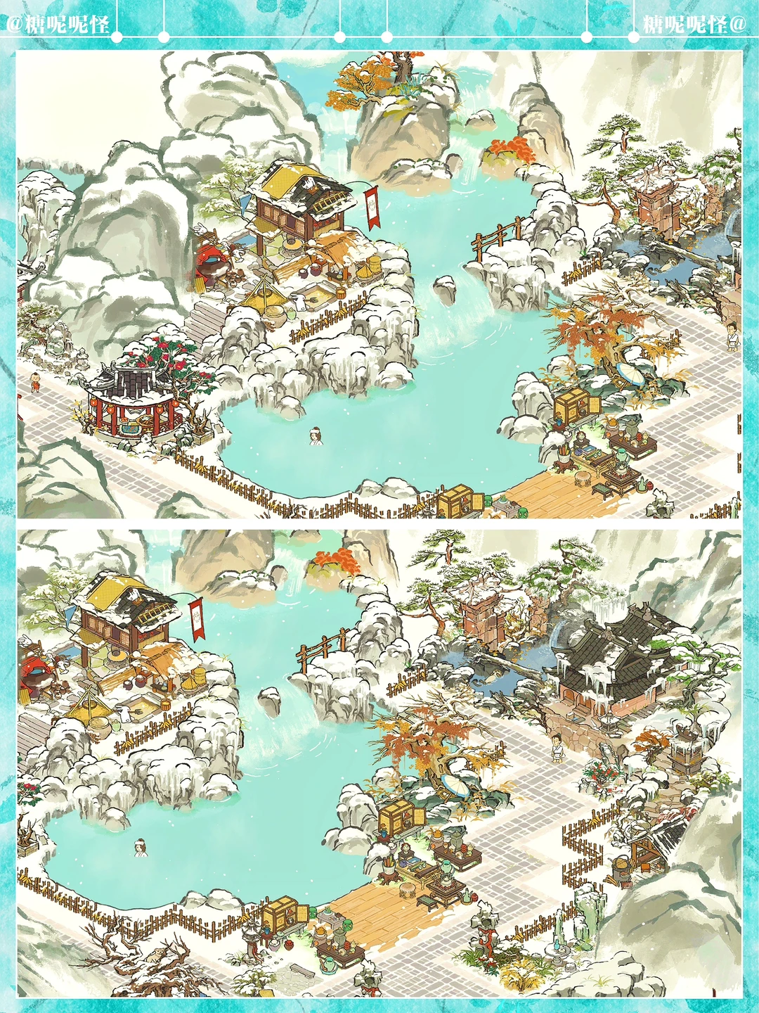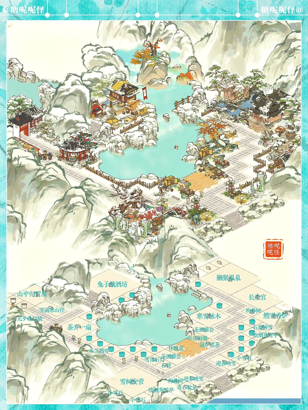 地点:白雪镇·迷雾塘 建筑:獭聚温泉|长生宫|雪树安营|寒雪枯木|兔子酿酒坊|燃雪香炉|炊烟升雪亭|迎春映雪|雪满寒山径|茶酒雅会|茶开一扇|山中归雪屋