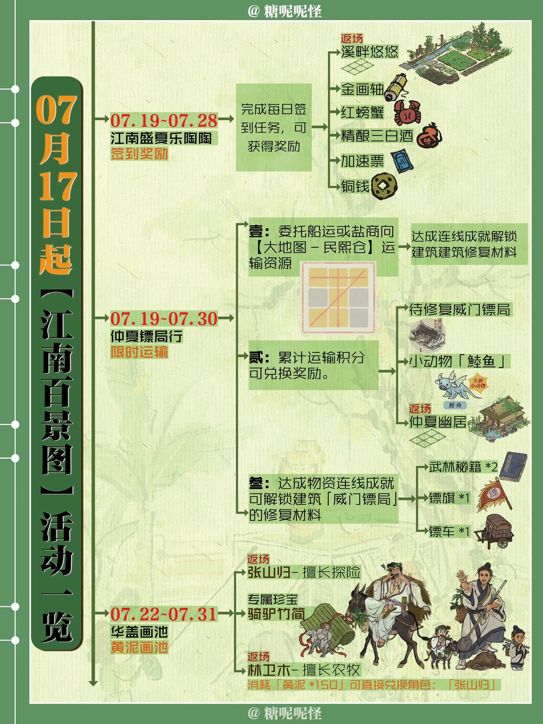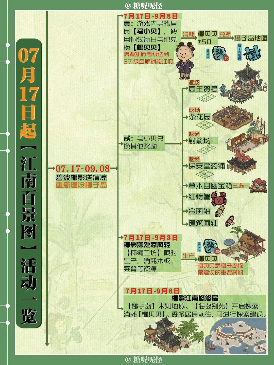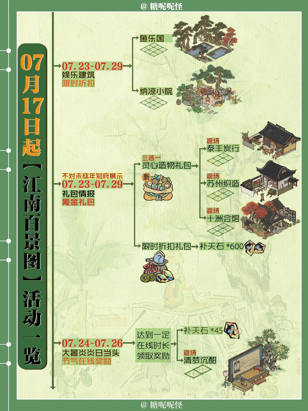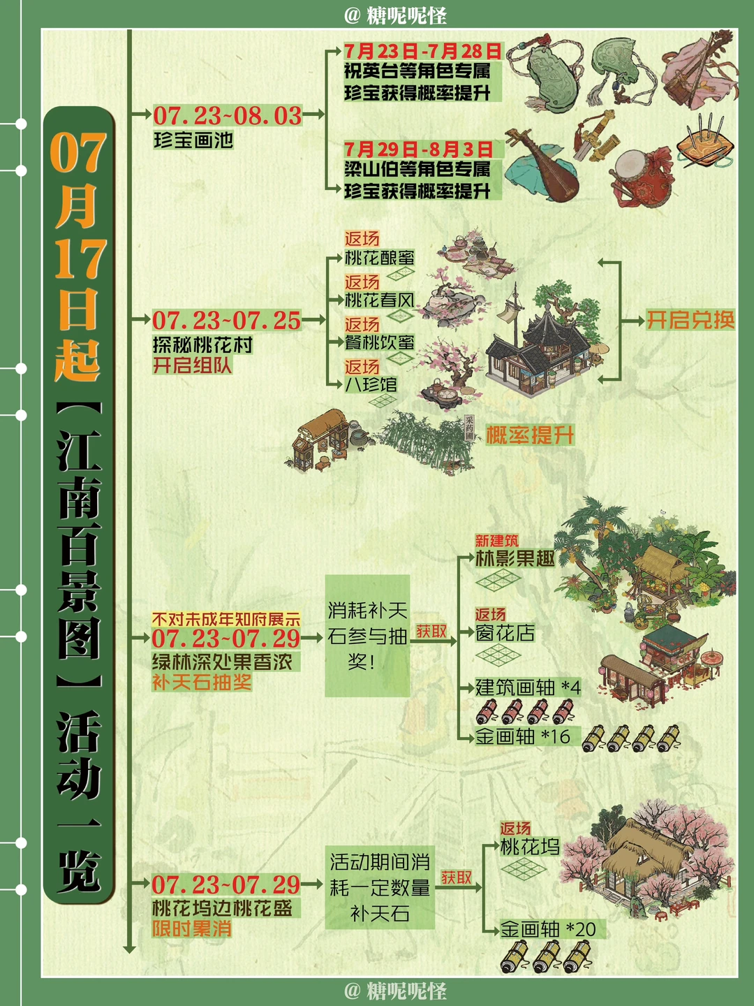 1️⃣新建筑:林影果趣 2️⃣新动物:鯥(lù)鱼 3️⃣椰子岛返场建设 4️⃣返场建筑:周年贺晏|保安堂药铺|茶花园|射箭场|溪畔悠悠|仲夏幽居|清梦沉酣|桃花坞|窗花店|泰丰炭行|苏州织造|十洲会馆 5️⃣返场人物:张山归|林卫木