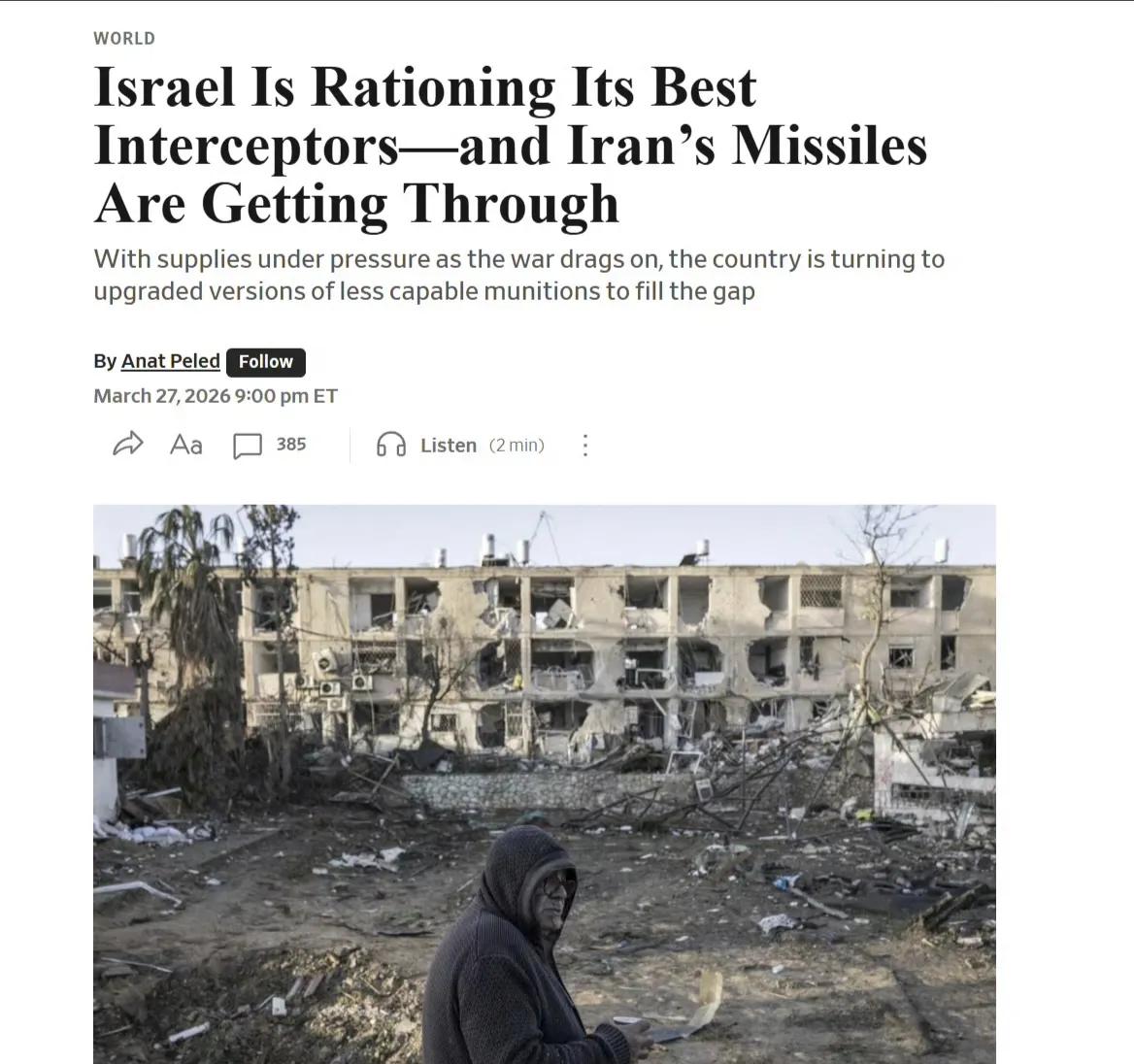 美国《华尔街日报》报道称,以色列军方已开始对其“箭”-3和“箭”-2反导拦截弹的使用进行限量,对“大卫投石索”和“铁穹”等防空导弹系统的改进型来拦截伊朗导弹,但是效果不好。 显然,以色列已经缺乏“箭”-2/3拦截弹了,反导能力也就随之大幅下降。“大卫投石索”是末端低空反导的,性能还不如美国的“爱国者”PAC-3,拦截导弹自然成功率就不高。至于“铁穹”系统,就是拦截低速火箭弹的,让它去拦截速度在5马赫以上的弹道导弹,和搞笑无异。