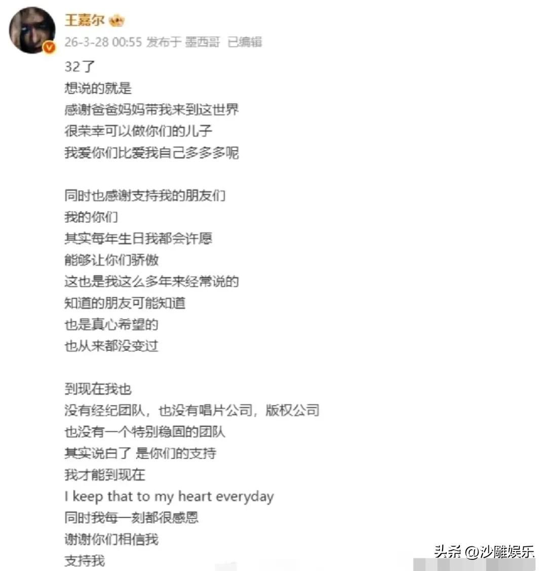 王嘉尔,太让人意外了! 3月28日,王嘉尔在32岁生日这天冲上热搜,不是因为新歌,也不是因为恋情,而是一段让人有点意外的长文。 他说:“到现在我也,没有经纪团队,也没有唱片公司,版权公司,也没有一个特别稳固的团队,其实说白了,是你们的支持,我才能到现在。” 这句话放在别人嘴里,可能是卖惨。但从王嘉尔嘴里说出来,更像是一个人在生日夜里,安静复盘自己走过的路。没有团队、没有公司、没有版权代理,甚至连一个“稳固的团队”都没有,这在娱乐圈几乎是不可想象的。 他不是请不起人,而是——我的东西,我自己来。从音乐制作到舞台设计,从商务对接到行程安排,全自己扛。这种模式,风险大得离谱,但自由度也大到离谱。 很多人看到这段文字,第一反应是“他怎么混成这样”。但仔细想想,一个能在全球开巡演、和各大品牌合作、音乐作品频频出圈的艺人,怎么可能是因为“混不下去”才没有团队?恰恰相反,他是主动选择了这条路。 不签大公司,不走标准流程,音乐想做就做,不想做就停。粉丝催更,他笑着回应,但节奏从不被打乱。这种任性,不是谁都有资格拥有的。 网友评论也很有意思。有人说:“王嘉尔是我见过最清醒的艺人,他知道自己要什么,也知道自己不要什么。” 也有人调侃:“他不是没有团队,他的团队叫‘王嘉尔本人’。” 还有人感慨:“在资本裹挟一切的娱乐圈,他活成了一个独立工作室。” 当然,也不乏担忧的声音:“一个人扛所有,压力得多大啊。” 仔细看他的长文,他说“是你们的支持”,但没说的是“只有你们”。他没有否认粉丝的重要性,但也没有把自己塑造成孤军奋战的悲情角色。他只是在陈述一个事实:没有团队托底,每一份支持都是直接接住他的人。这种感谢,说得很轻,但分量很重。 从韩国出道到回国发展,王嘉尔始终是那个“不太合规矩”的人。他不按常理出牌,却每一步都踩得稳。32岁,他还在用自己的方式证明:不靠团队,也能走得远。只不过这条路,走得比别人更孤独,也更自由。 或许,这才是真正的“顶流”——不是粉丝多、资源好,而是有底气说“我一个人也可以”,并且真的做到了。