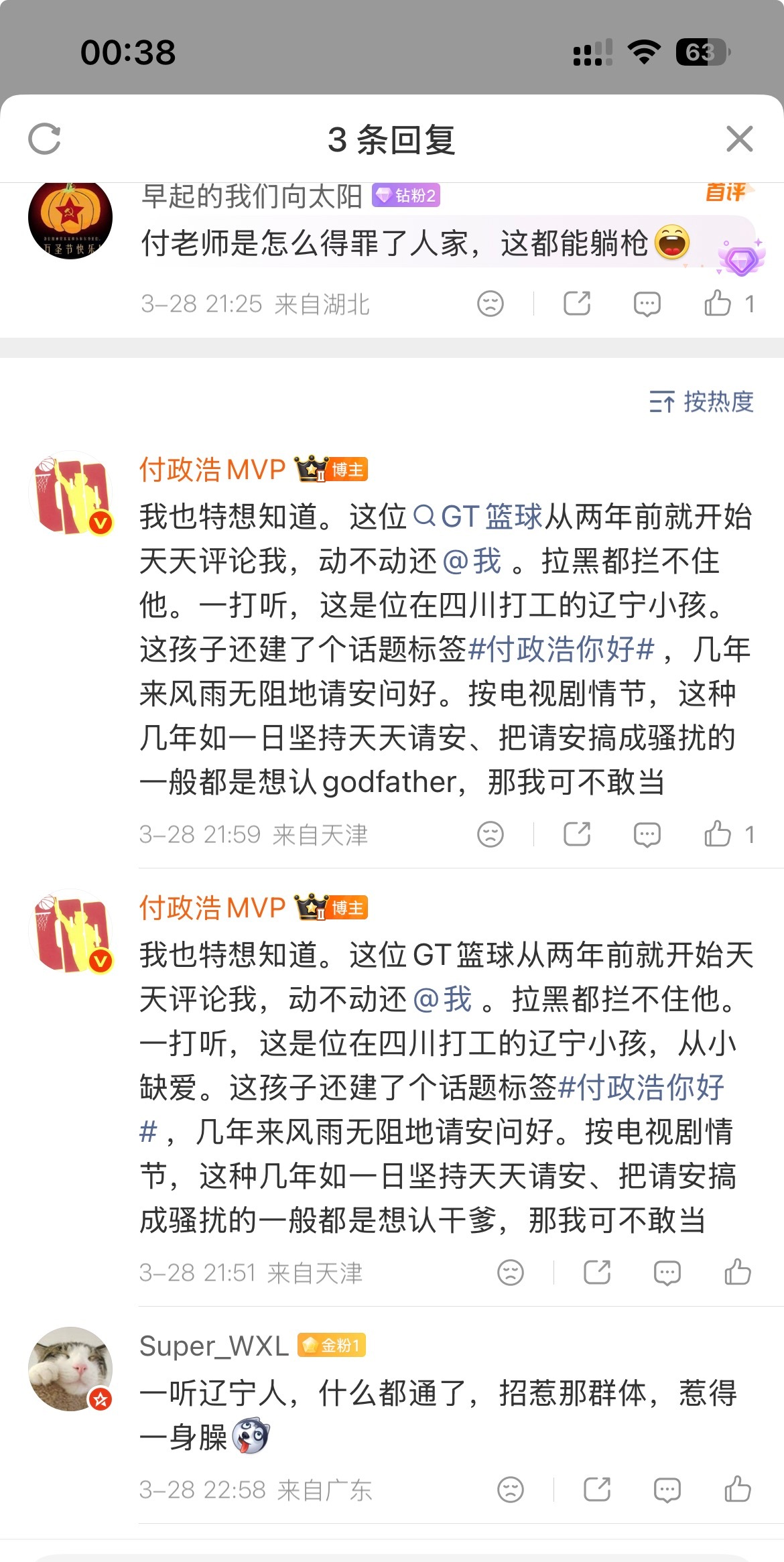 你找谁打听我的?我听听,哈哈哈哈…那我是干啥的?来四川打工哈哈哈。祖国大好河山,我乐意去哪儿就去哪儿用你阴阳怪气?我就算捡破烂也比你强,至少赚的钱堂堂正正我咋记得是有人问我能不能跟你和解,我说的是不可能,因为你这人屁股太歪…我也不吃篮球这碗饭,不靠篮球挣钱。我在微博赚过一些奥运会广告的钱,那也是前年,现在不找我,我也无所谓,我还能因为这点小钱卑躬屈膝了?我不混篮球圈,没啥“人情世故”能奈何我。我不差篮球圈里的这三瓜两枣,没啥💰的方面让我低头…我就说真话,不服你起诉我吧