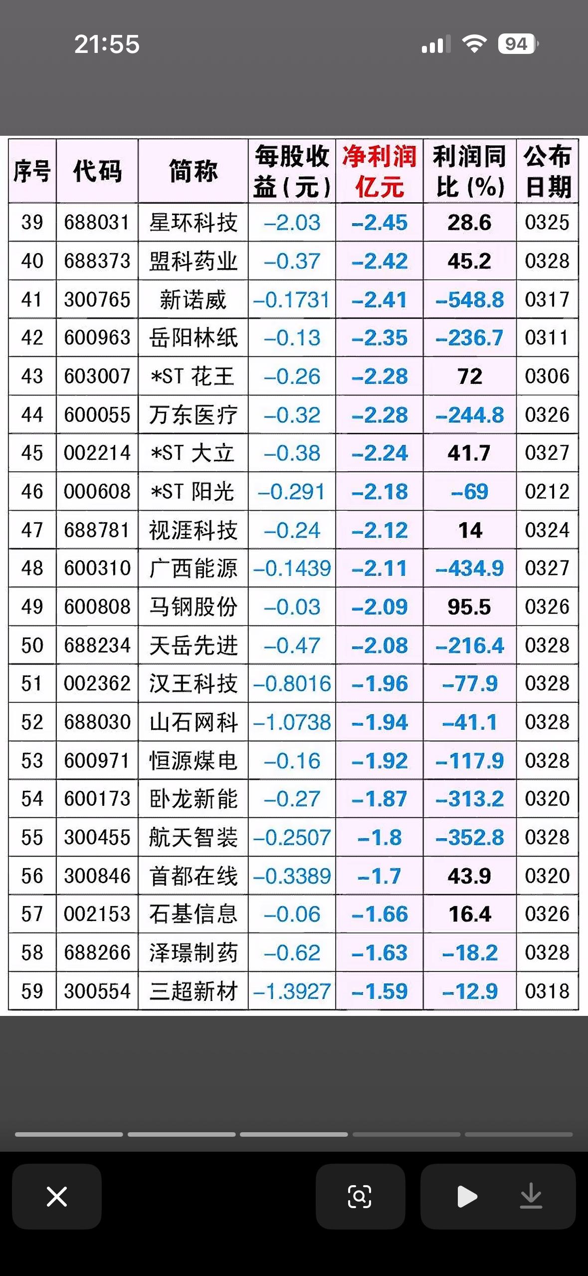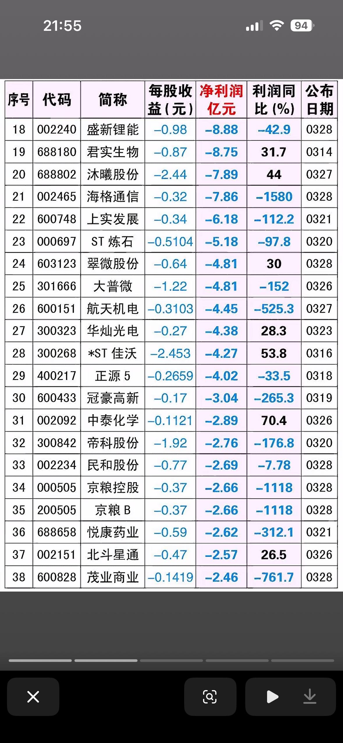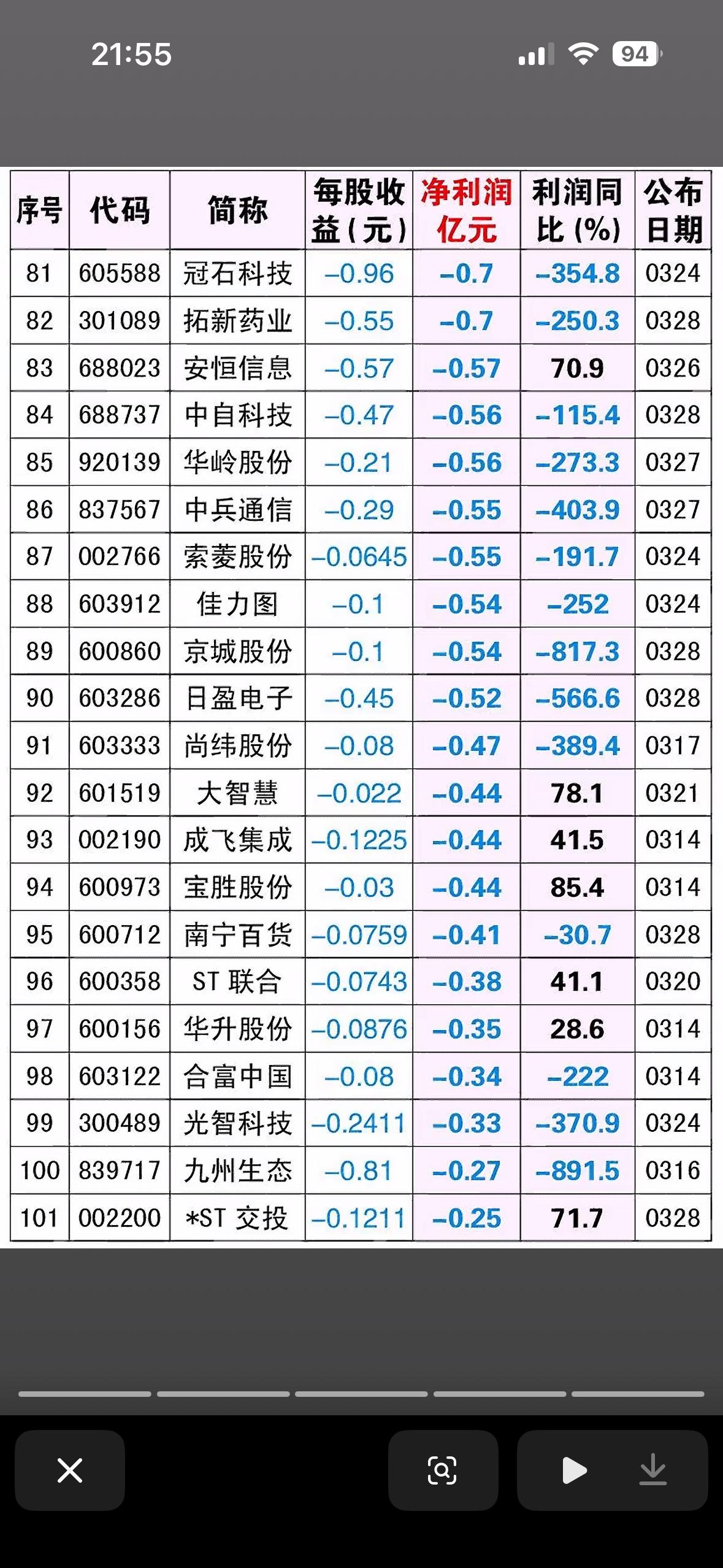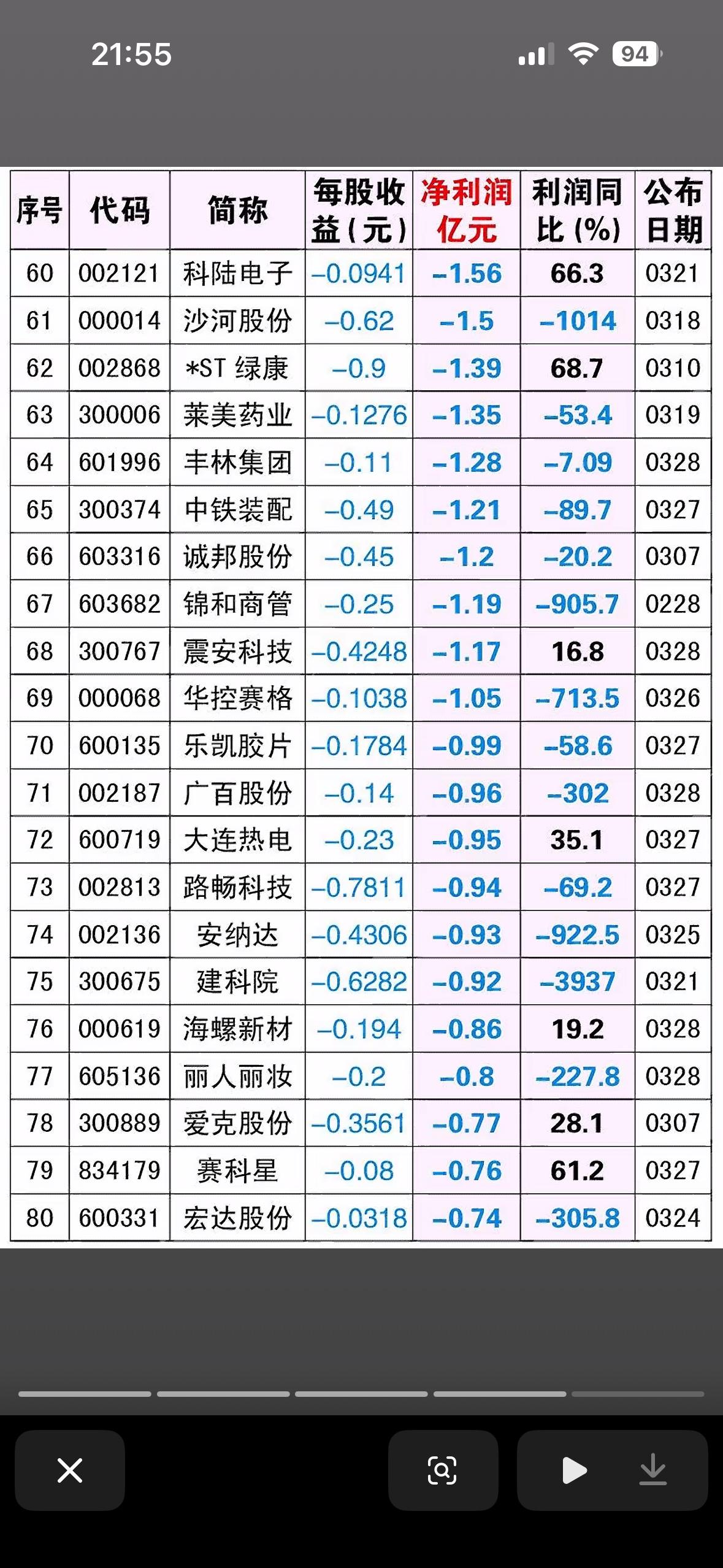 2025年年报亏损股排行榜 2025年年报亏损股排行榜里有不少让人惊掉下巴的公司。周末多家公司发布2025年报,有4家亏损超10亿。汽车龙头广汽集团亏得最狠,营收956.62亿,却亏损87.84亿,行业价格战、销量不佳、成本上升等都是亏损原因。北辰实业属房地产开发行业,营收60.6亿,亏损29.88亿,房地产市场调整让它压力山大。东江环保主营危废处理,营收34.57亿,亏损12.32亿。 还有丽岛新材预计亏2600万 - 3600万,产能爬坡、资产减值等是主因;来伊份预计亏1.7亿左右,门店调整和非经营性损益影响了业绩。投资时可得多留意这些亏损股,小心踩雷。