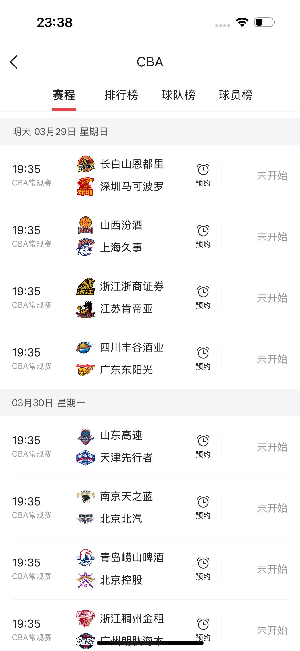 今天是3月29日,星期天,CBA常规赛一共有四场比赛。 19:35,长白山恩都里对阵深圳马可波罗,这场比赛我看好客场挑战的深圳队最终取得胜利✌️!将会迎来球队的七连胜! 19:35,山西汾酒对阵上海久事,上海队能够获得13连胜吗?我怎么觉得不会,毕竟山西汾酒有劲,度数高,容易上头,而且还有人闹它。 19:35,浙江浙商证劵对阵江苏肯帝亚,不用说,浙江队将会迎来球队的七连胜,但愿能够让大秋有时间多休息一下。 19:35,四川丰谷酒业对阵广东东阳光,这是一场实力悬殊的比赛,大家肯定都知道,四川队将会迎来球队的32连败! 今天是休息日,敬请球迷朋友们去观看!