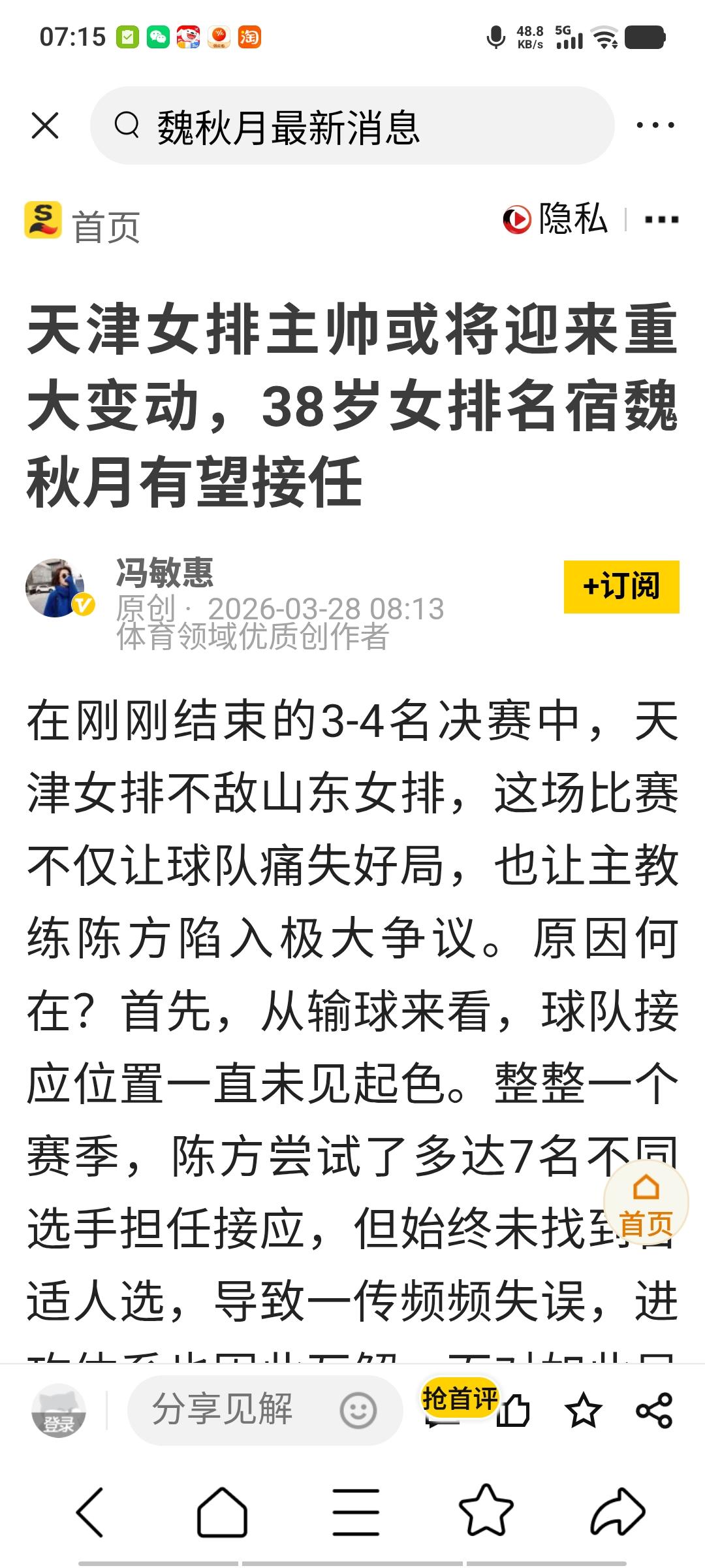 天津女排输给山东后,有人提出要让魏秋月接替陈方。说老实话,今年天津女排已经做的很不错了,巧妇难为无米之炊,缺了李盈莹,王媛媛等名将的情况下,取得第四名,相当不容易,而且还锻炼了新人,半决赛次回合,金局险些掀翻江苏队,差点儿进入决赛,所以不要盲目指责,更不要考虑换人,培养后备力量,搞好青训,排除外界干扰,相信陈方会带领天津女排走出困境,打造成一支过硬队伍。