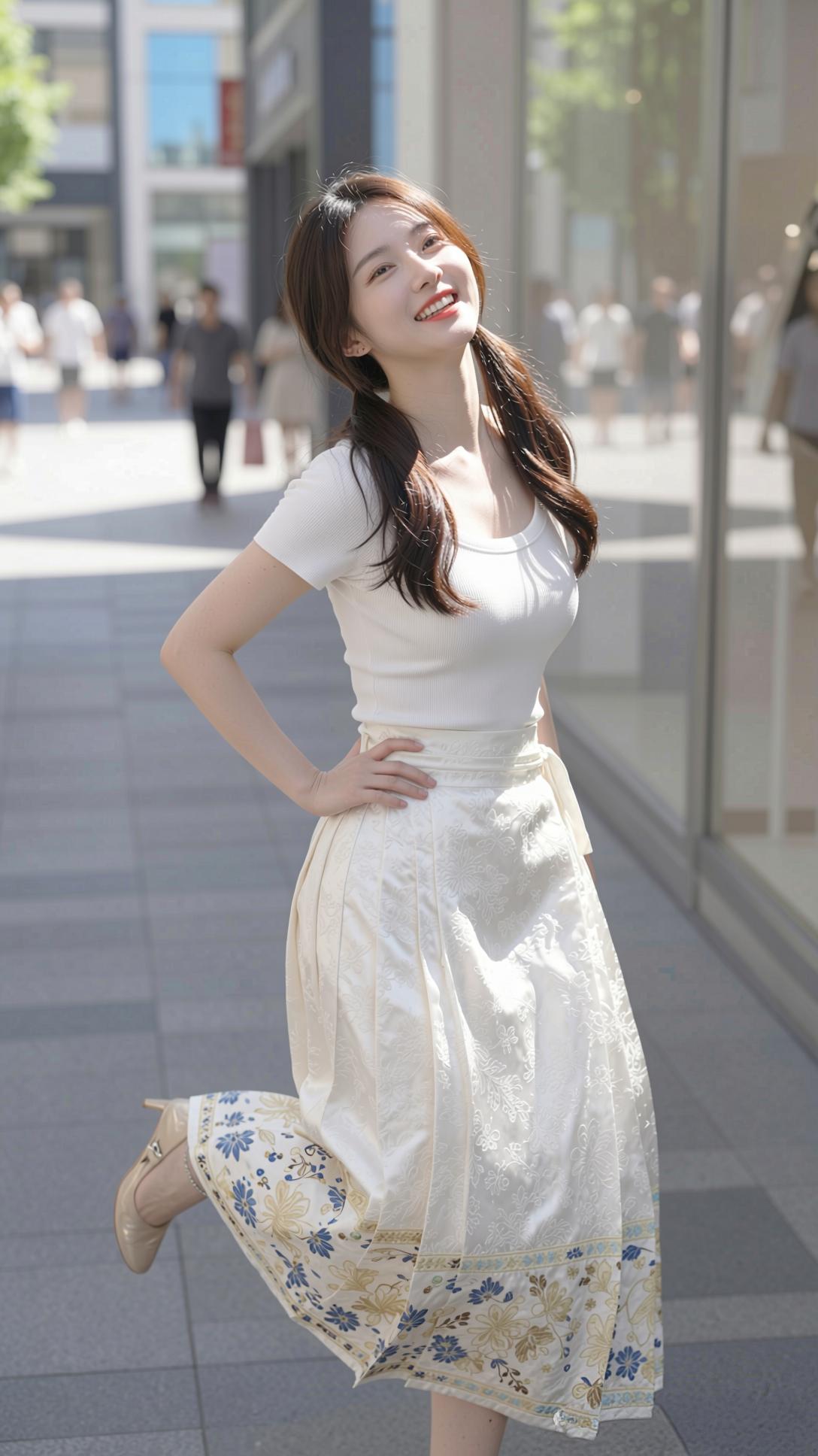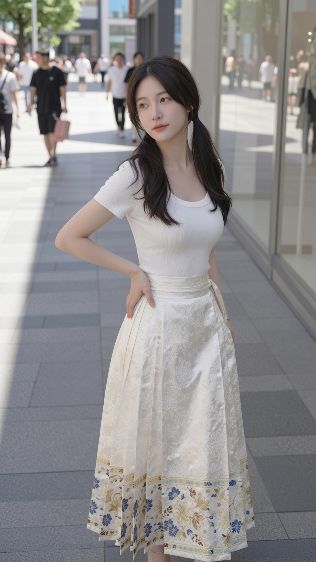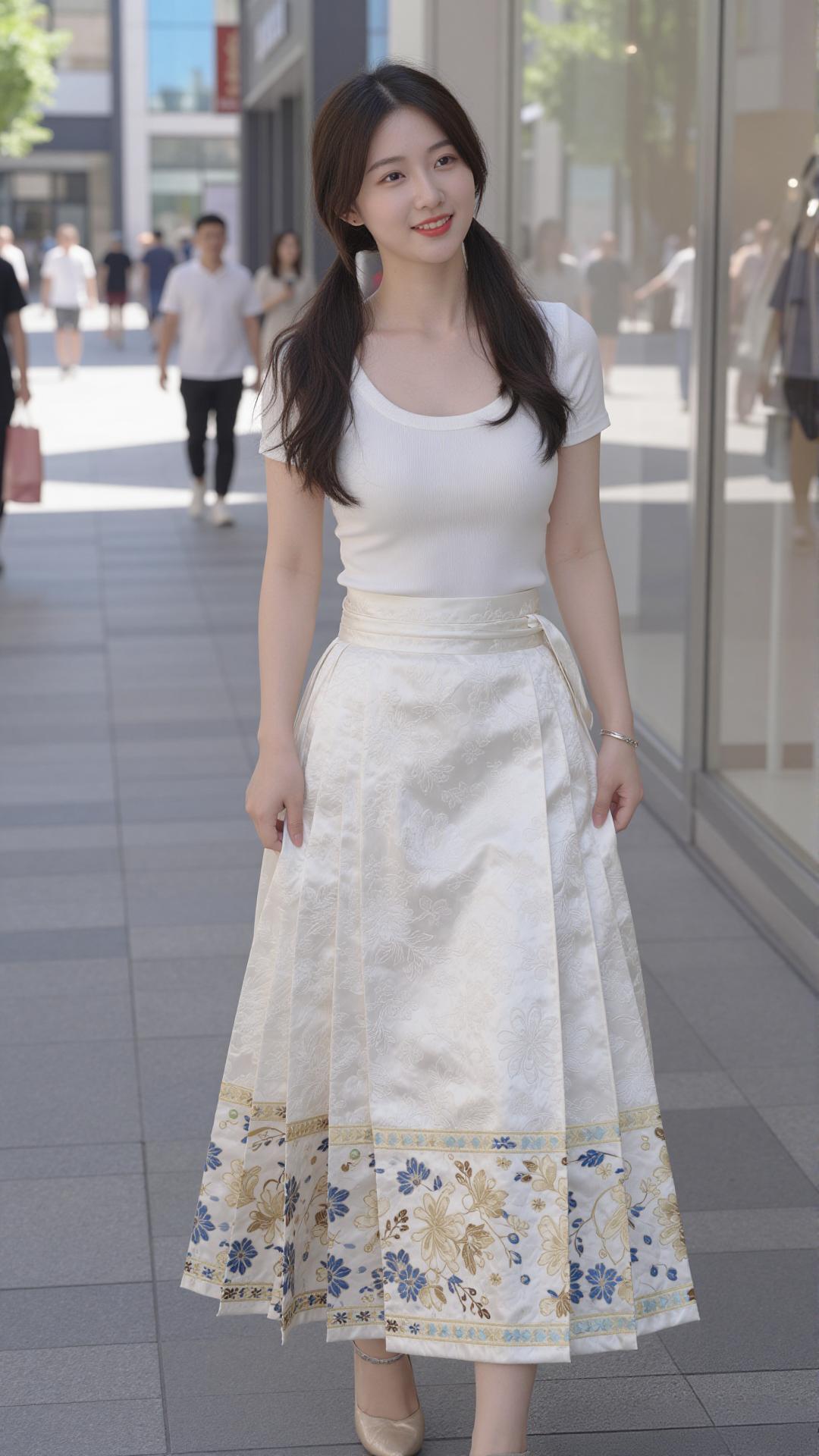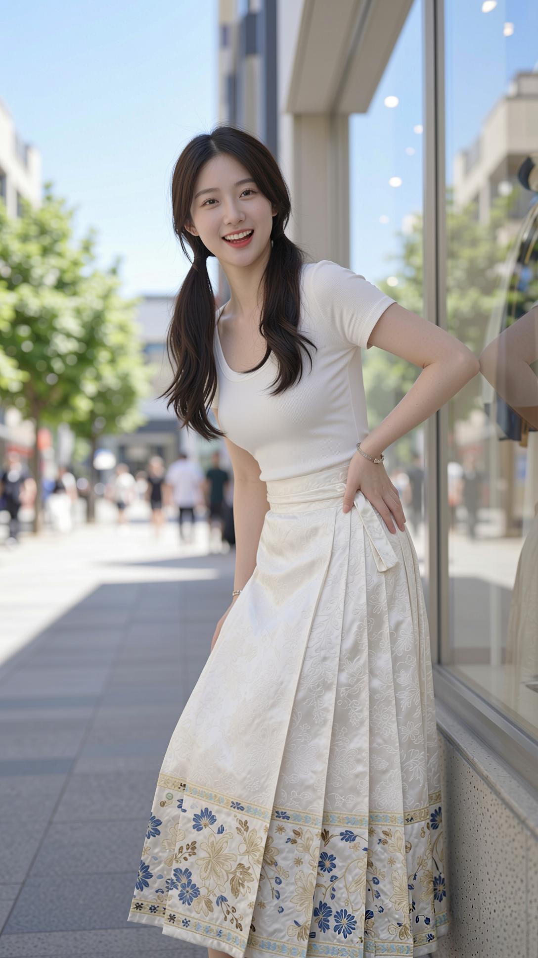 这组照片里的少女,将国风马面裙与现代感完美融合,清新又灵动。 她上身穿着简约的白色修身短袖,勾勒出纤细身形,下身搭配米白色提花马面裙,裙摆处蓝金花卉纹样精致典雅,行走间裙摆飘逸,尽显东方韵味。乌黑长发扎成双马尾,俏皮又减龄,肌肤白皙,眉眼弯弯,笑容明媚动人。 她置身于明亮的都市街头,时而漫步,时而轻提裙摆,时而俏皮摆拍,时而静坐沉思,姿态自然随性。暖调的阳光洒在身上,与清新的穿搭相映,整体画面干净治愈,将少女的青春活力与国风的温婉雅致展现得淋漓尽致。