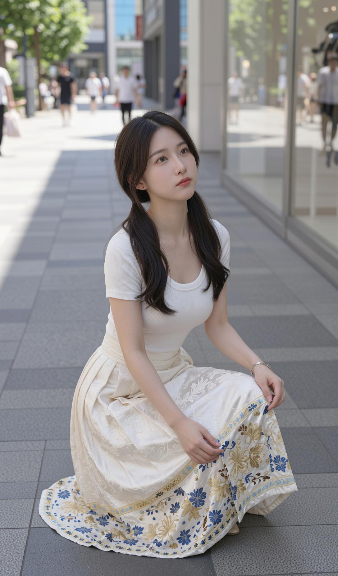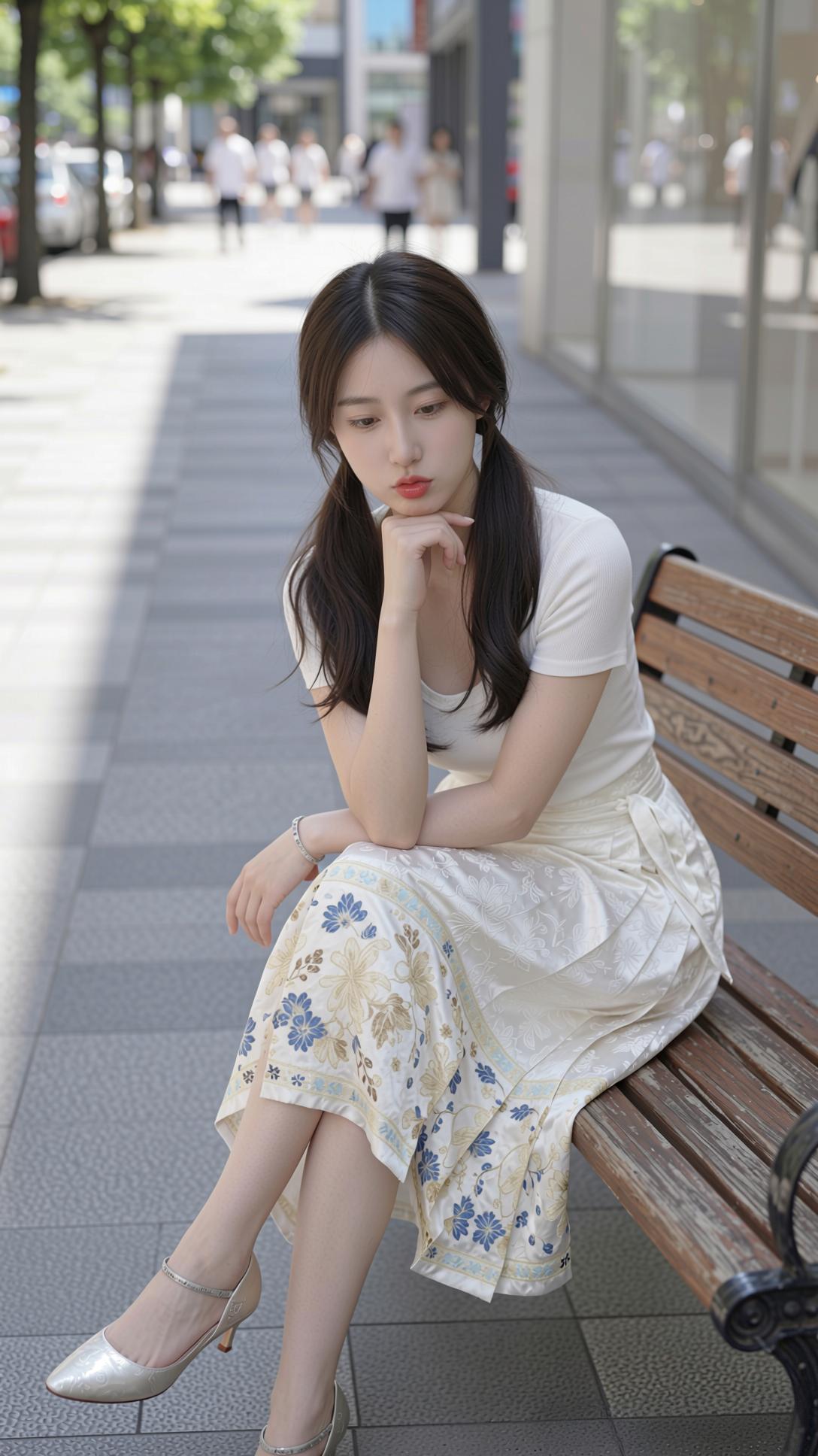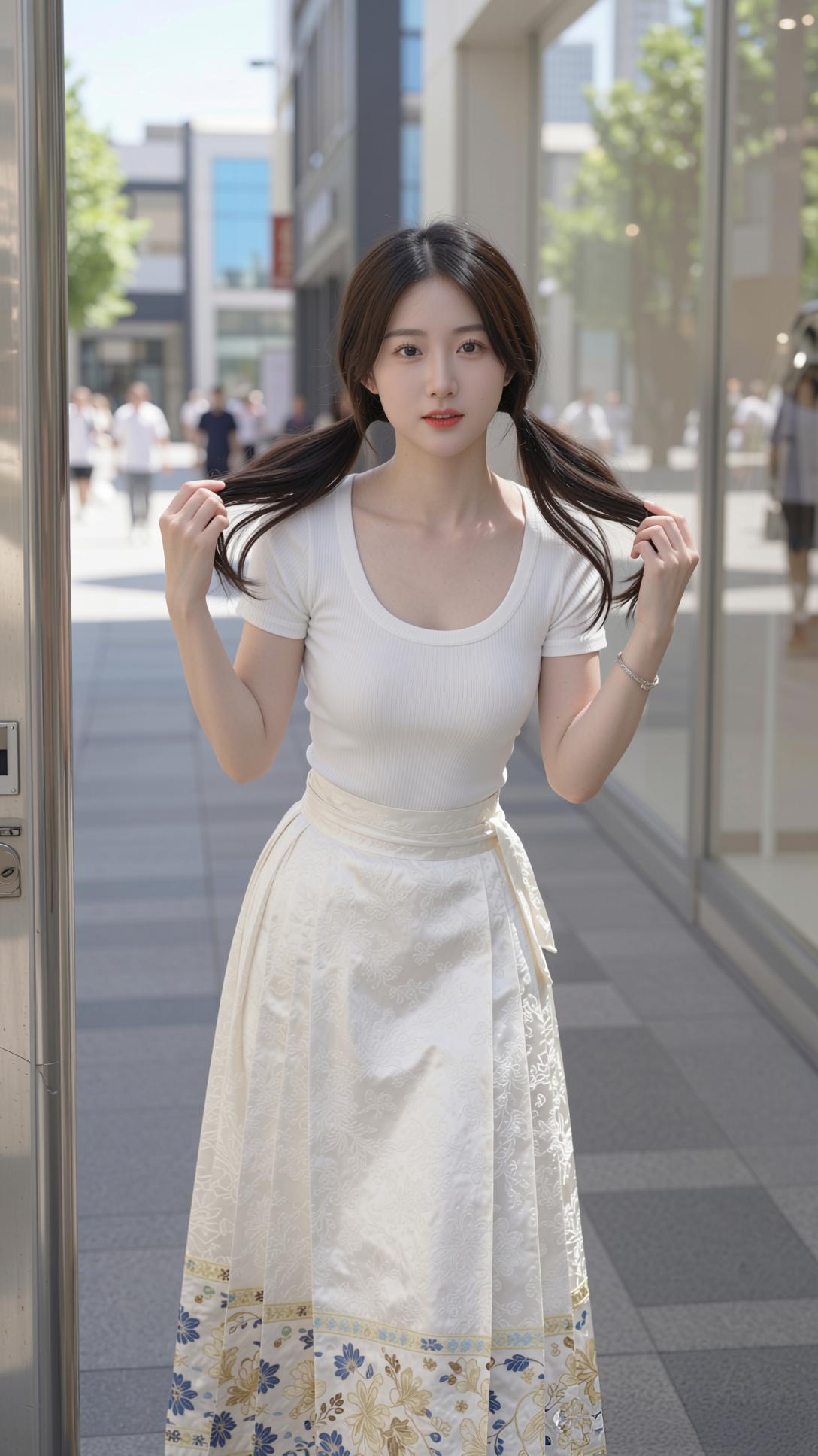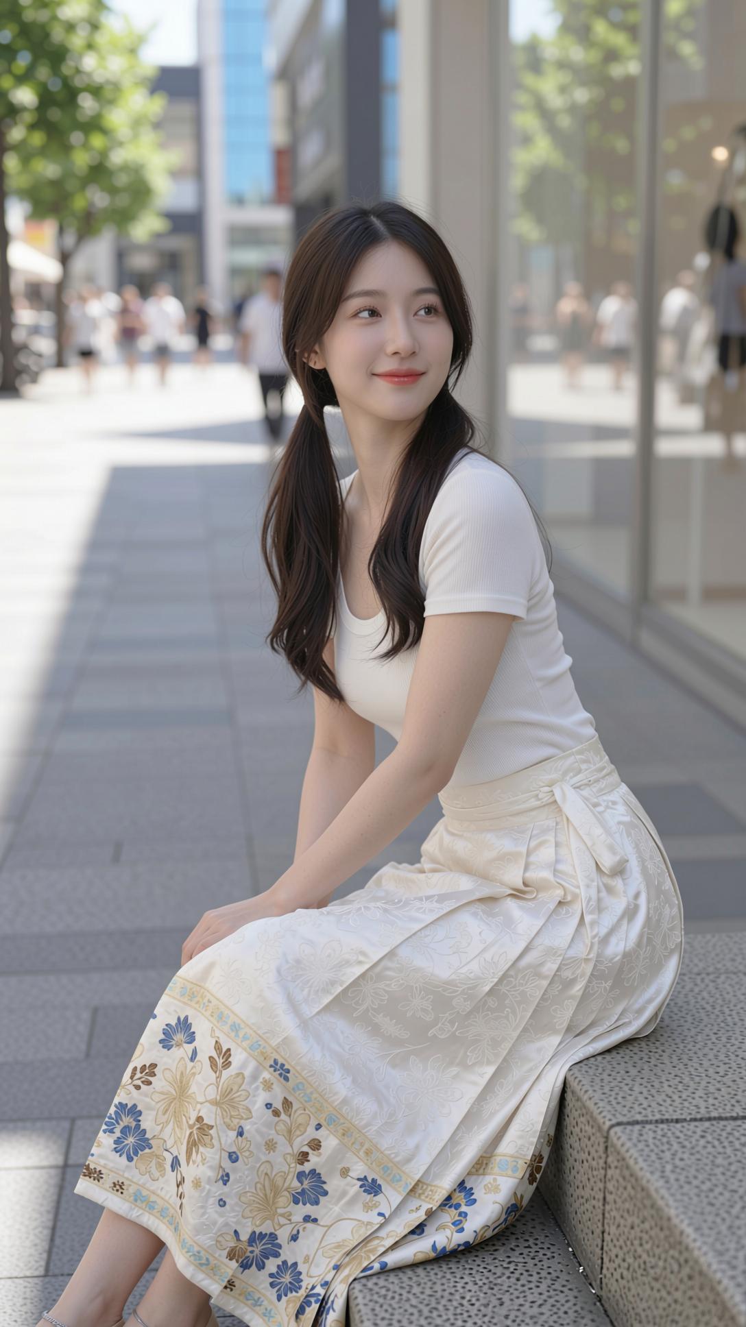 这组照片里的少女,将国风马面裙与现代感完美融合,清新又灵动。 她上身穿着简约的白色修身短袖,勾勒出纤细身形,下身搭配米白色提花马面裙,裙摆处蓝金花卉纹样精致典雅,行走间裙摆飘逸,尽显东方韵味。乌黑长发扎成双马尾,俏皮又减龄,肌肤白皙,眉眼弯弯,笑容明媚动人。 她置身于明亮的都市街头,时而漫步,时而轻提裙摆,时而俏皮摆拍,时而静坐沉思,姿态自然随性。暖调的阳光洒在身上,与清新的穿搭相映,整体画面干净治愈,将少女的青春活力与国风的温婉雅致展现得淋漓尽致。