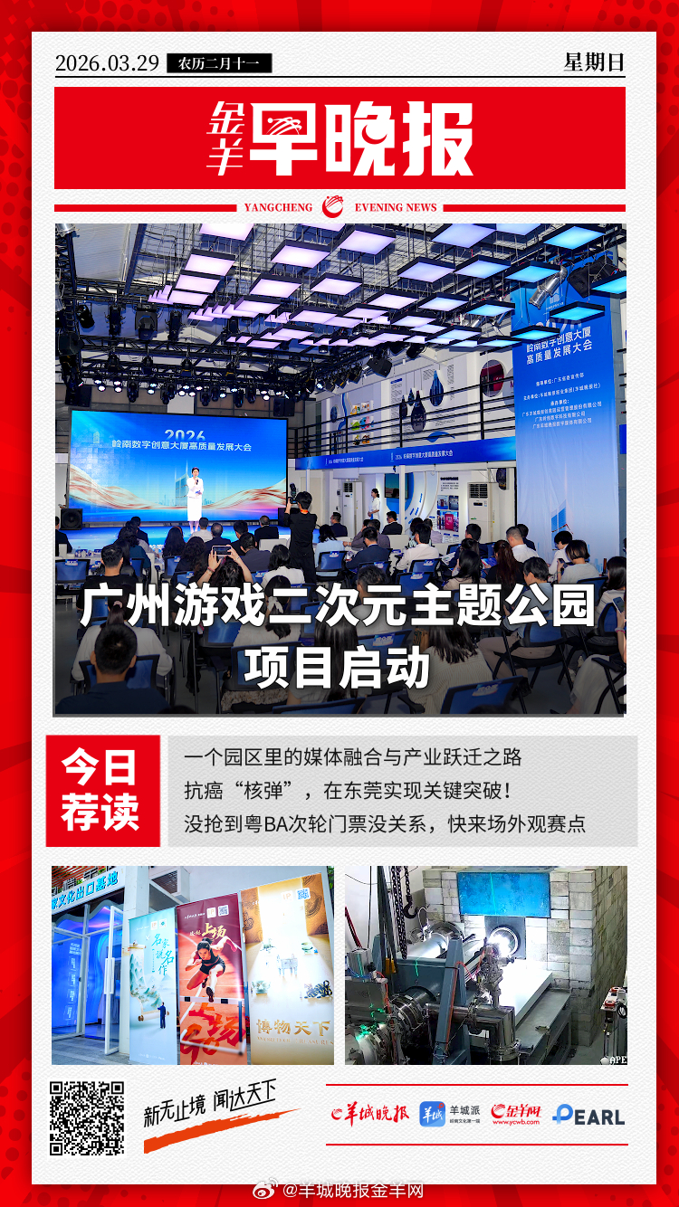 #金羊早晚报# 300+企业、10000+岗位!这场“百千万工程”招聘会企业带着项目来招人;2025年中国科幻产业总营收达1261亿元,连续三年突破千亿大关;从“试验田”到“新高地”:一个园区里的媒体融合与产业跃迁之路;“梅姨”落网背后:一个父亲寻子追凶的21年;男子当街抢劫20余元被判刑3年2个月,并处罚金2000元;广州游戏人自己的二次元主题公园,要来了;“讲信修睦”有了新平台!广州沙河街搭起“街坊议事堂”;抗癌“核弹”,在东莞实现关键突破!美股再度重挫,现货黄金涨2.54%,多品牌金饰逼近1400元/克;没抢到粤BA次轮门票没关系,快来场外观赛点为你的城市加油;#伊朗连遭重创绝地反击##以色列三面受敌# 美“布什”号航母将在中东部署是否意味局势恶化,专家分析;伊朗总统:若基础设施或经济中心遭袭将强烈报复。#女子半年没回家卧室开窗变邻居阳台##女子断碳水2月确诊糖尿病前期##氦气价格暴涨50%# 更多精彩报道,请扫码关注羊晚全媒体报道!