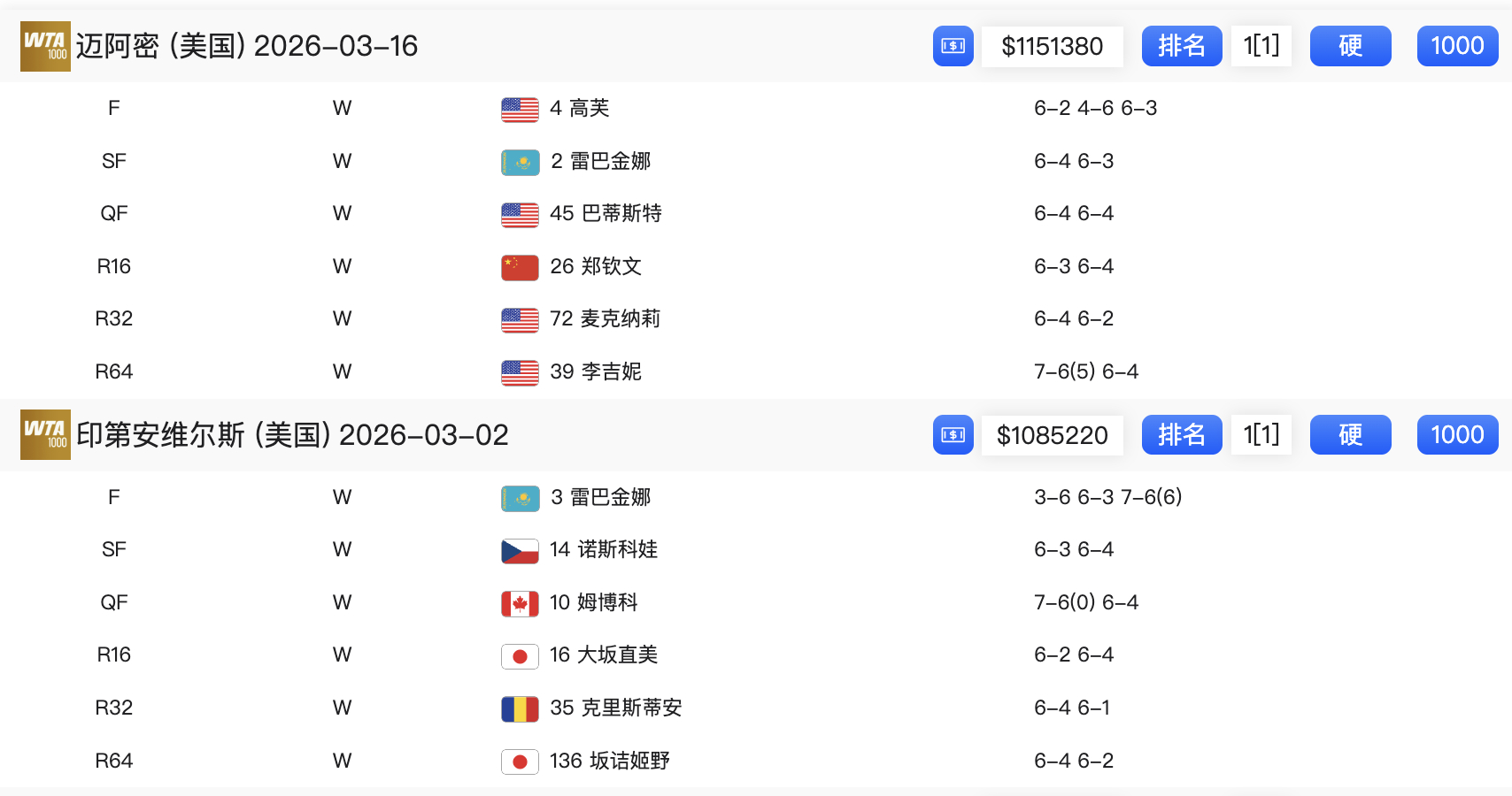 萨巴伦卡卫冕迈阿密赛冠军