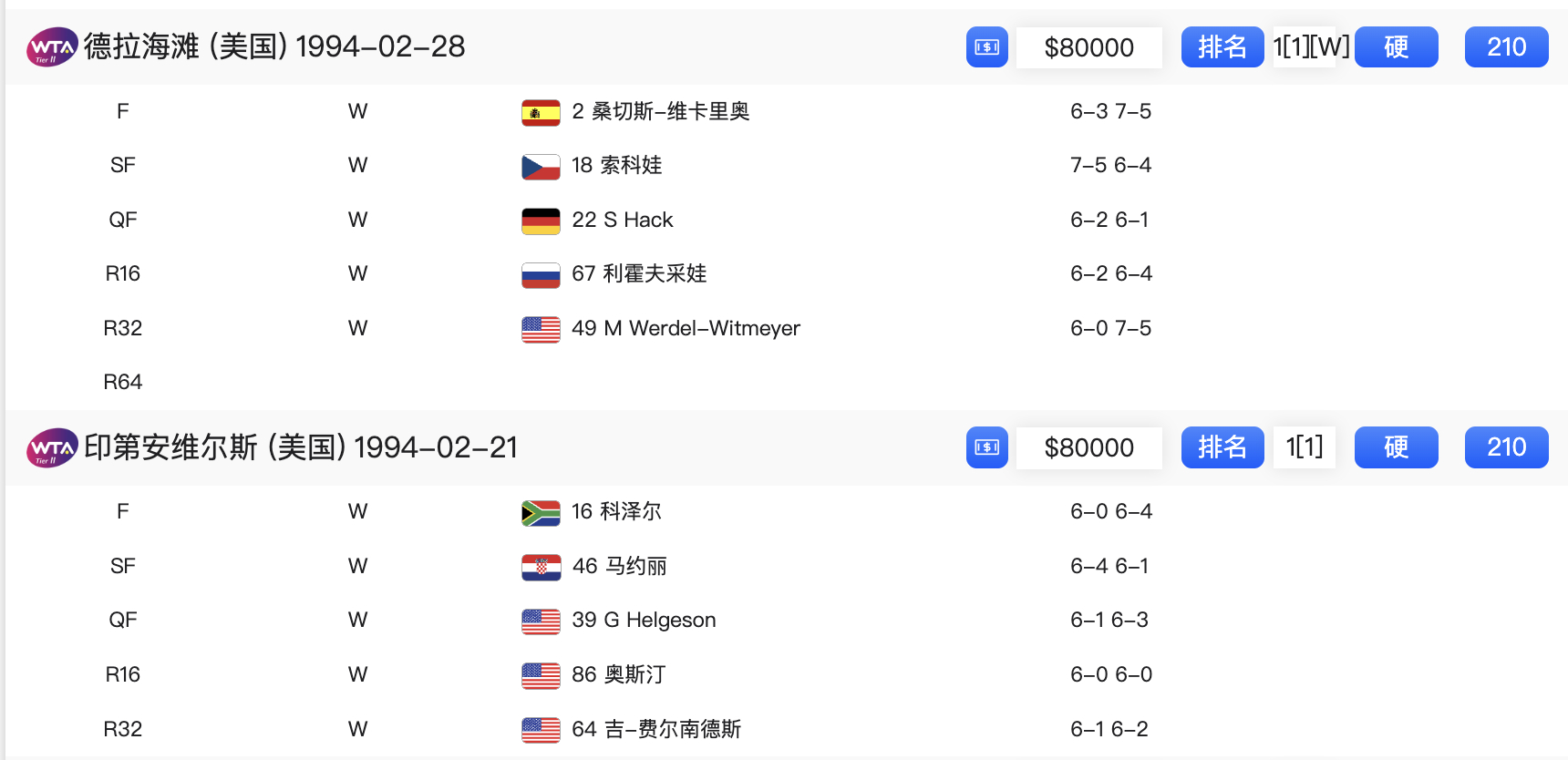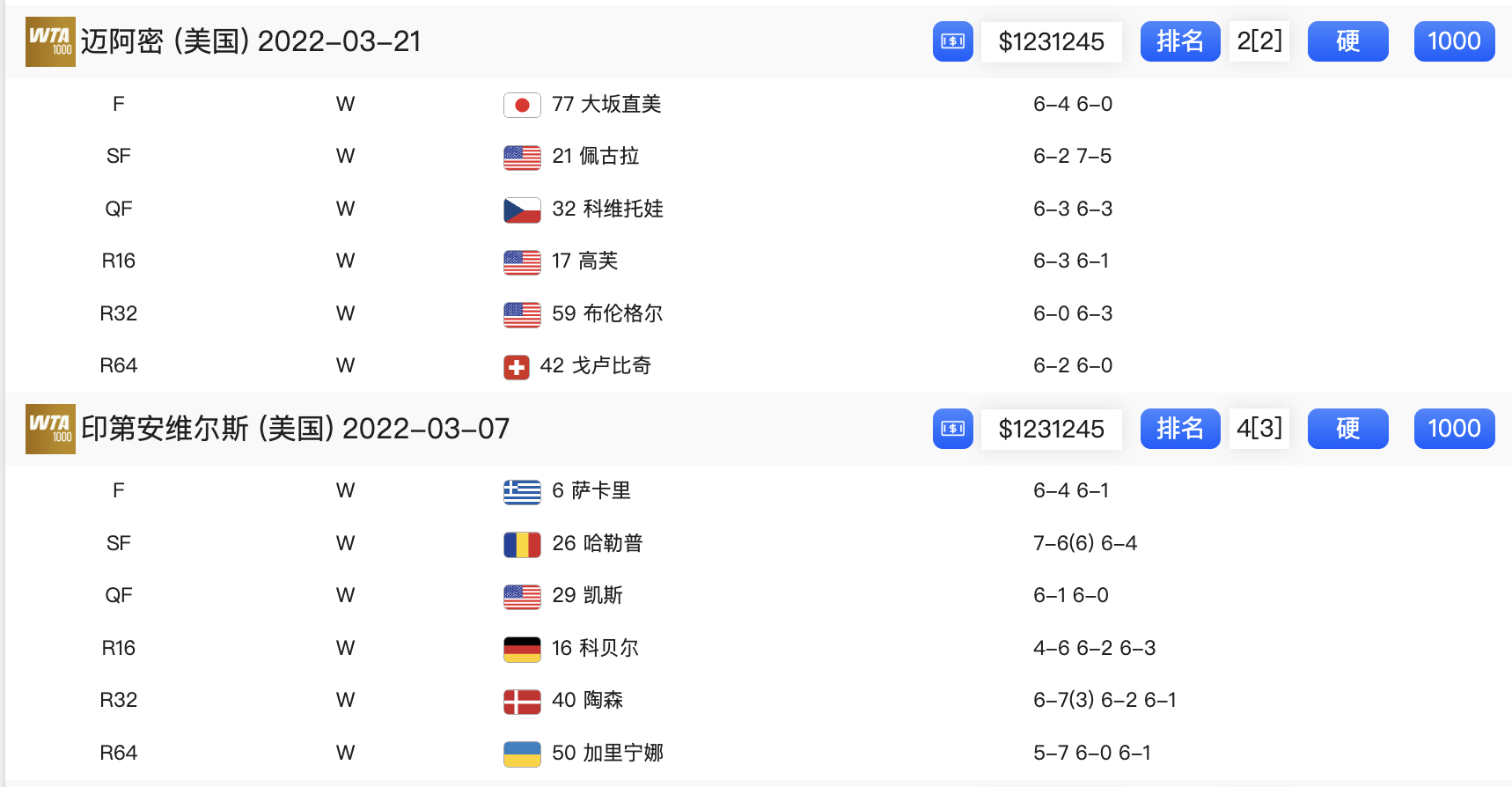 萨巴伦卡:2026斯瓦泰克:2022阿扎伦卡:2016(3胜世界前五)克里斯特尔斯:2005(作为非种子14连胜)格拉芙:1994(未丢一盘),1996(仅丢一盘)