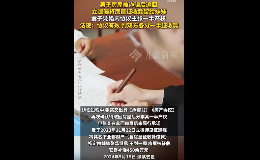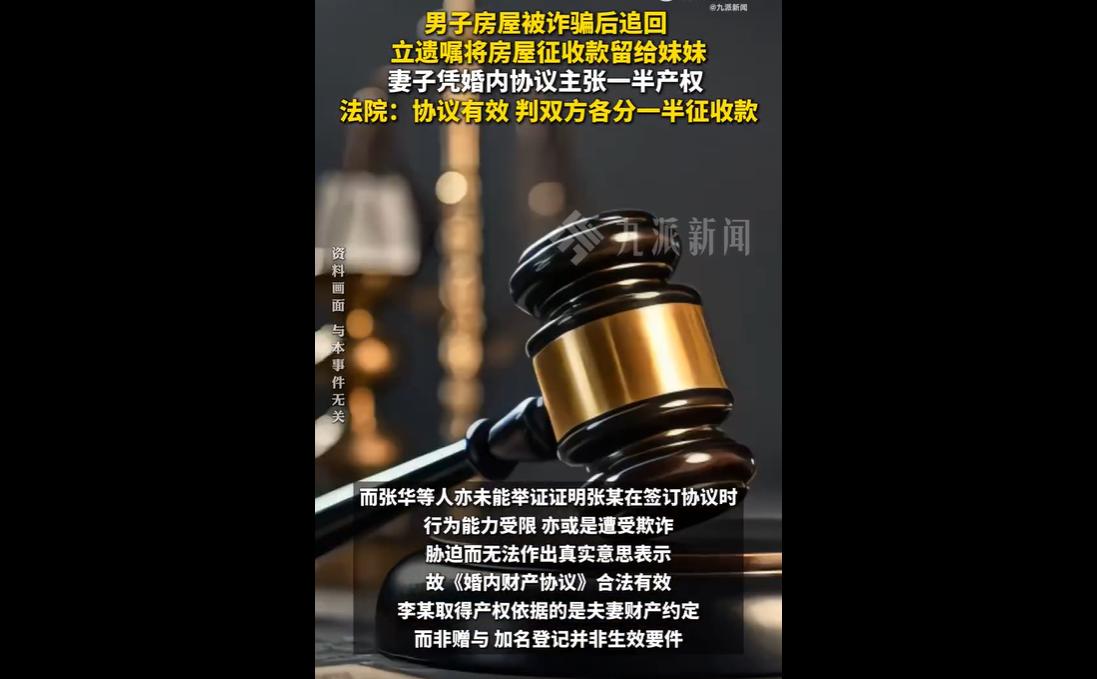 张某与李某系再婚夫妻,张某婚前拆迁所得房屋曾被诈骗过户,维权期间与李某签订婚内财产协议,约定房屋各占50%并多次承诺。 张某拿回房屋后立遗嘱将财产指定妹妹张华继承,房屋征收获450余万元补偿,张某去世后李某起诉,法院一、二审均判决李某与张华各分一半补偿款。 梳理整个事件脉络,双方的争议焦点清晰明确:李某主张依据婚内财产协议和张某的多次承诺,享有房屋一半产权,应分得一半征收补偿款;而张某的亲属则认为,签约时房屋尚在他人名下,协议无效,且未办理加名登记,赠与未完成,应按遗嘱执行,全部补偿款归张华所有。两种主张各有依据,也折射出婚姻中财产约定的复杂性。 首先,我们可以理解李某的诉求。 作为再婚夫妻,婚后家庭开销主要由李某承担,在张某遭遇房屋诈骗、陷入维权困境时,李某不仅出资,更出力协助维权,这份付出值得肯定。 张某在维权期间与李某签订婚内财产协议,明确约定房屋各占50%,后续又出具承诺书、房产协议再次确认,这些行为都是双方真实意思的表示,也体现了张某对李某付出的认可与回馈。李某基于这份约定和承诺,主张自己的合法权益,于情于理都有依据。 其次,对于张某亲属的主张,我们也应理性看待。 他们认为签约时房屋尚在曹某名下,张某无权处分该房屋,因此婚内财产协议无效,这一观点有一定的法律考量。 毕竟,当时房屋的产权尚未恢复至张某名下,张某确实暂不具备完整的处分权。 同时,房屋未办理加名登记,从物权变动的角度来看,赠与行为未完全完成,这也成为他们主张遗嘱优先的重要理由。 而张某立遗嘱将财产指定妹妹继承,也是其生前对自身财产的处分意愿,理应得到尊重。 法院一、二审均判决李某与张华各分得一半征收补偿款,这份判决既兼顾了法律规定,也考量了人情事理,较为合理。 一方面,婚内财产协议是张某与李某的真实意思表示,李某在婚姻中付出了较多心血,理应获得相应的权益;另一方面,张某的遗嘱也体现了其对亲属的意愿,且房屋本身系张某婚前财产,张华作为遗嘱指定继承人,也应享有相应份额。判决既没有否定婚内协议的效力,也没有完全忽视遗嘱的意愿,实现了法理与情理的平衡。 这起案件也给我们带来了诸多启示。对于再婚夫妻而言,婚姻中的财产约定尤为重要,明确的财产协议不仅能避免后续的纠纷,也能体现双方的信任与担当。 签订财产协议时,应确保双方自愿、意思表示真实,同时兼顾财产的合法处分权,必要时可咨询专业法律人士,避免出现协议无效或效力争议的情况。 婚姻中的财产纠纷,从来都不是简单的“非此即彼”,而是需要在法律框架下,兼顾情理与公平。