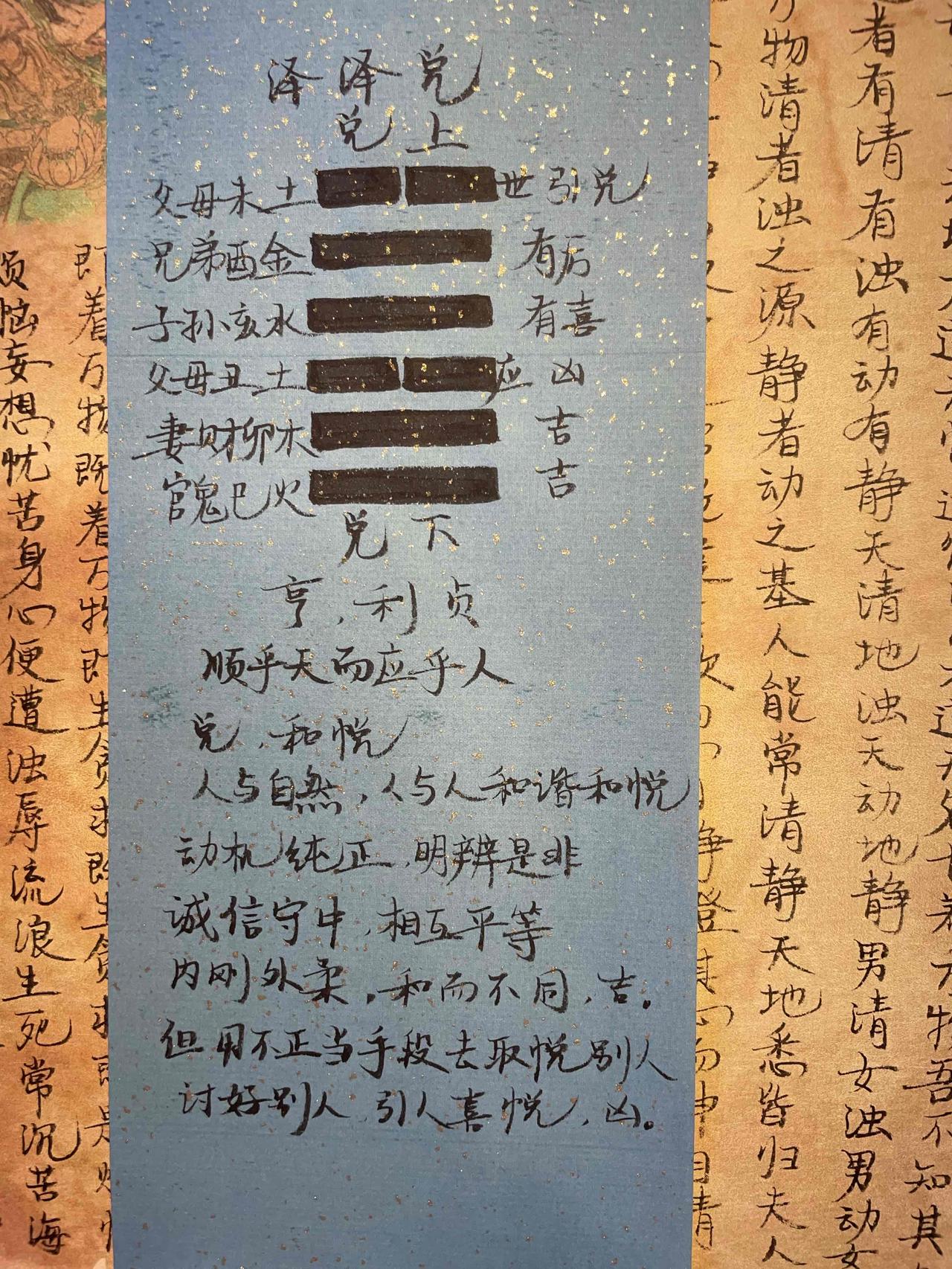 58泽泽兑 亨,利贞。 初九,和兑,吉。 九二,孚兑,吉,悔亡。 六三,来兑,凶。 九四,商兑,未宁,介疾有喜。 九五,孚于剥,有厉。 上六,引兑。 兑卦,两兑相叠,雨泽相连。和悦之意。阳刚爻居中,阴柔爻在外,外柔内刚的形象。使人喜悦,亨通。 动机纯正,坚守正道,才会有利。与自然和谐共处,与人为善和悦。和悦也要明辨是非,诚信守正,相互平等,内刚外柔,坚持原则,和而不同。顺乎天而应乎人。自然吉利。 如果用不当手段去引诱别人,讨好别人,引人喜悦,目的不纯自然凶险。 易学智慧 兑卦 写字是一种生活 国学文化 传统文化
