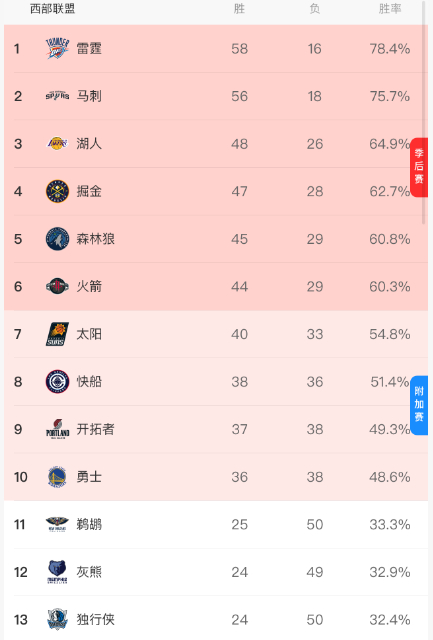 东西部前十的球队全部出炉:东部:活塞、凯尔特人、尼克斯、骑士、猛龙、老鹰、76人、魔术、热火、黄蜂;西部:雷霆、马刺、湖人、掘金、森林狼、火箭、太阳、快船、开拓者、勇士。