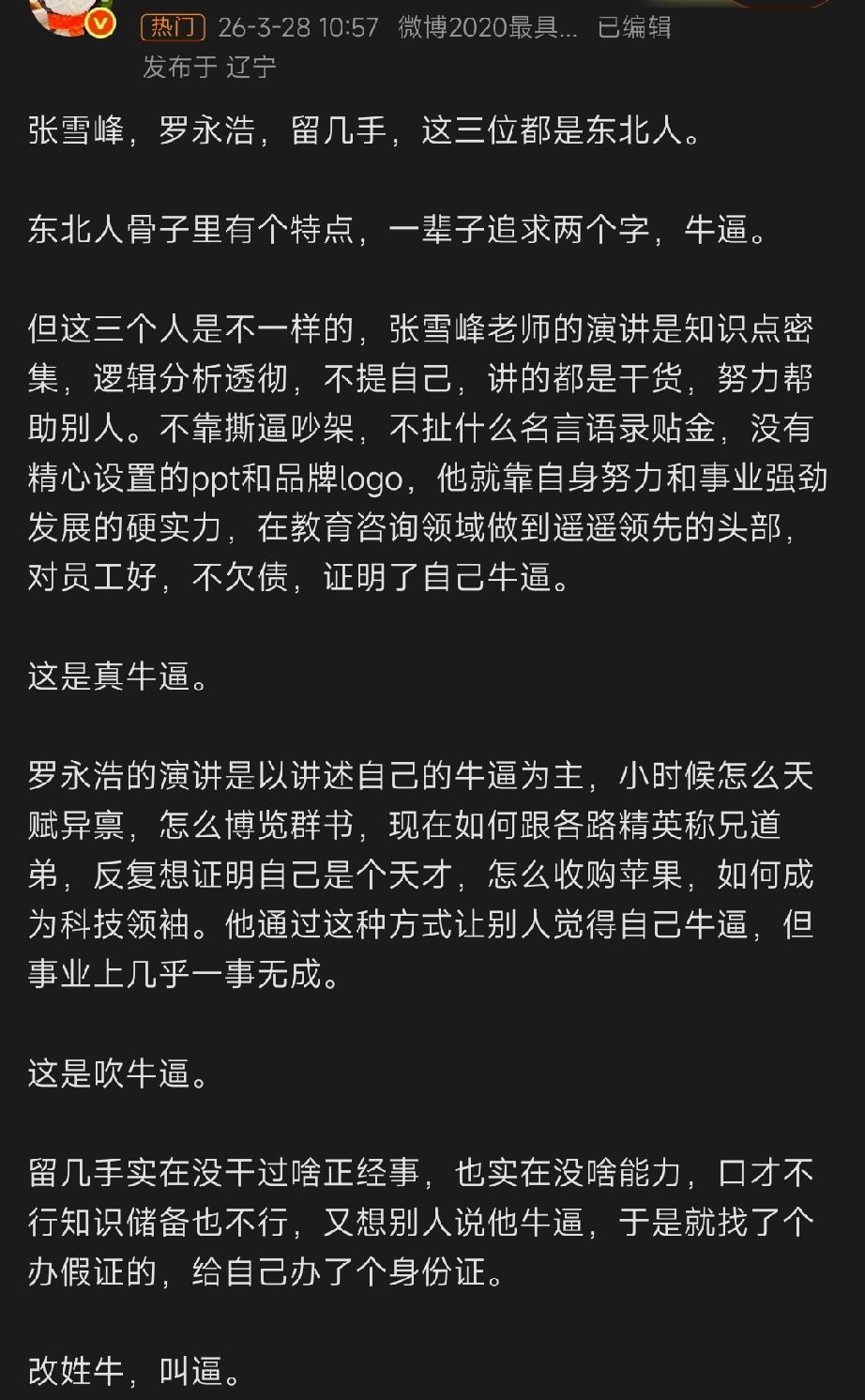 不愧是最具影响力的大v博主,对张雪峰,罗永浩,留几手三位东北网红的点评精辟到位。 张雪峰,真牛逼[赞] 演讲有干货,在成人教育领域做到了🔝,对员工好,不欠工资不拖工资,从中层到底层几乎无差评。 罗永浩,吹牛逼 演讲喜欢假大空,吹嘘自己多天才,可是事业一塌糊涂,还欠(老总的)账不还,天天在网上靠蹭新东方和俞敏洪的热度卖货。 大概是因为,在新东方那些年,是他事业上唯一还算成功的几年吧。[捂脸] 留几手,啥也不是。 没啥事业,没啥才华,天天靠在网上蹭热度为生。上完再见爱人后觉得自己也算娱乐圈的名人了,开始飘的不知天高地厚。 张雪峰和这两位相提并论,属实有点委屈了。
